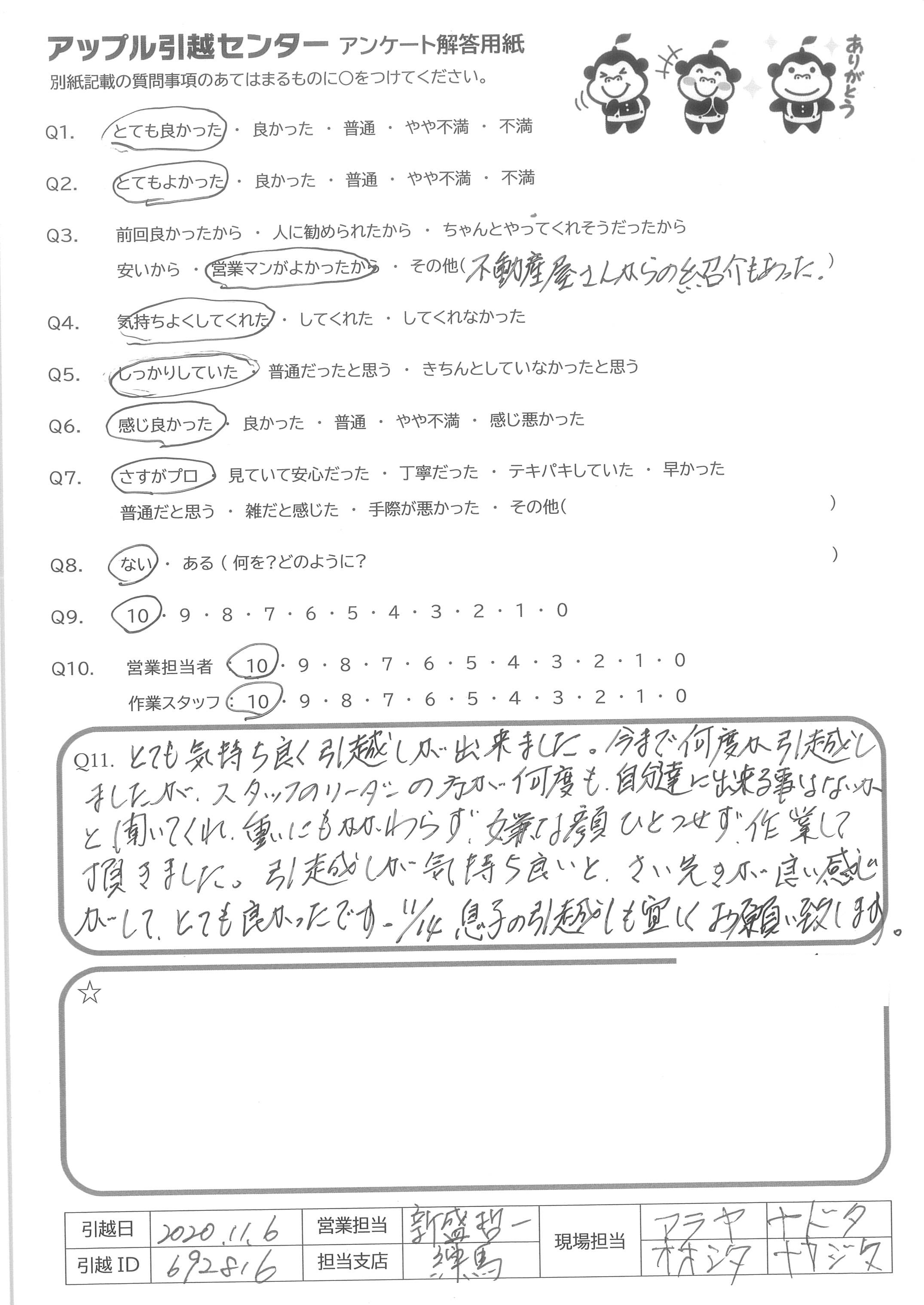A.とても気持ち良く引越しが出来ました。今まで何度か引越しましたが、スタッフのリーダーの方が何度も、自分達に出来る事はないかと聞いてくれ、重いにもかかわらず、嫌な顔ひとつせず、作業して頂きました。引越しが気持ち良いと、さい先きが良い感じがして、とても良かったです。11/14息子の引越しもよろしくお願い致します。