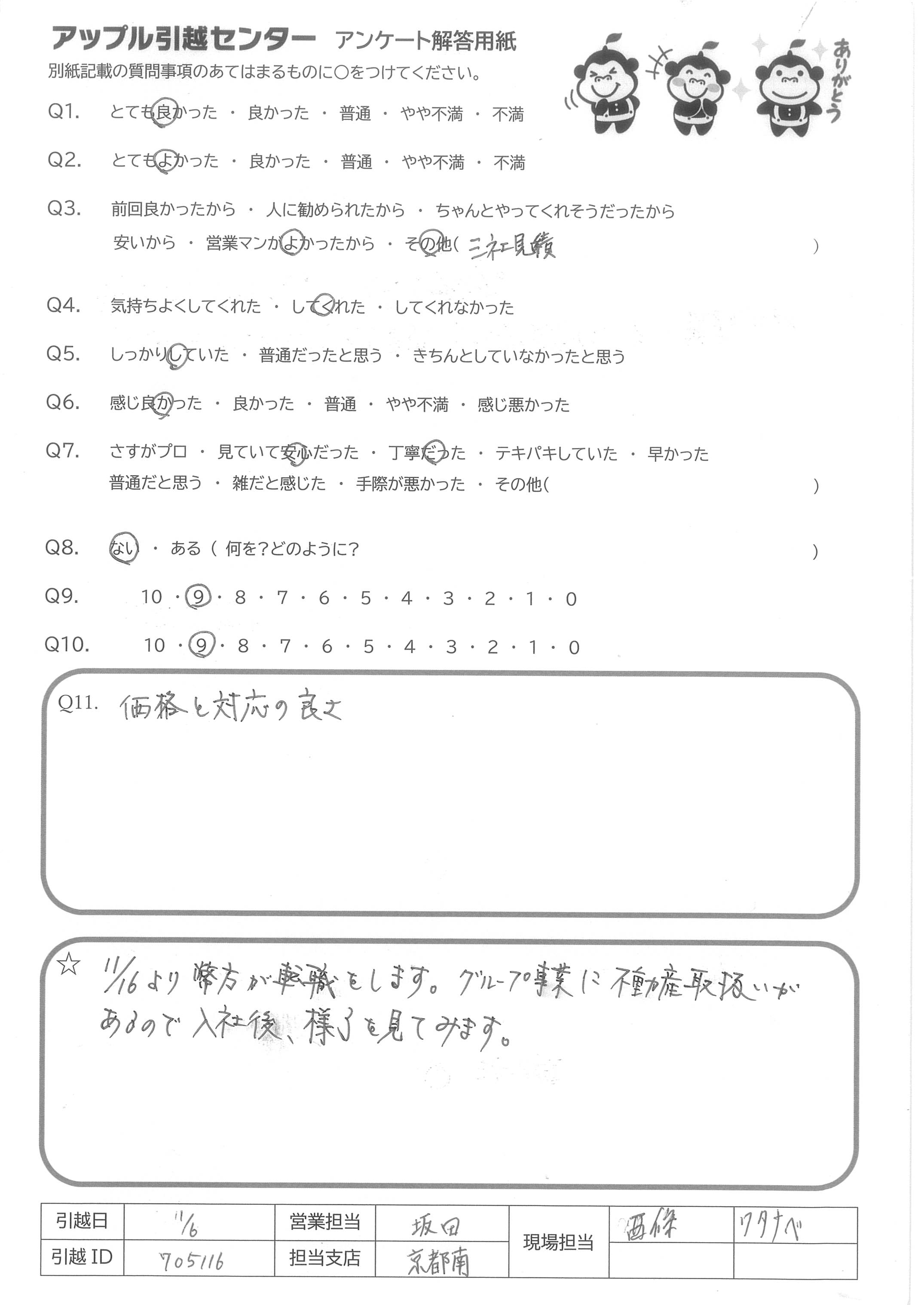 A.丁寧でしたし、見積もりの方も引っ越しの方も同じ九州出身だったので嬉しかったから。