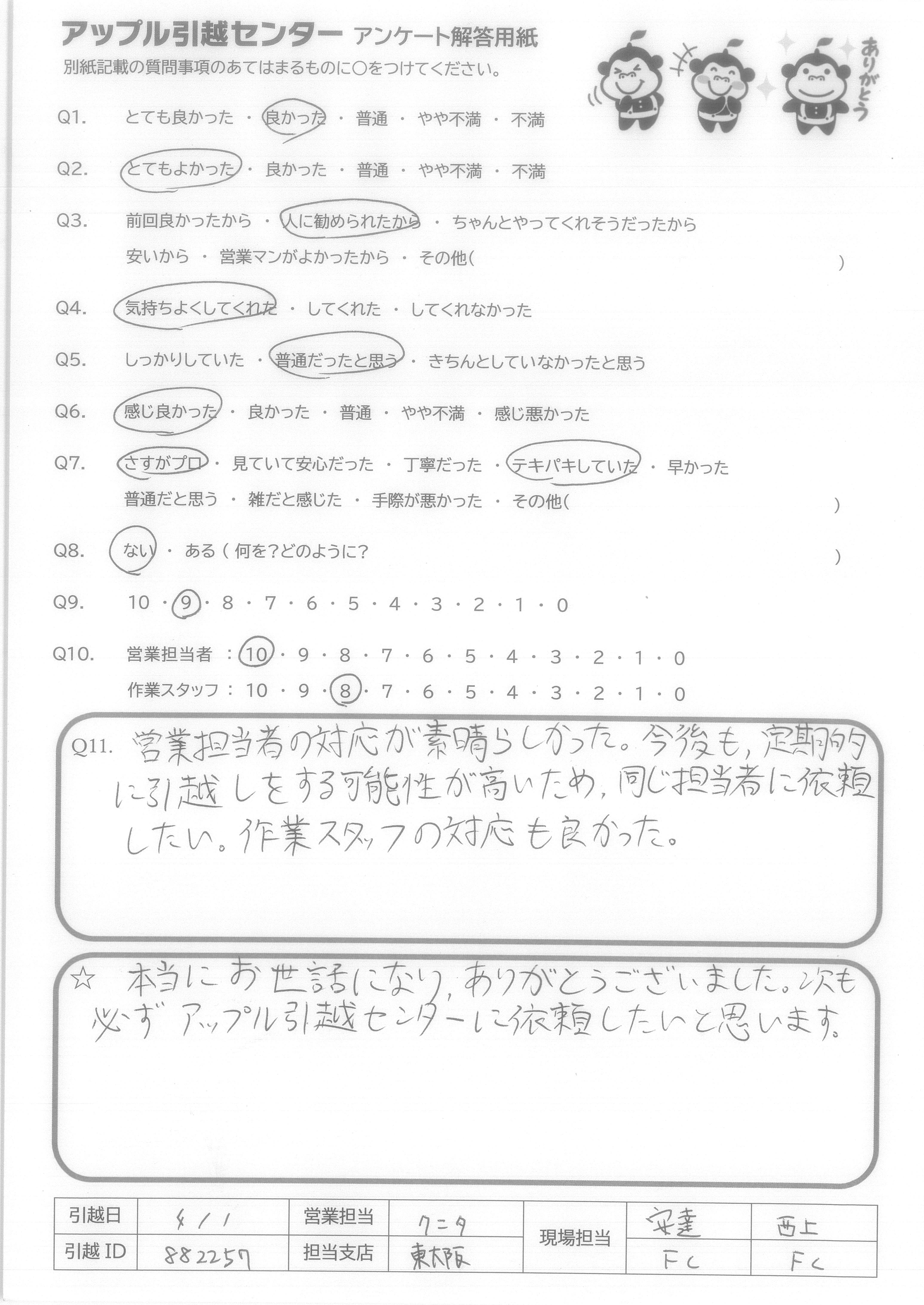 A.本当にお世話になり、ありがとうございました。次も必ずアップル引越センターに依頼したいと思います。