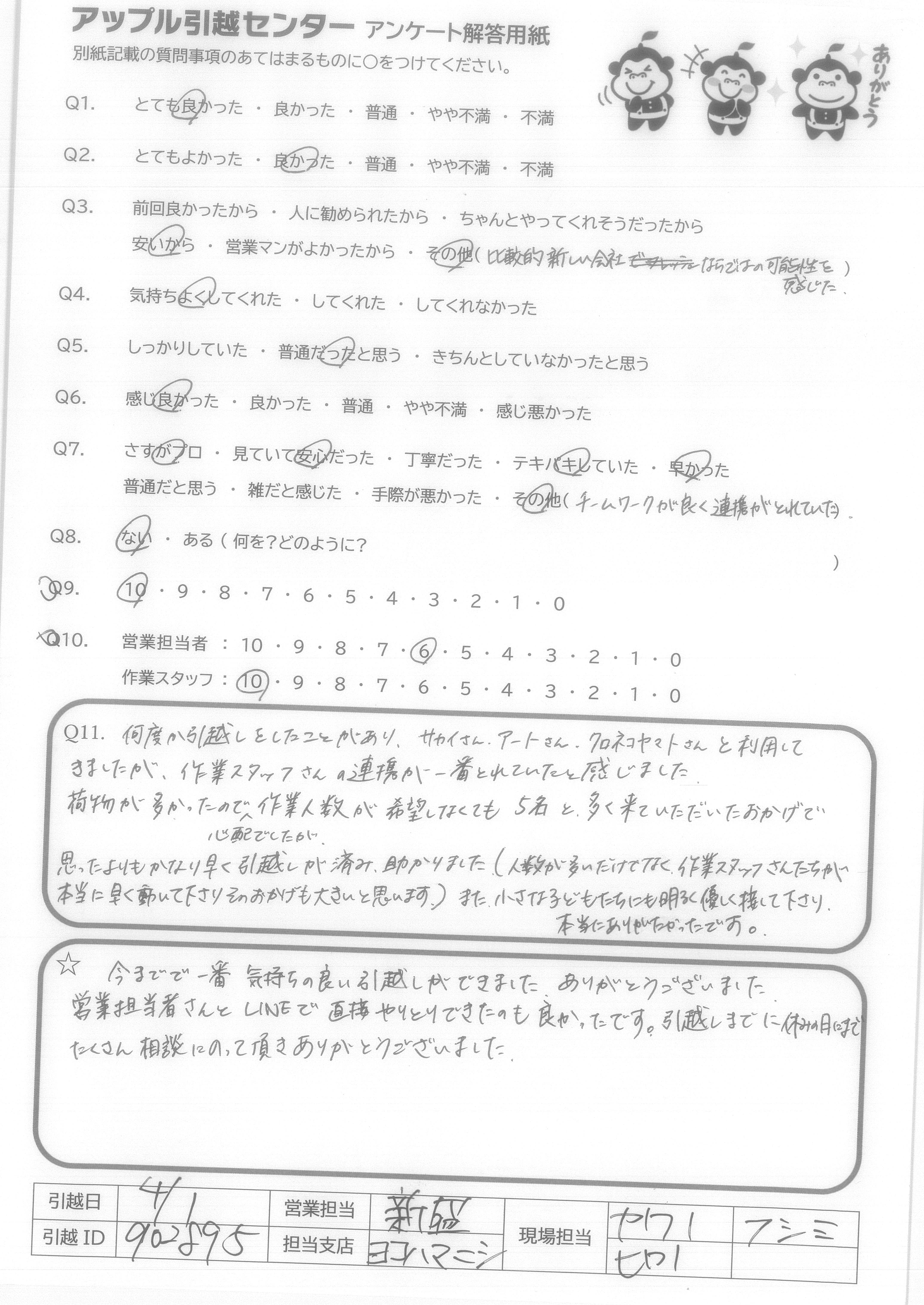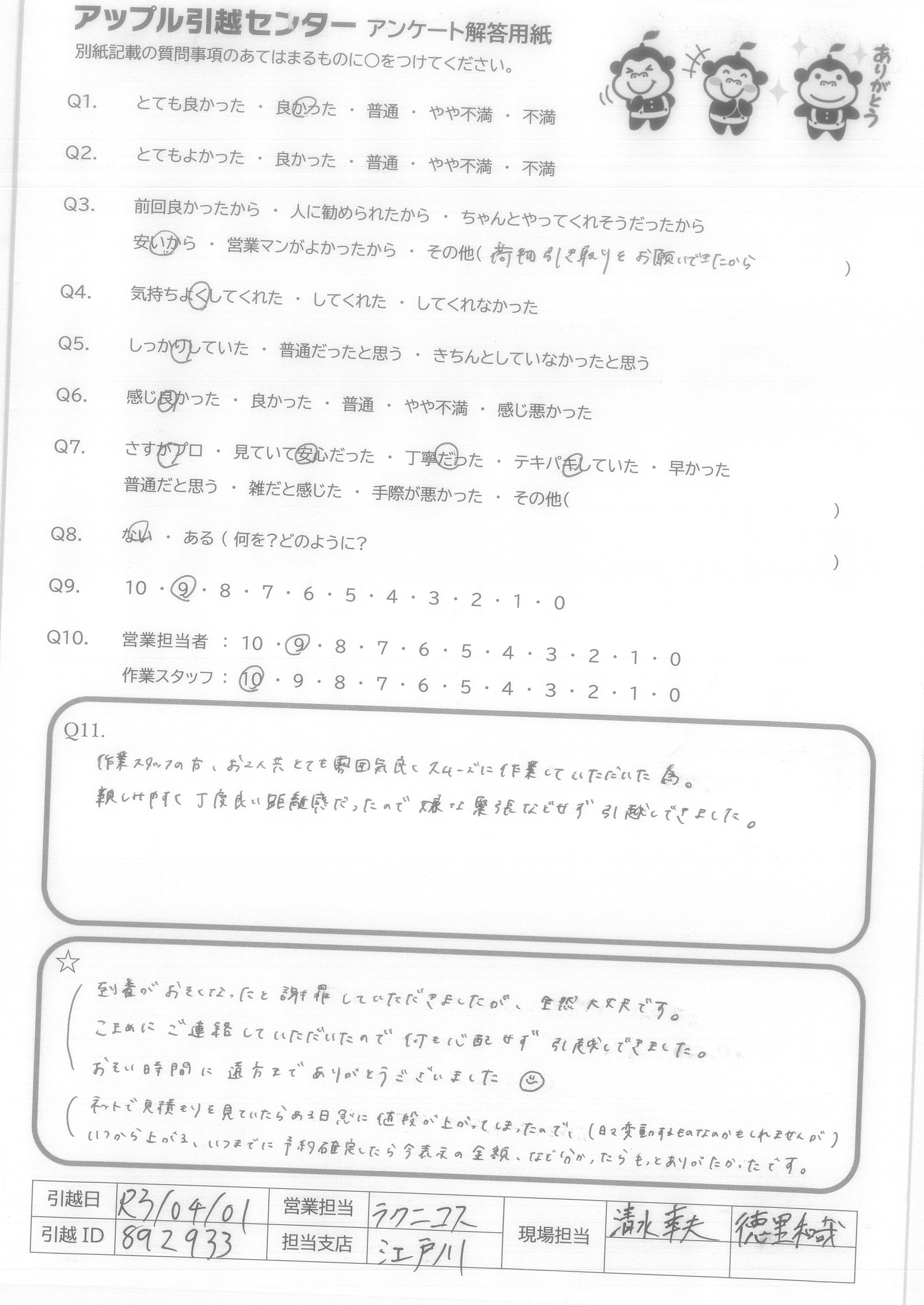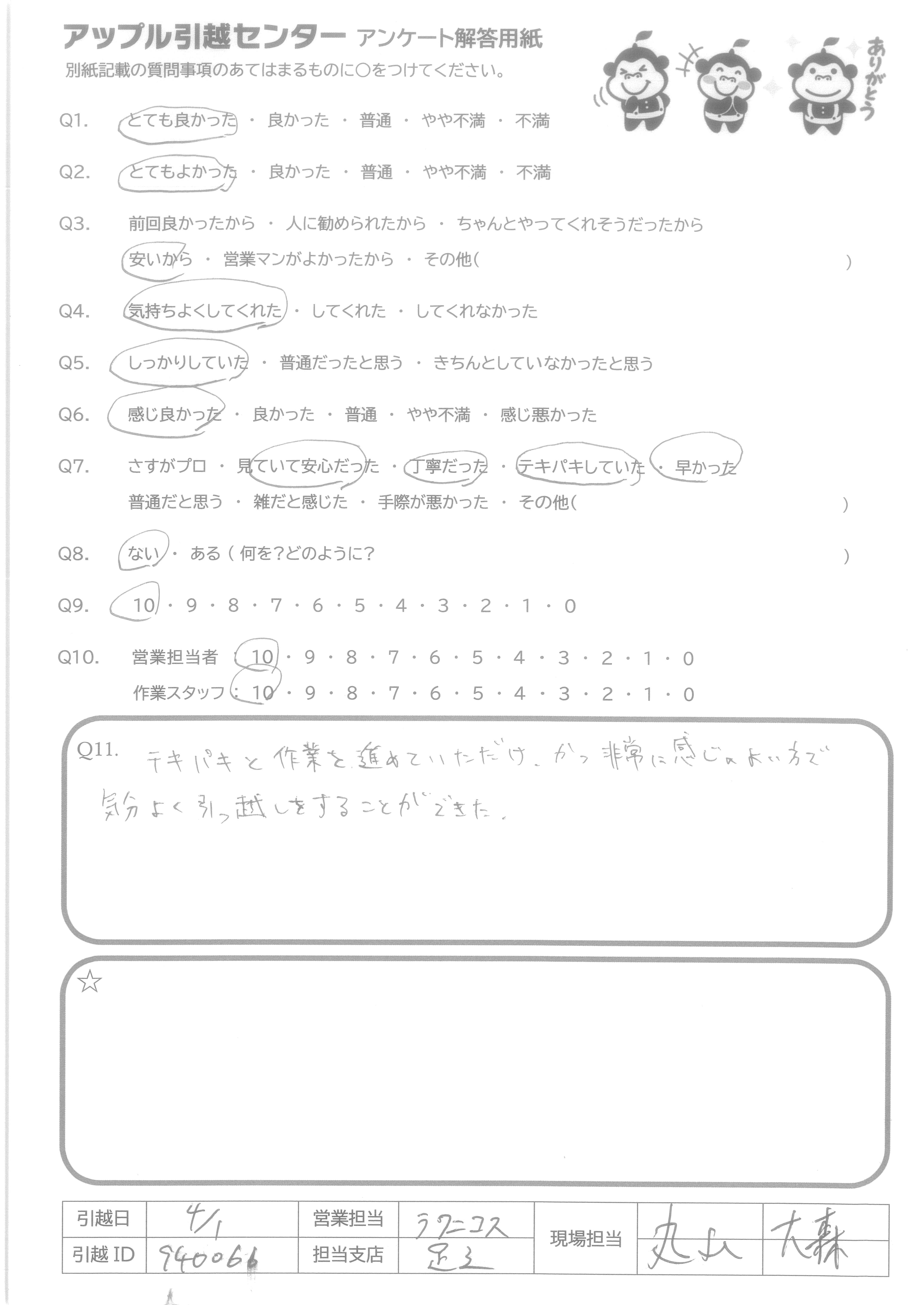 A.テキパキと作業を進めていただけ、かつ非常に感じのよい方で気分よく引っ越しをすることができた。