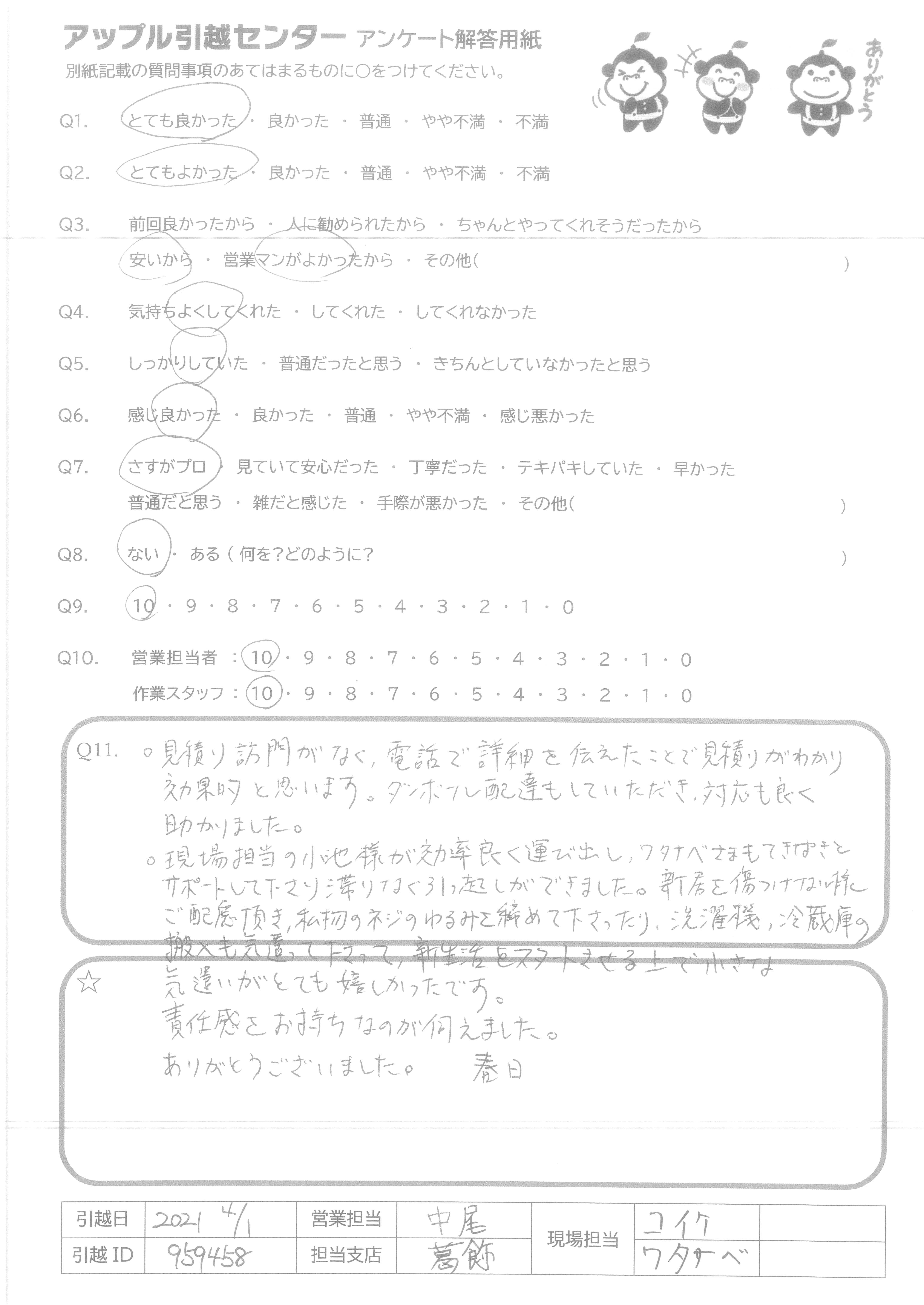 A.他社は、価格の確認のみでしたが、アップルさんは、引越の経緯をうかがってくださり、とても感じがよかったです。繁忙期にもかかわらず、低価格で最初から提示して頂き、さらには検討するお時間も頂けました。 他社はネガティブなことばかりでしたが、アップルさんは一切ありませんでした。
