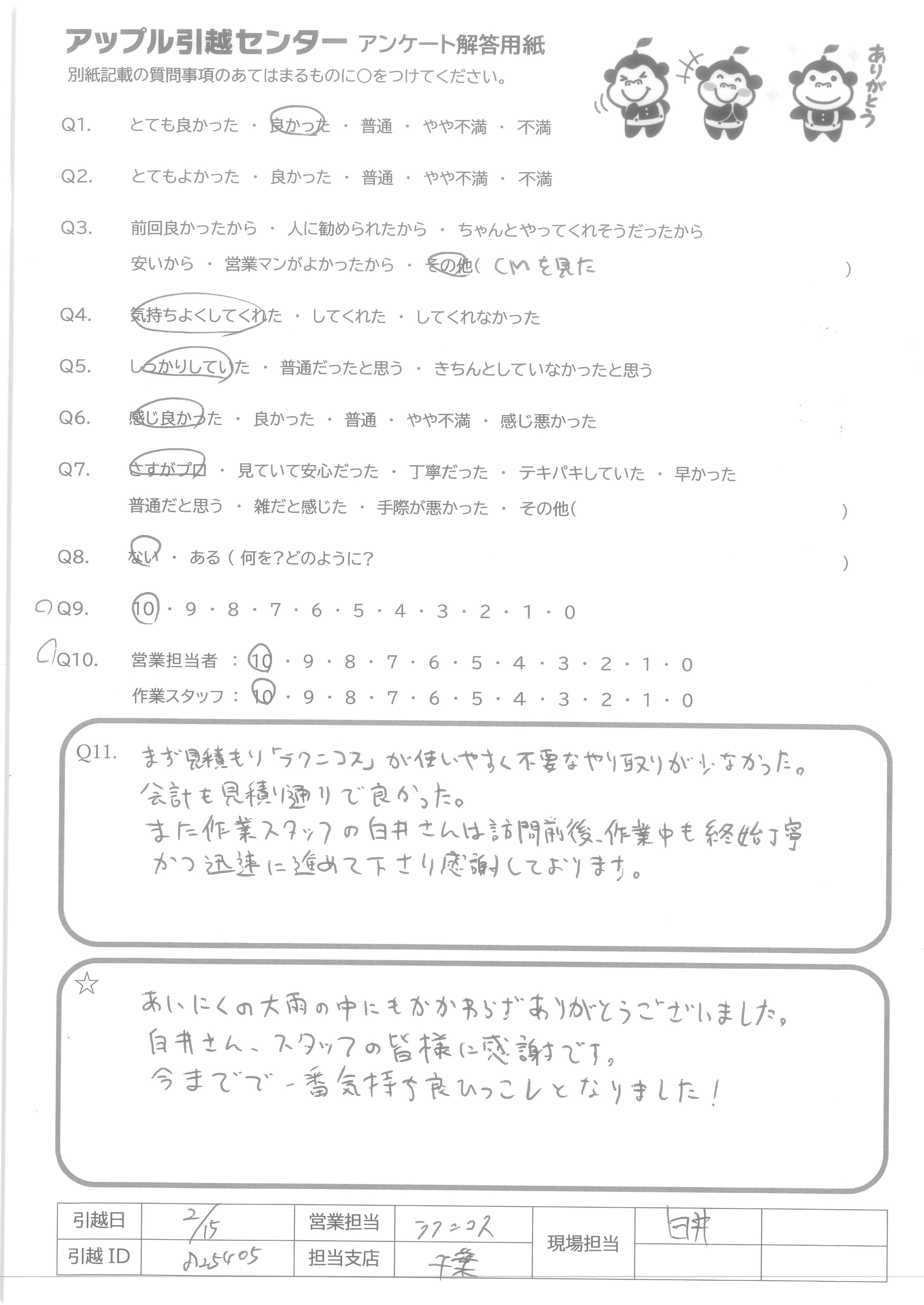 A.あいにくの大雨の中にもかかわらずありがとうございました。白井さん、スタッフの皆様に感謝です。 今までで一番気持ち良いひっこしとなりました!
