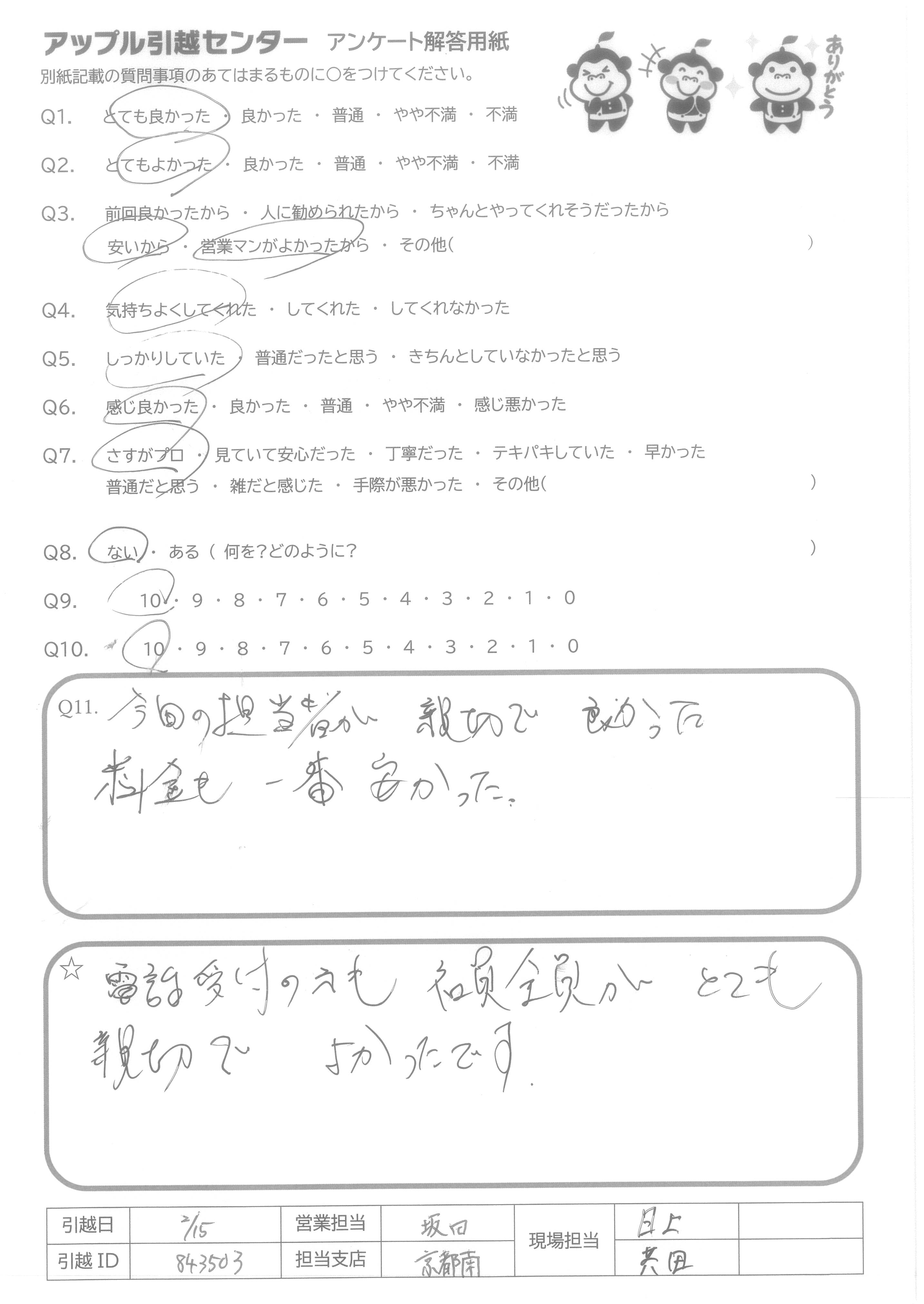 A.総合的には良かったと思います。また引っ越しの際にはお願いしたいと思う。