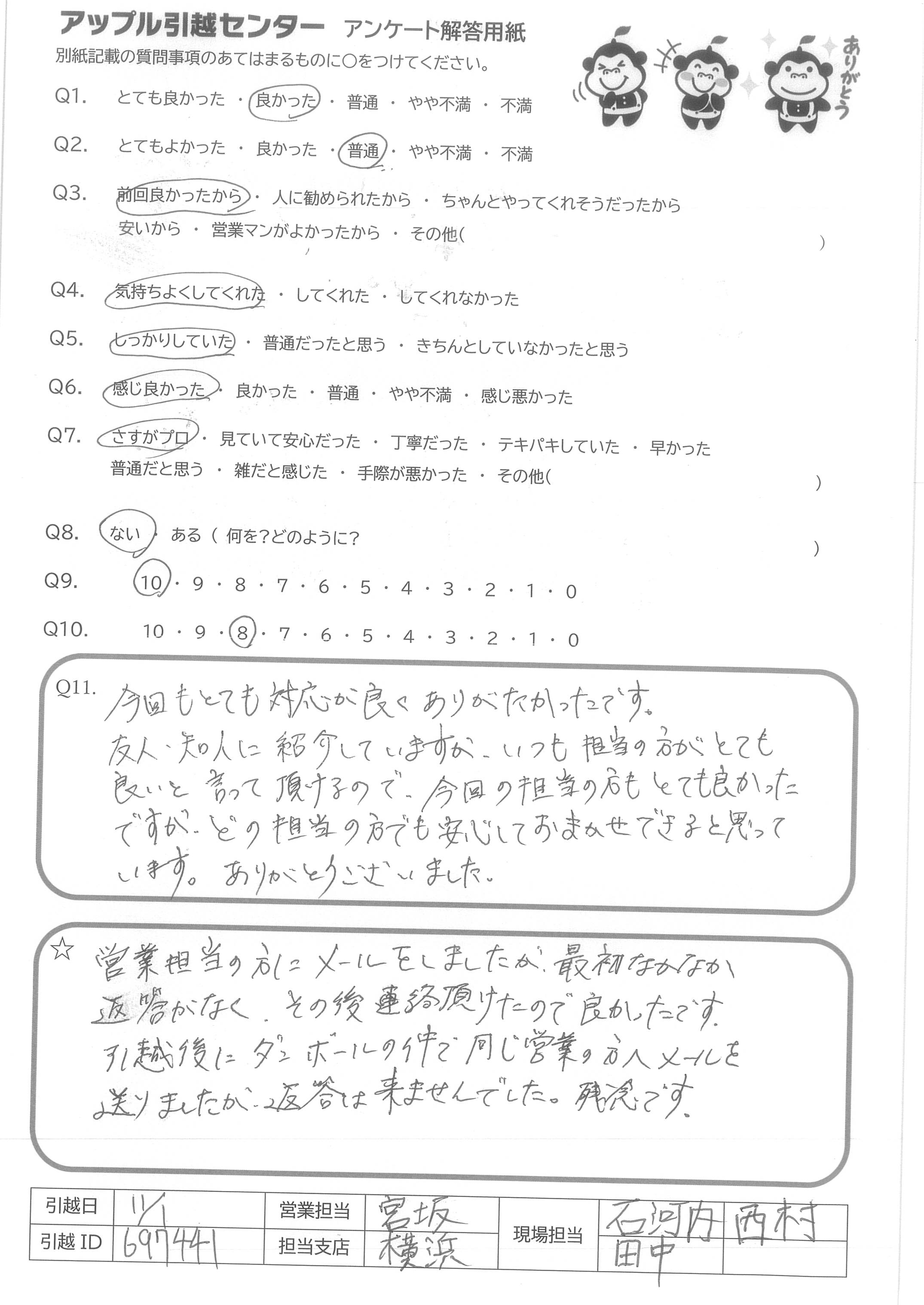 A.営業担当の方にメールをしましたが、最初なかなか 返答がなく、その後連絡頂けたので良かったです。 引越後にダンボールの件で同じ営業の方へメールを 送りましたが、返答は来ませんでした。残念です。