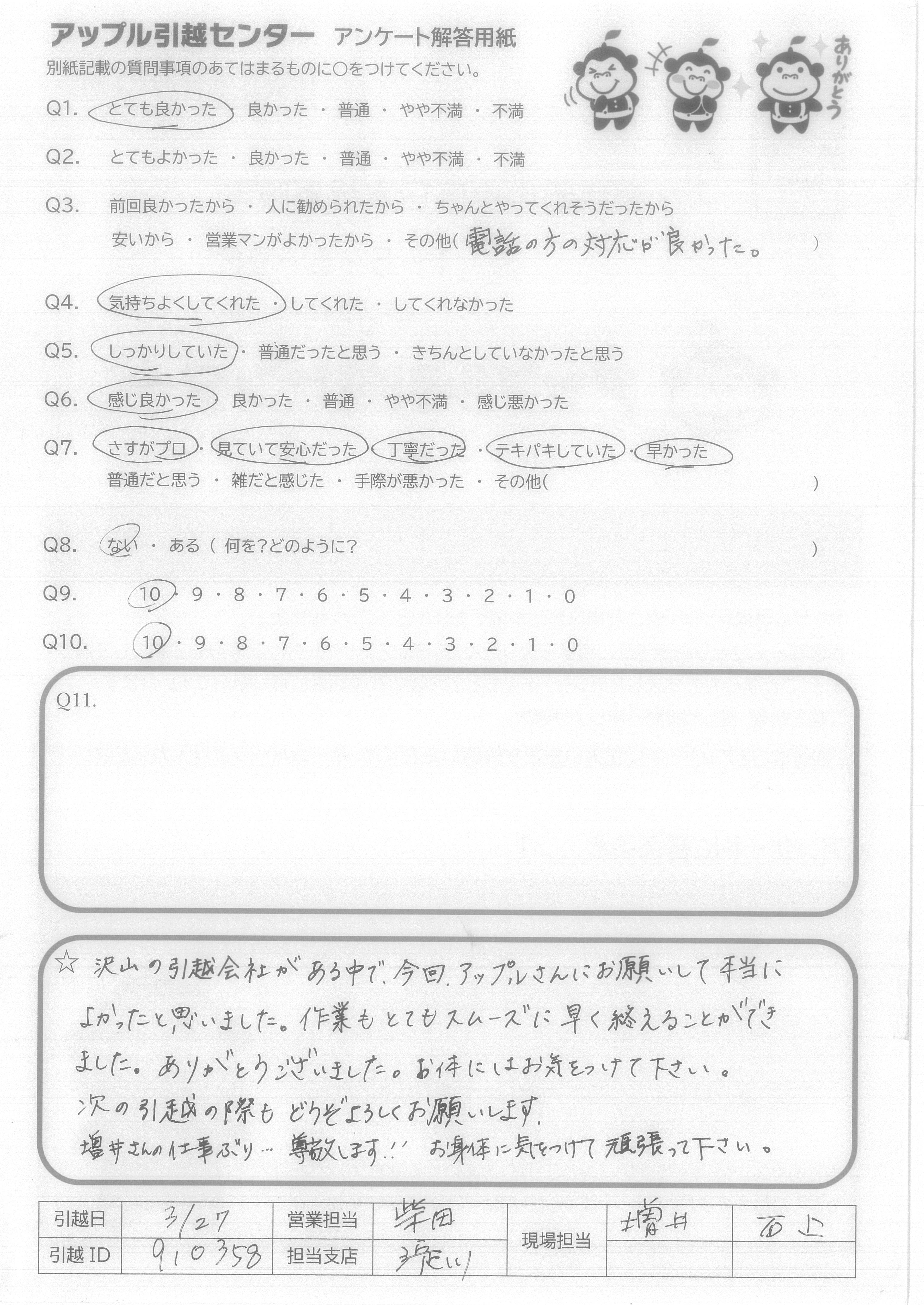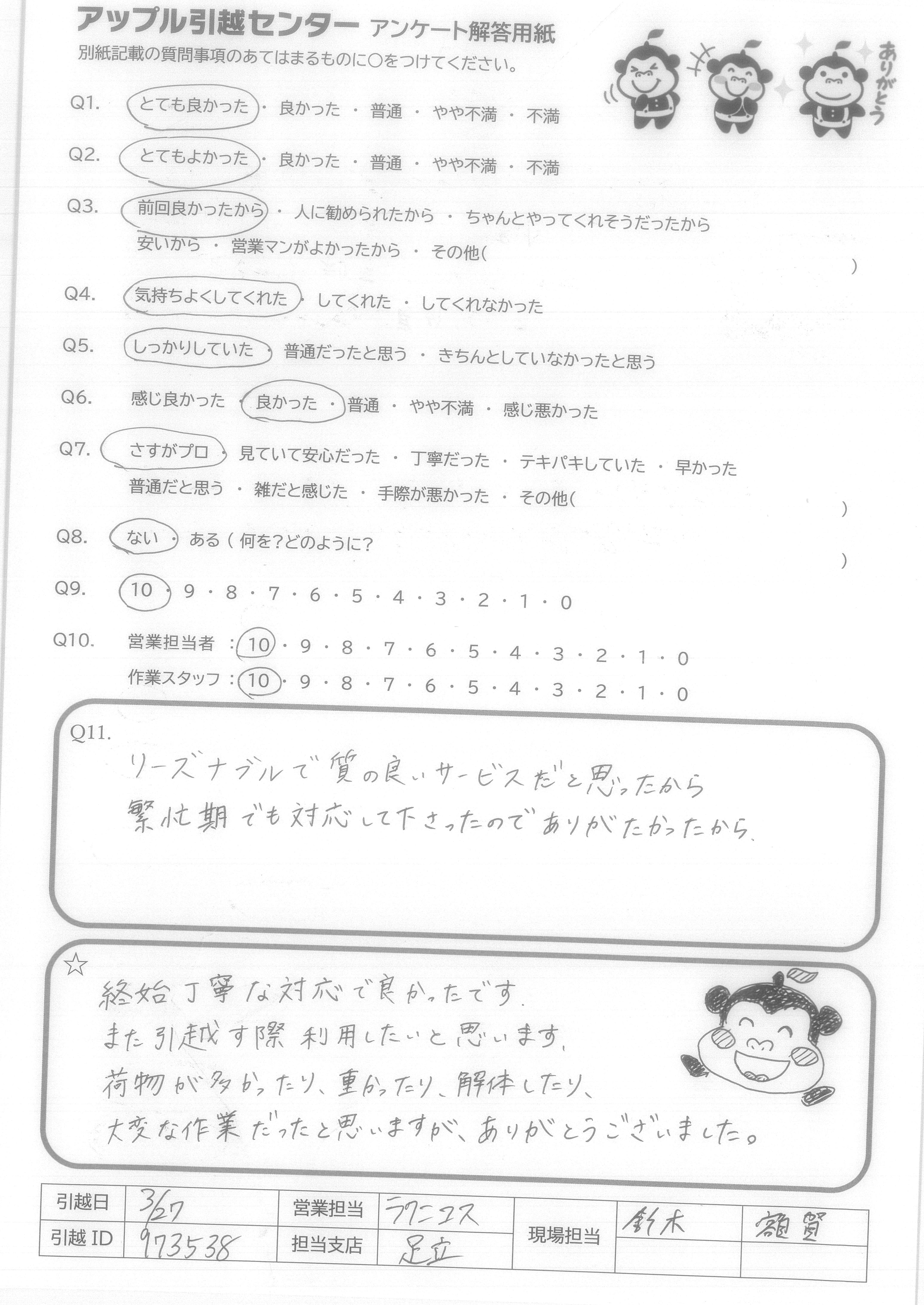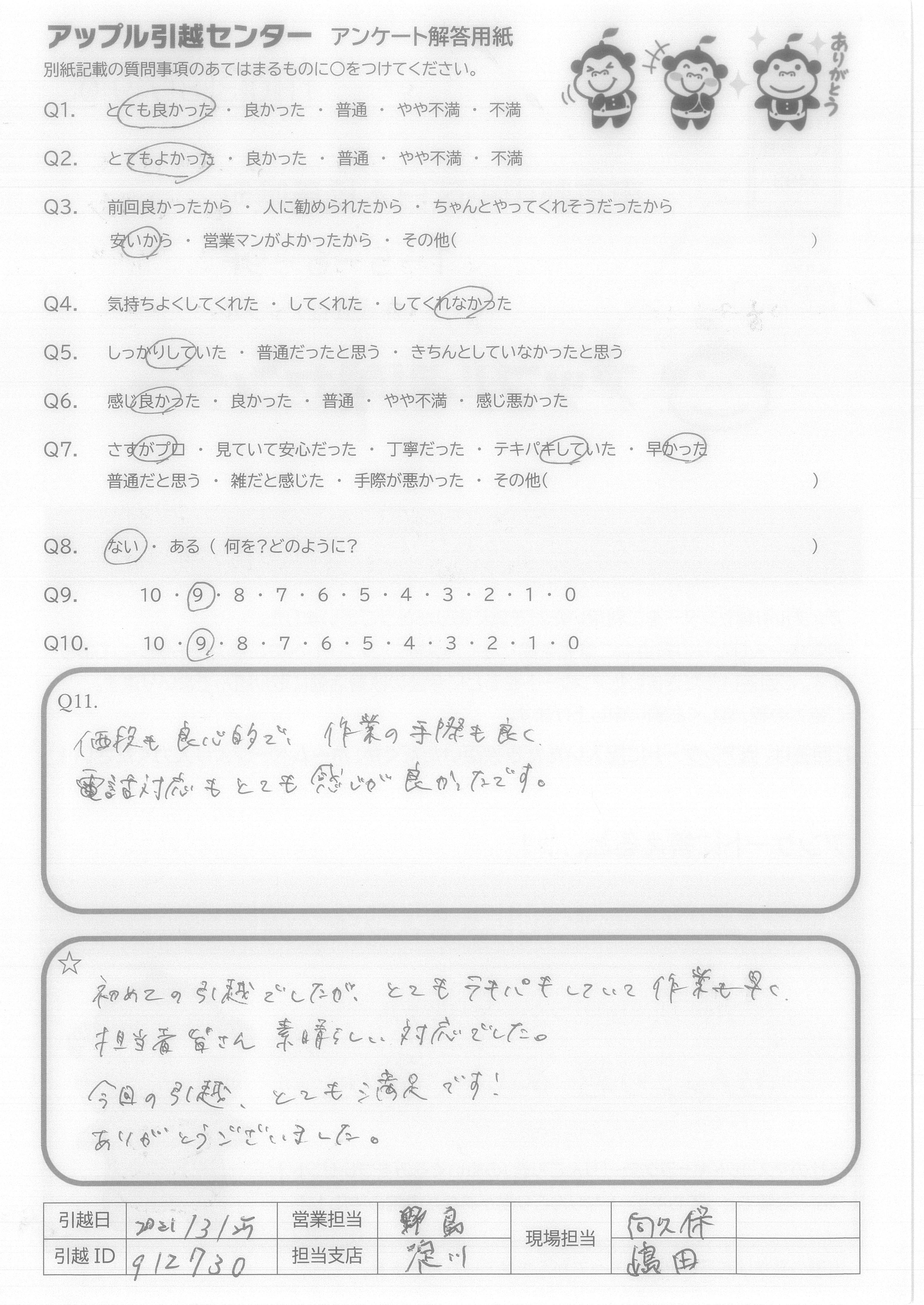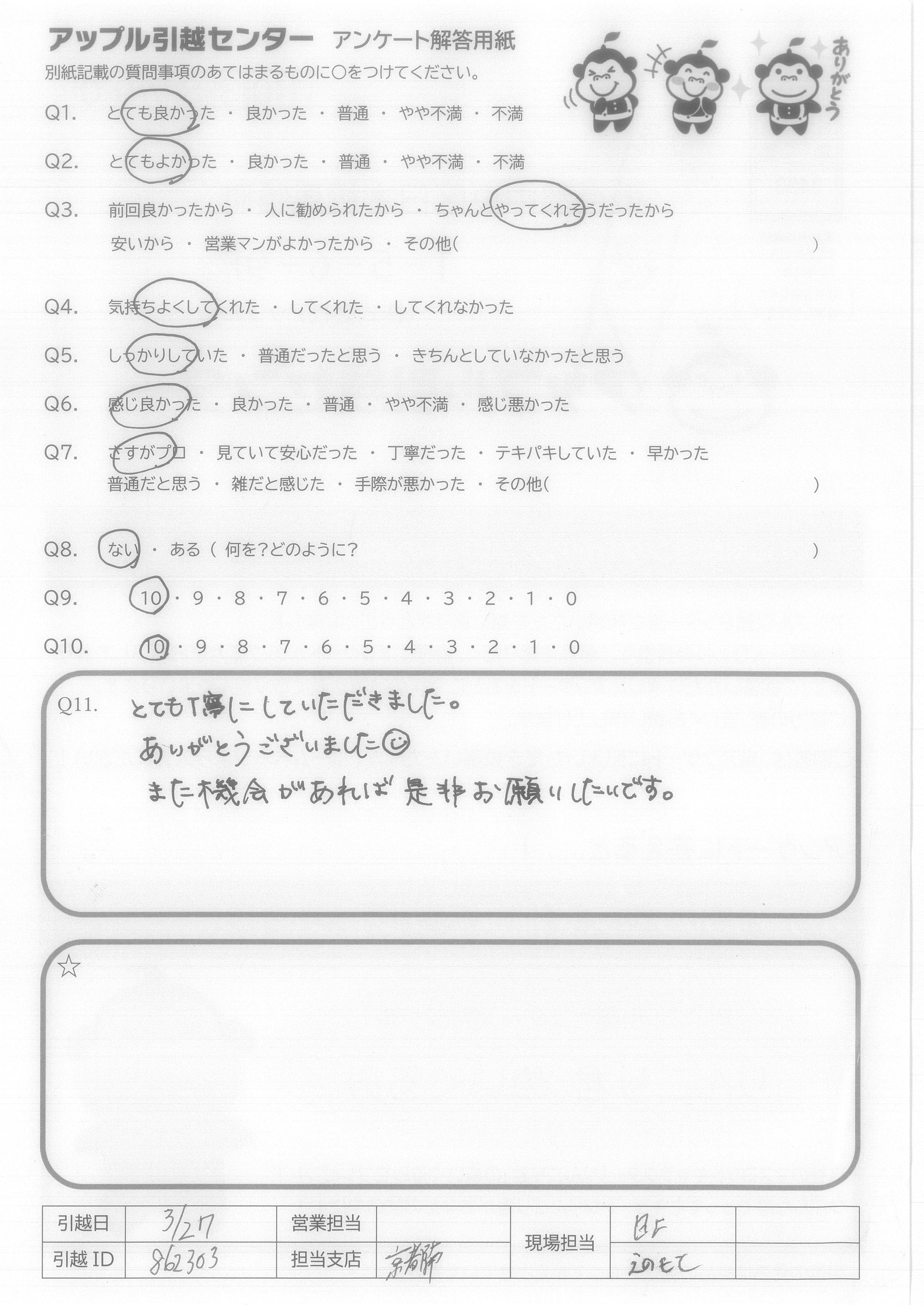 A.沢山の引越会社がある中で、今回、アップルさんにお願いして本当によかったと思いました。作業もとてもスムーズに早く終えることができました。ありがとうございました。お体にはお気を付けて下さい。 次の引越の際もどうぞよろしくお願いします。 増井さんの仕事ぶり・・・尊敬します!!お身体に気をつけて頑張って下さい。