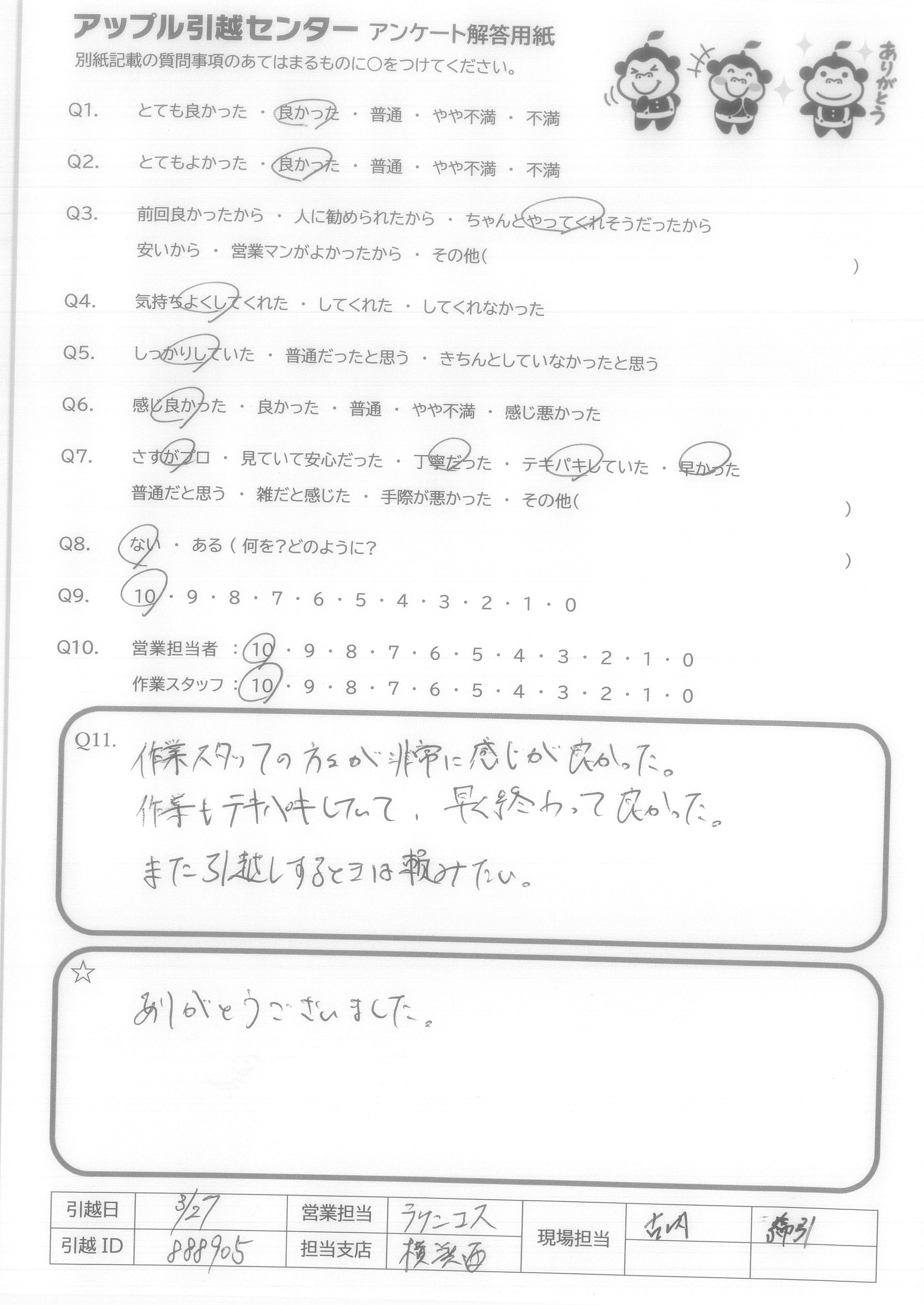 A.終始丁寧な対応でよかったです。 また引越す際利用したいと思います。荷物が多かったり、重かったり、解体したり、大変な作業だったと思いますが、ありがとうございました。