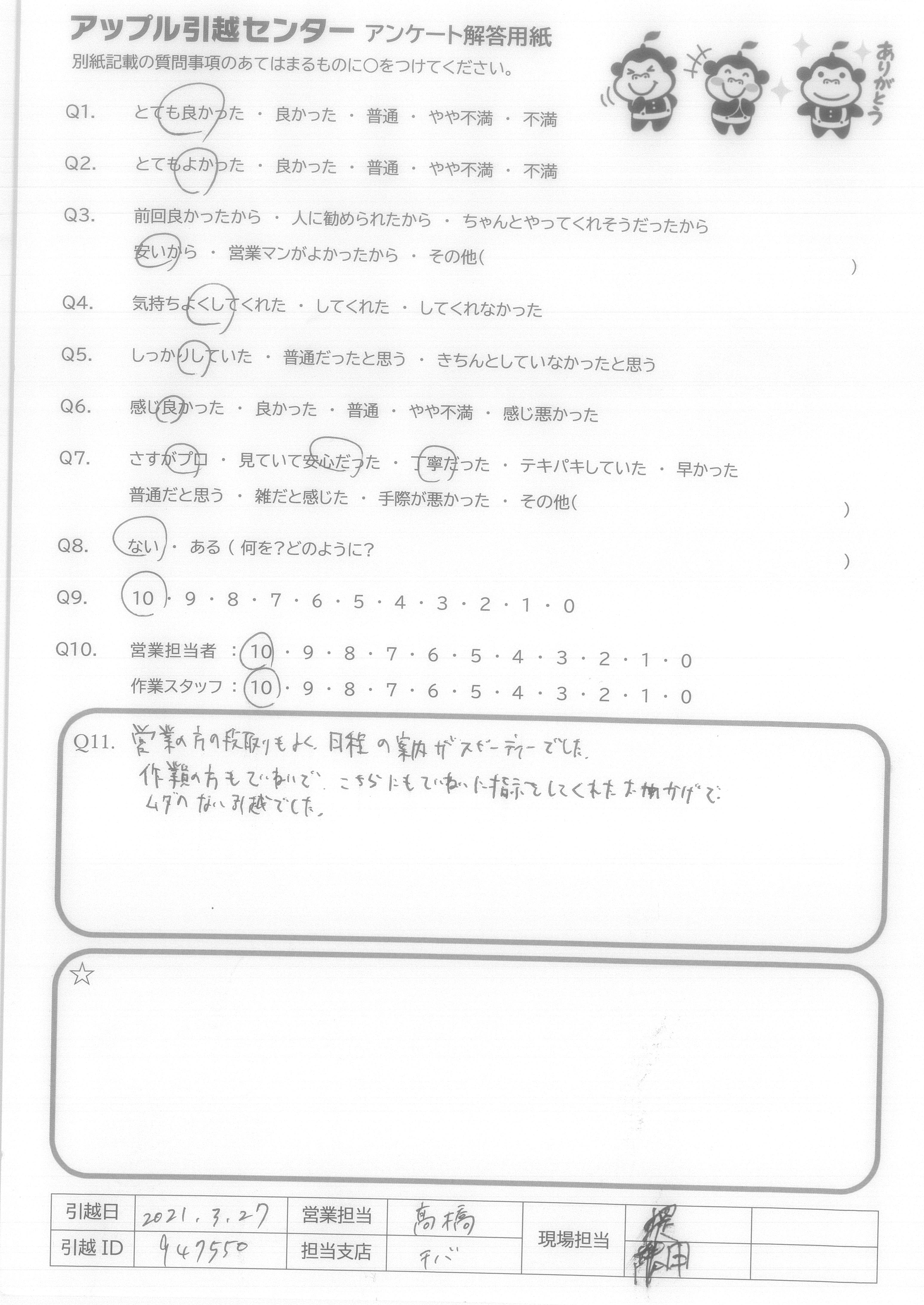 A.営業の方の挨拶もよく、日程の案内がスピーディーでした。 作業員の方もていねいで、こちらにもていねいに指示をしてくれたおかげでムダのない引越でした。
