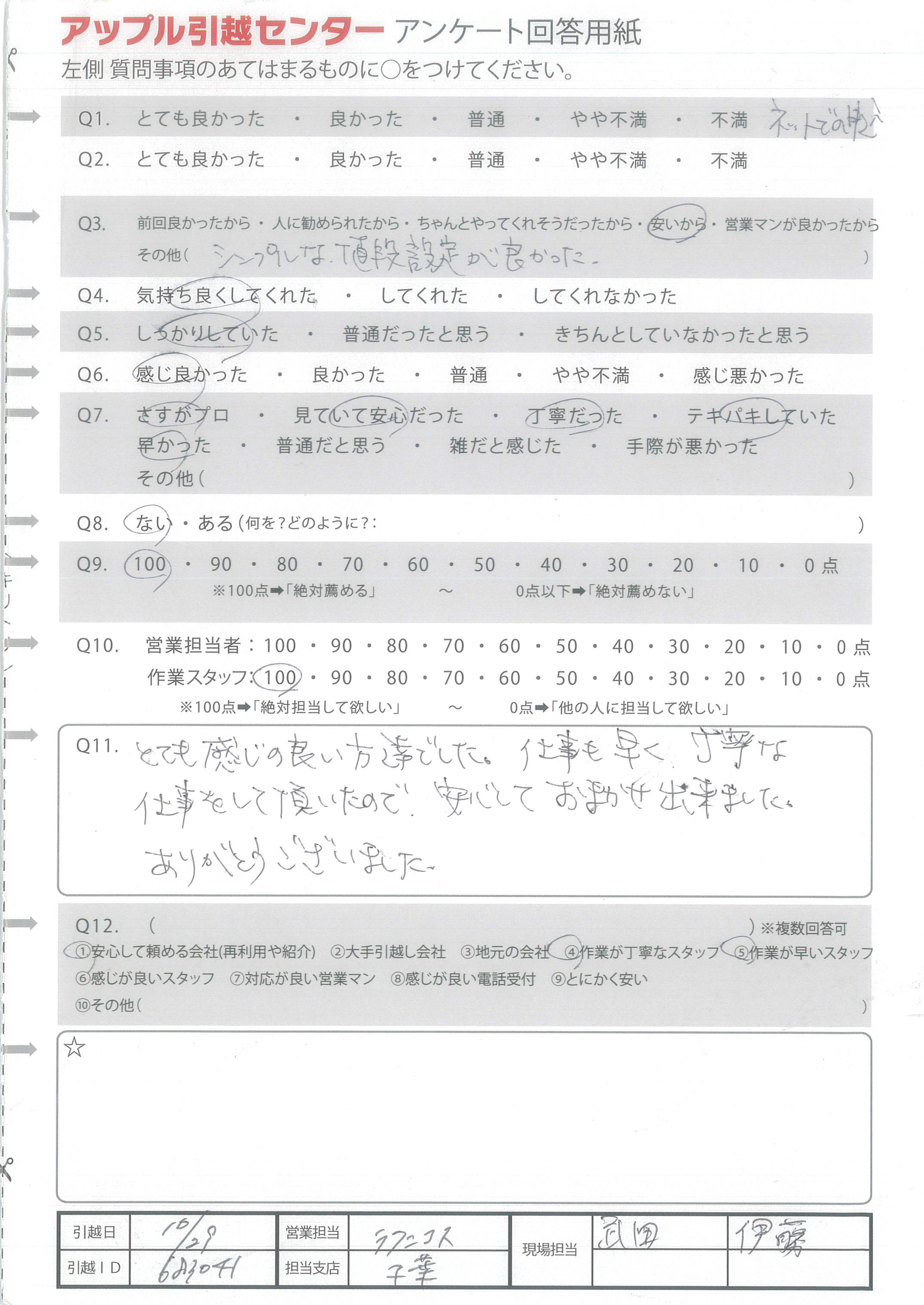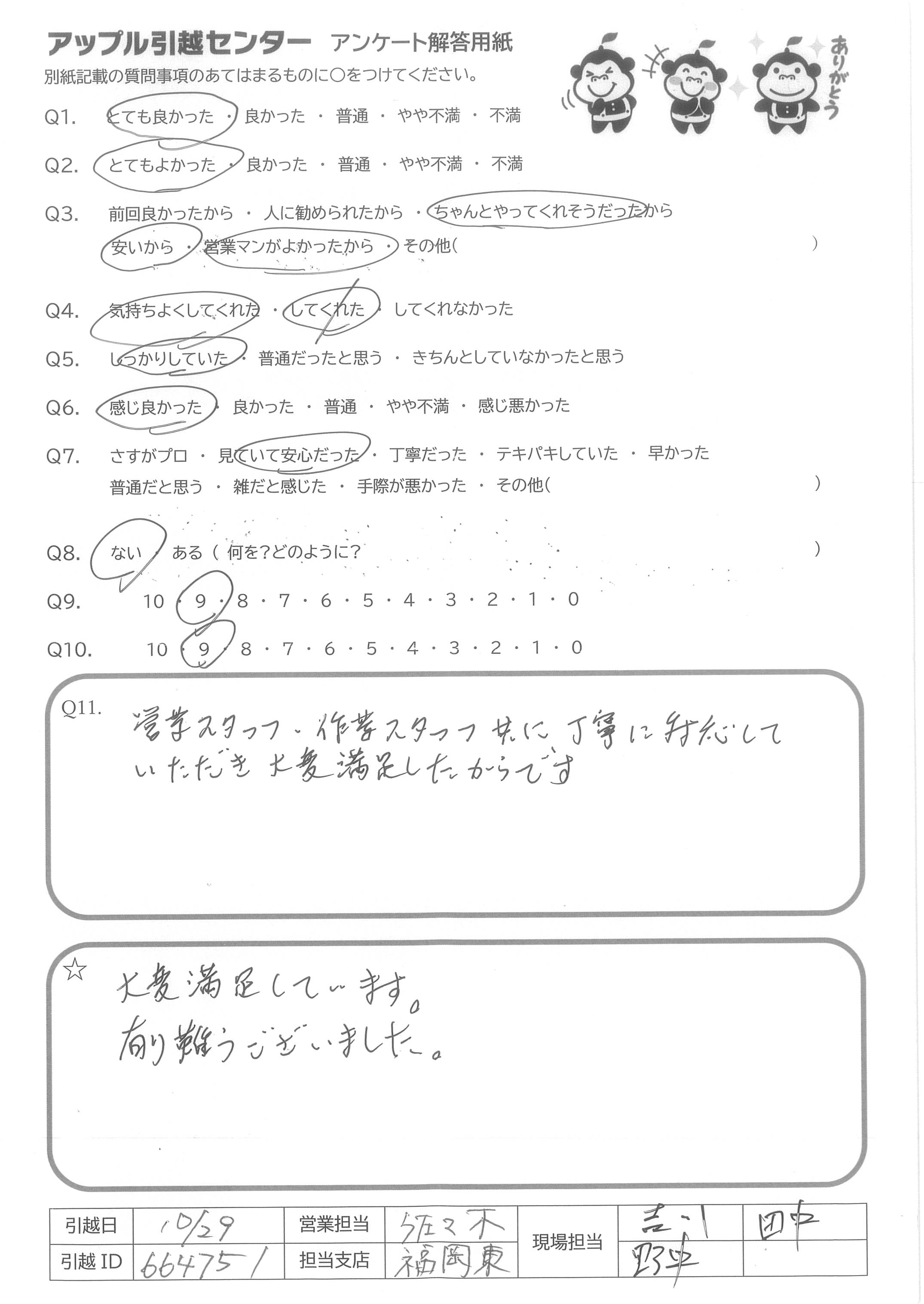 A.アンケートの回答が遅くなってしまいましたが、皆さんに引越し対応をお願いしてとてもよかったと思っています! ありがとうございました。