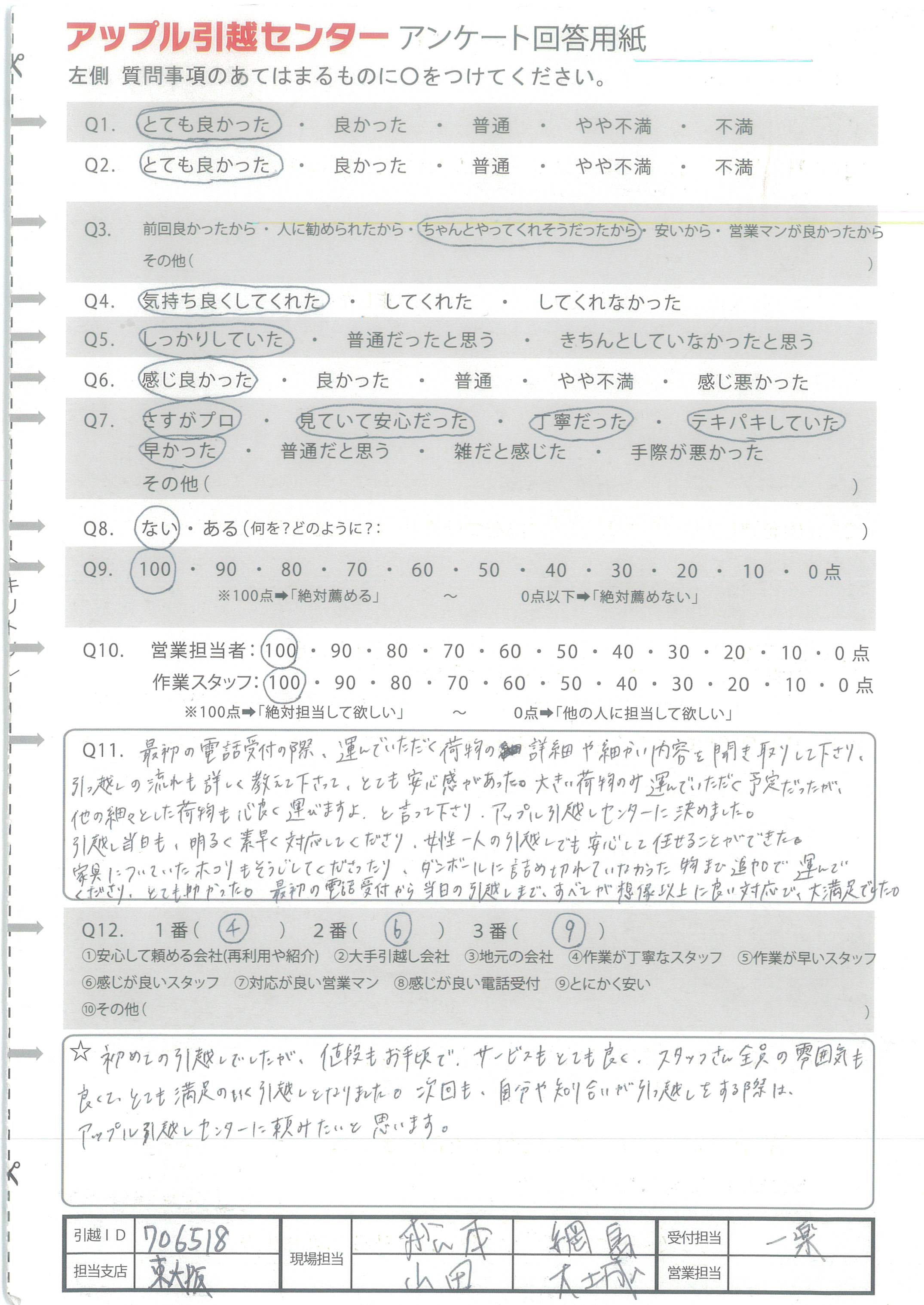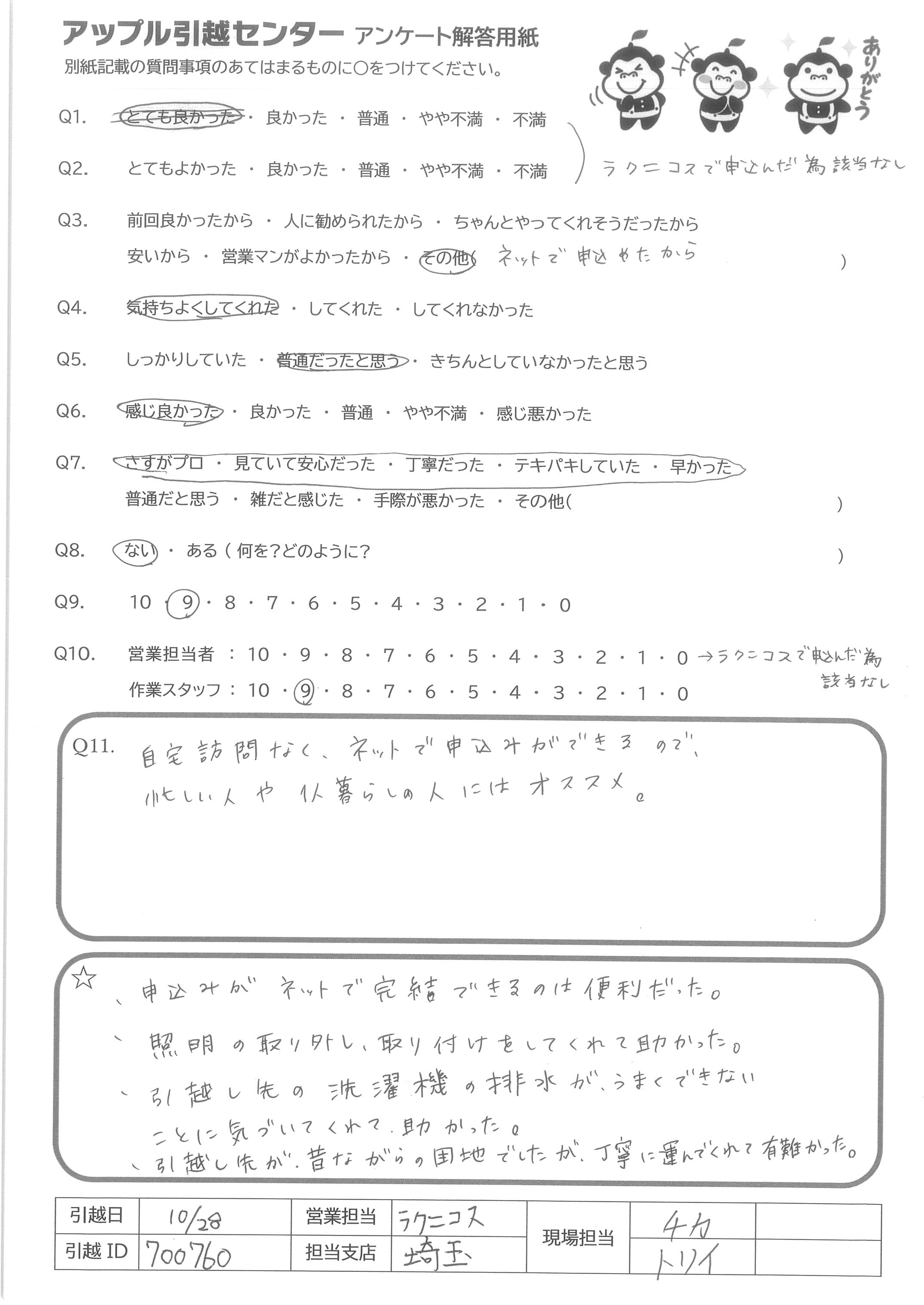 A.荷物を積んで(トラックに)いただくのに、大変だったように感じられました。 本当にていねいにしていただき感謝しております。 また、アンケートの返答が遅くなり、申し訳ありません。 今後とも、お身体に気をつけて、頑張っていただきたいと思います。 本当にお世話になりました。ありがとうございました。