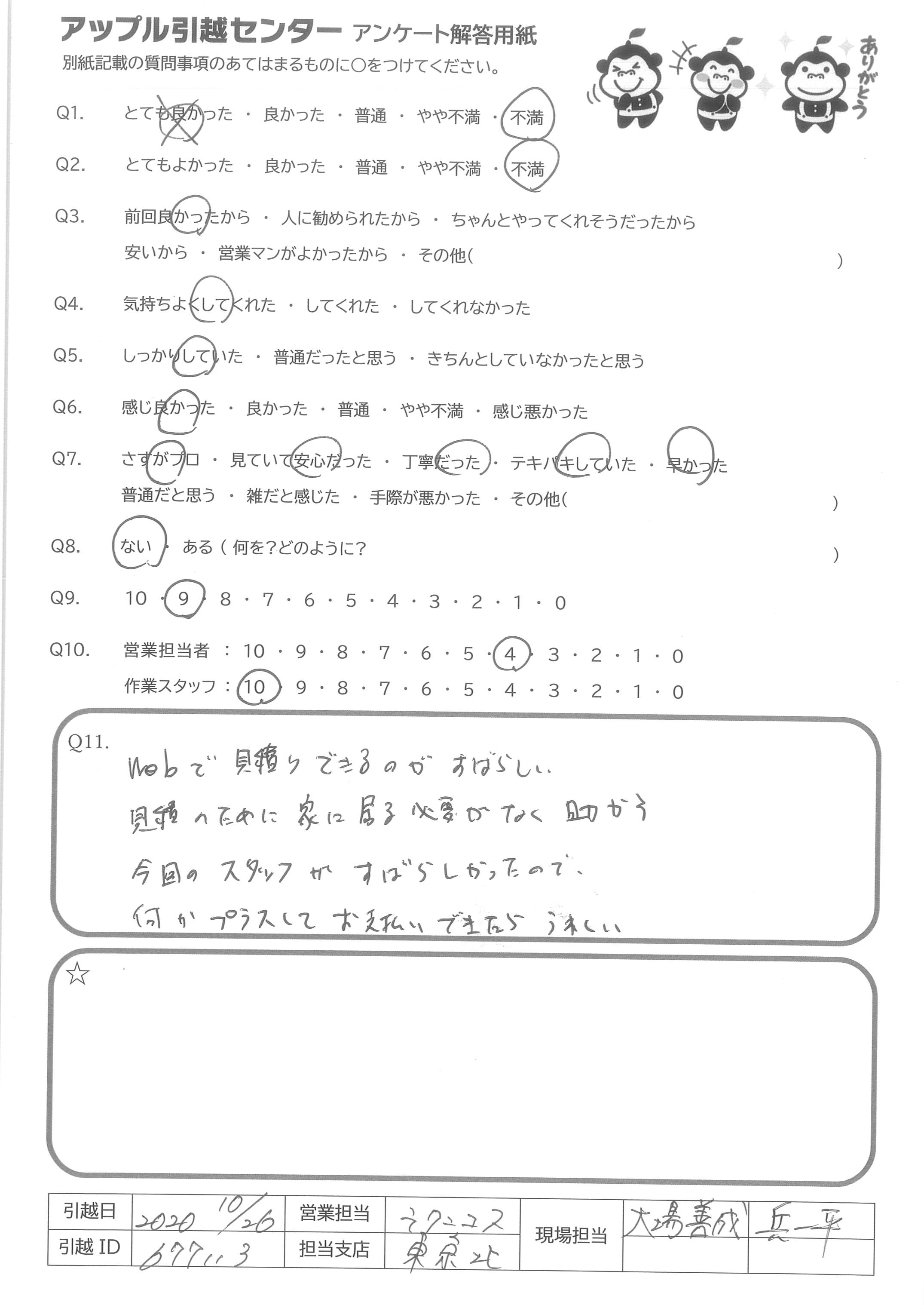 A.作業は早く人当たりはよい方々でしたが、積み忘れなど確認が疎かな部分があり、早く終わらせたいという気持ちが伝わってしまい残念でした。