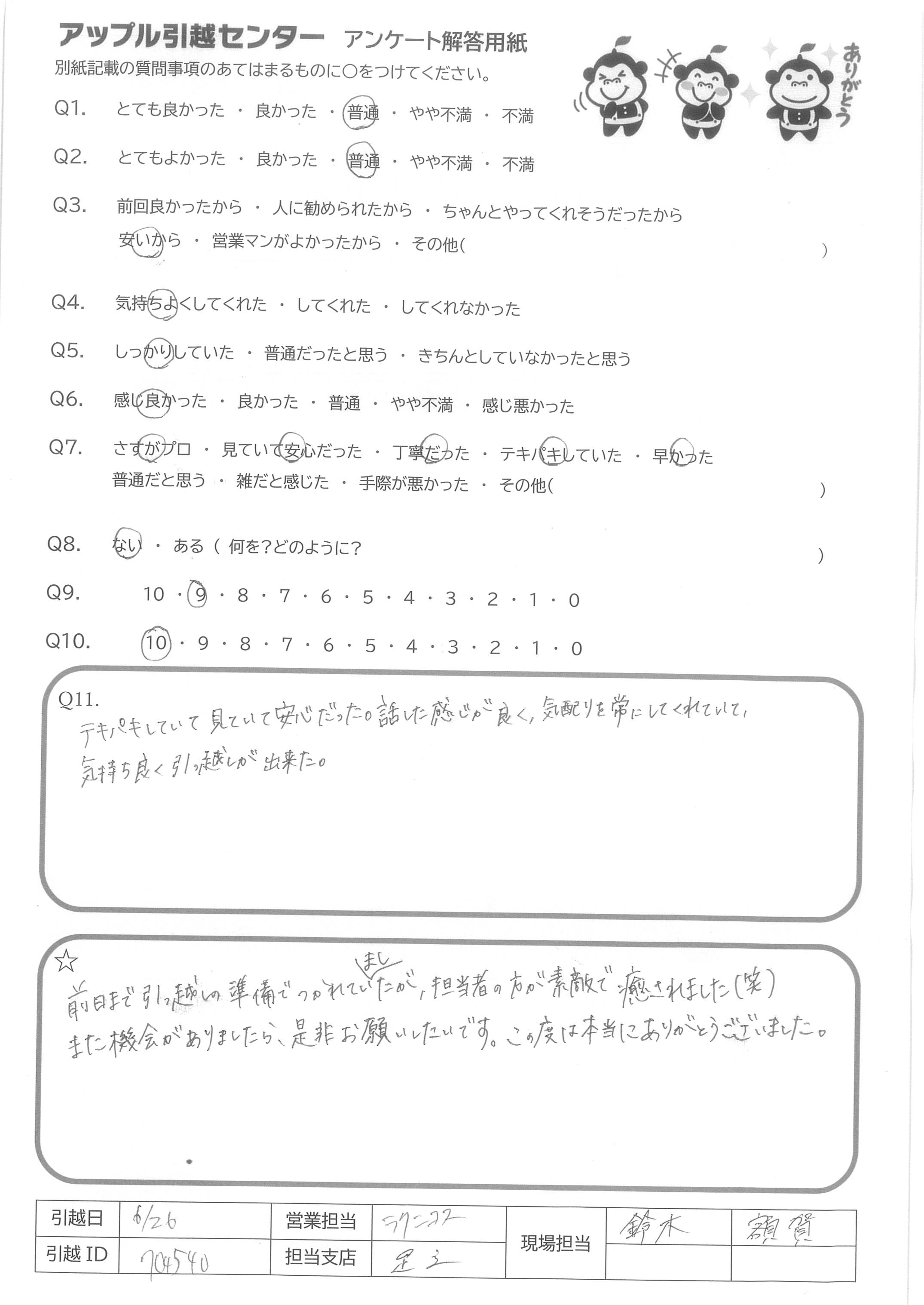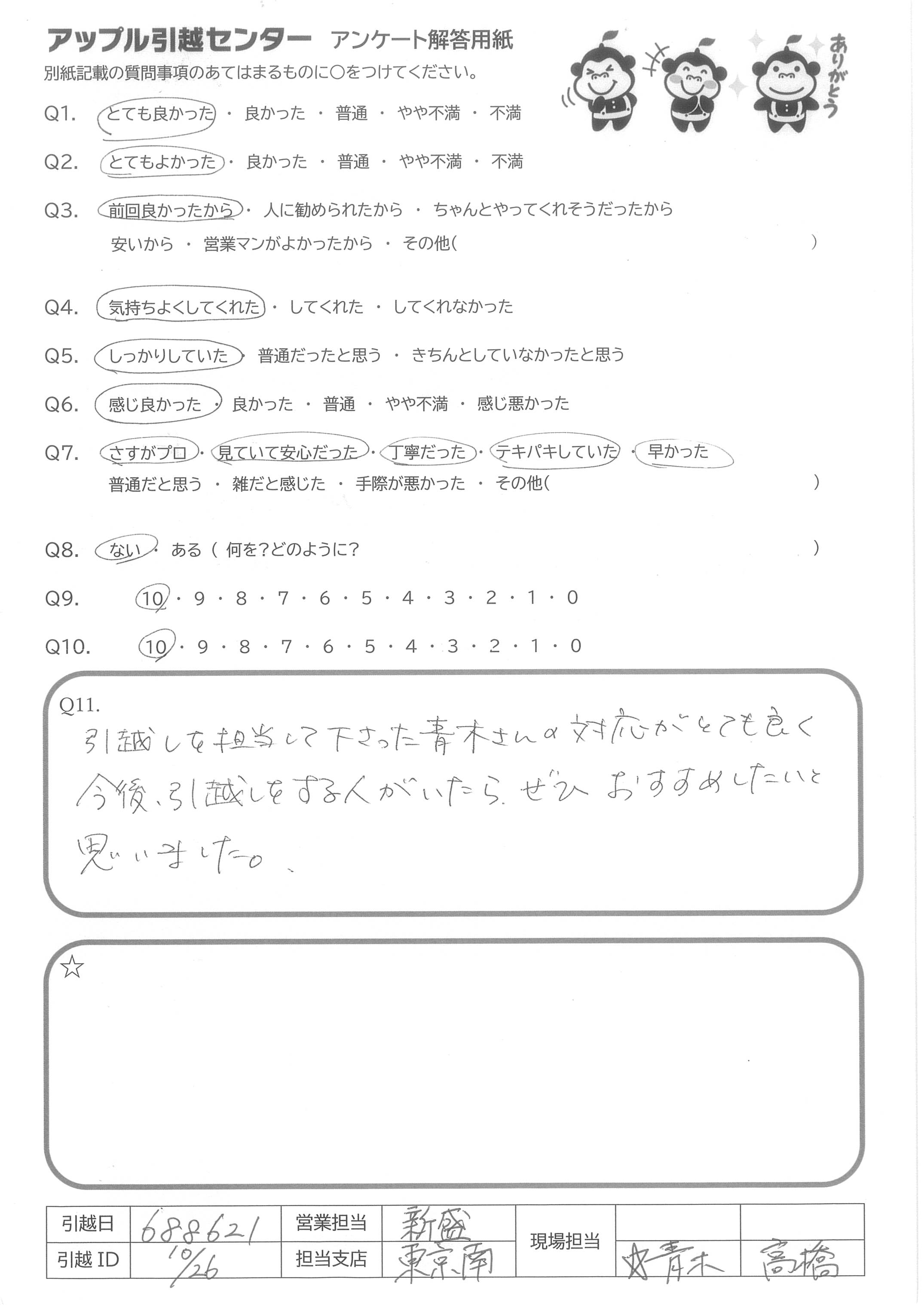 A.引越しを担当して下さった青木さんの対応がとても良く今後引越しをする人がいたら、ぜひおすすめしたいと思いました。