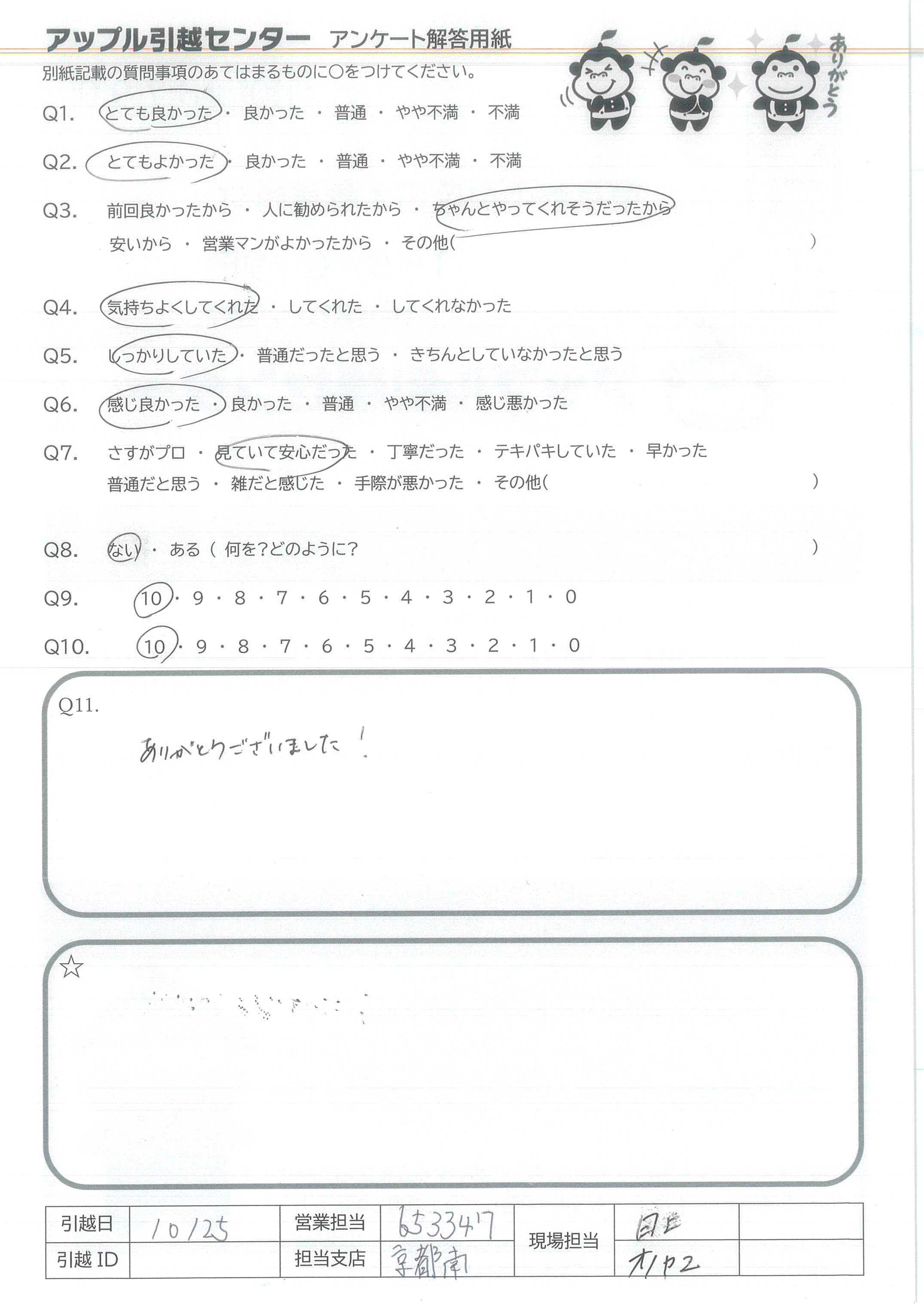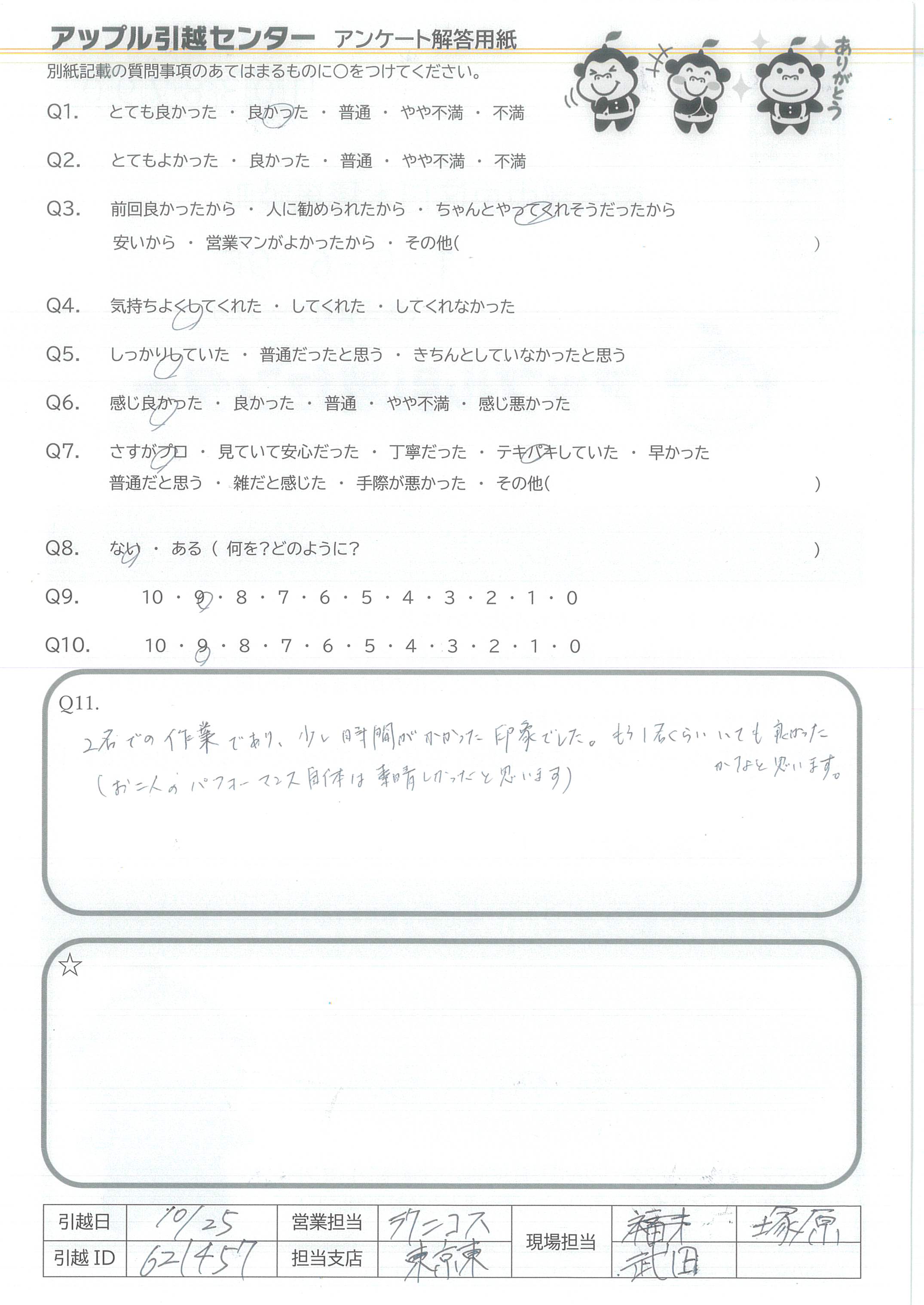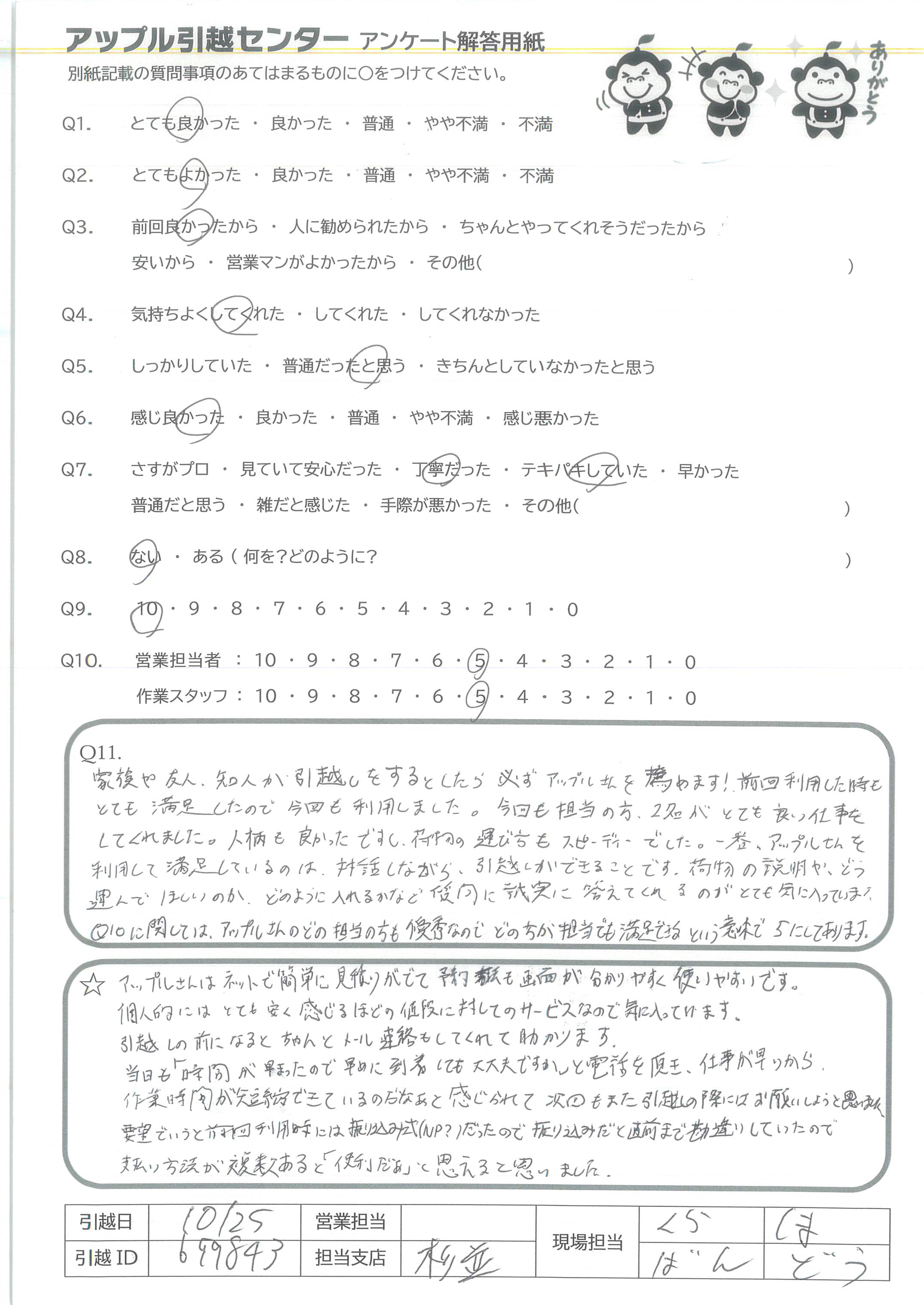 A.家族や友人、知人が引越しをするとしたら必ずアップルさんを薦めます!前回利用した時もとっても満足したので今回も利用しました。今回も担当の方、2名がとても良い仕事をしてくれました。人柄も良かったですし、荷物の運び方もスピーディーでした。一番、アップルさんを利用して満足しているのは、対話しながら引越しができることです。荷物の説明やどう運んでほしいのかどのように入れるかなど質問んい誠実に答えてくれるのがとても気に入っています Q10に関しては、、アップルさんのどの担当の方も優秀なのでどの方が担当でも満足できるという意味で5にしてあります。