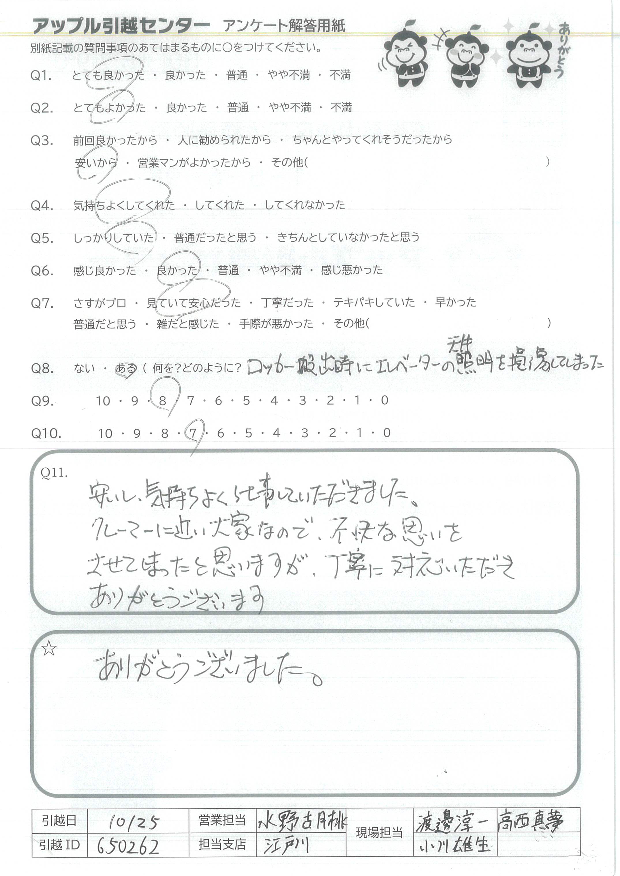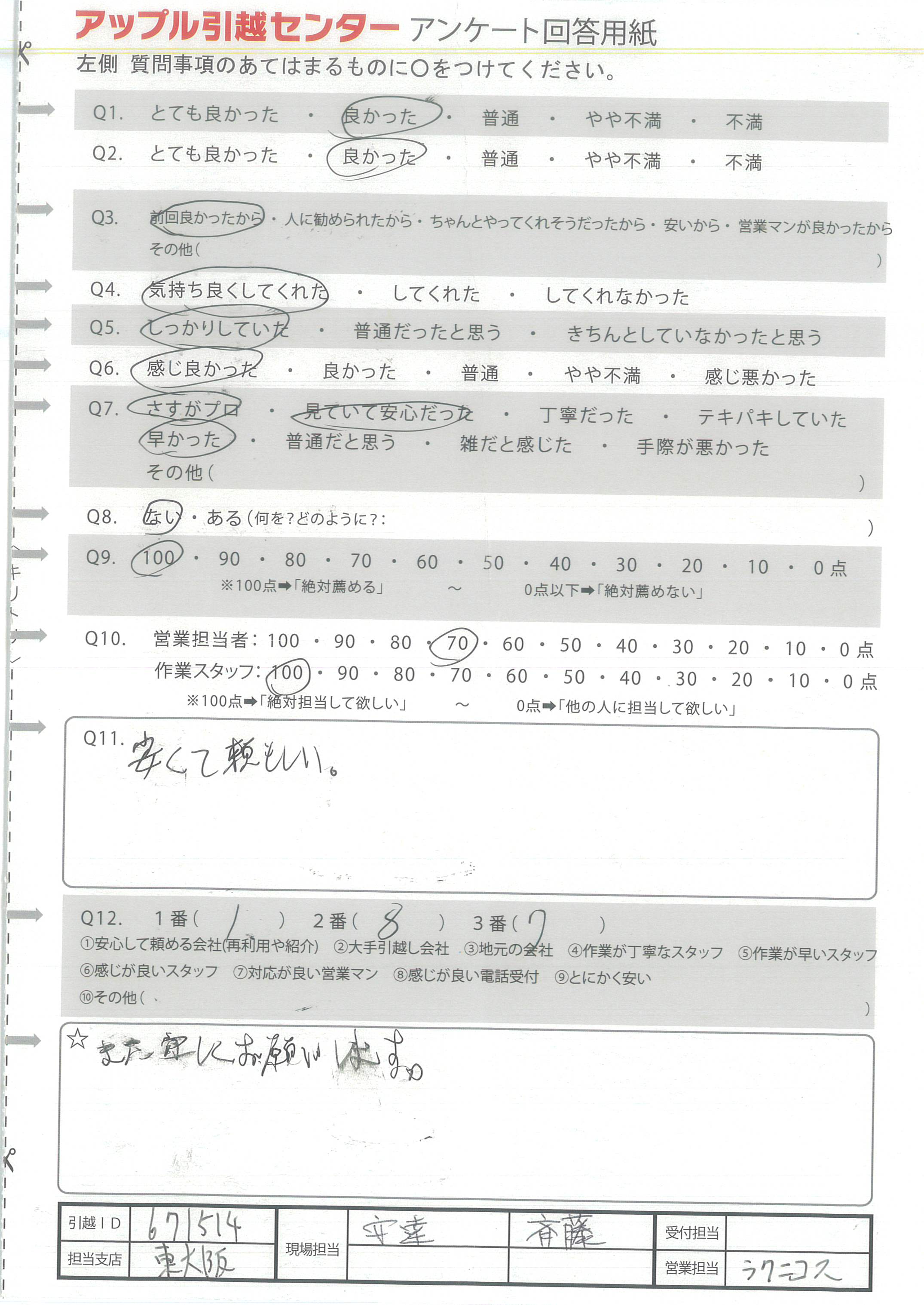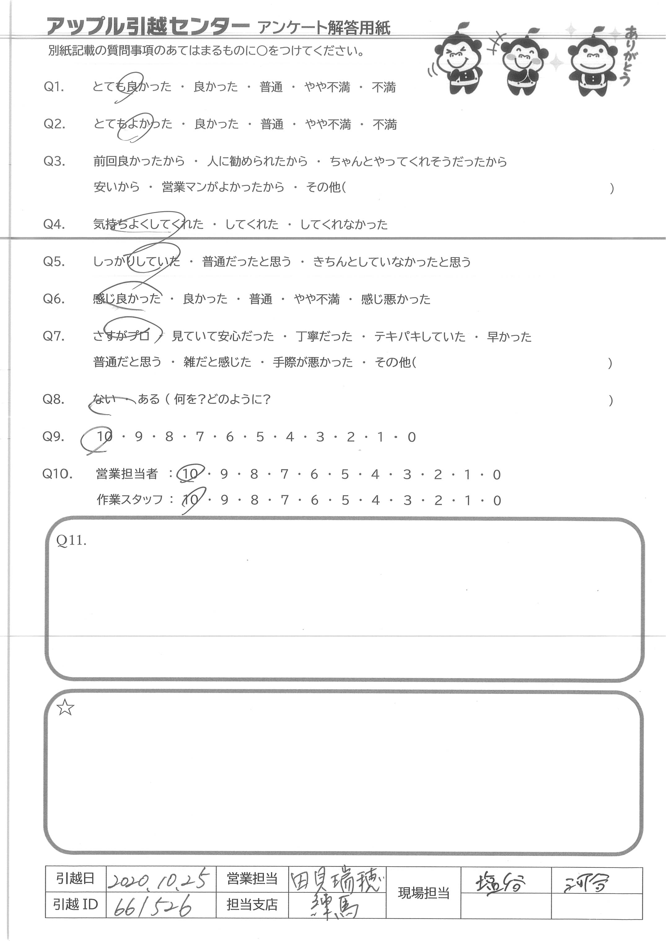 A.家族や友人、知人が引越しをするとしたら必ずアップルさんを薦めます!前回利用した時もとっても満足したので今回も利用しました。今回も担当の方、2名がとても良い仕事をしてくれました。人柄も良かったですし、荷物の運び方もスピーディーでした。一番、アップルさんを利用して満足しているのは、対話しながら引越しができることです。荷物の説明やどう運んでほしいのかどのように入れるかなど質問んい誠実に答えてくれるのがとても気に入っています Q10に関しては、、アップルさんのどの担当の方も優秀なのでどの方が担当でも満足できるという意味で5にしてあります。