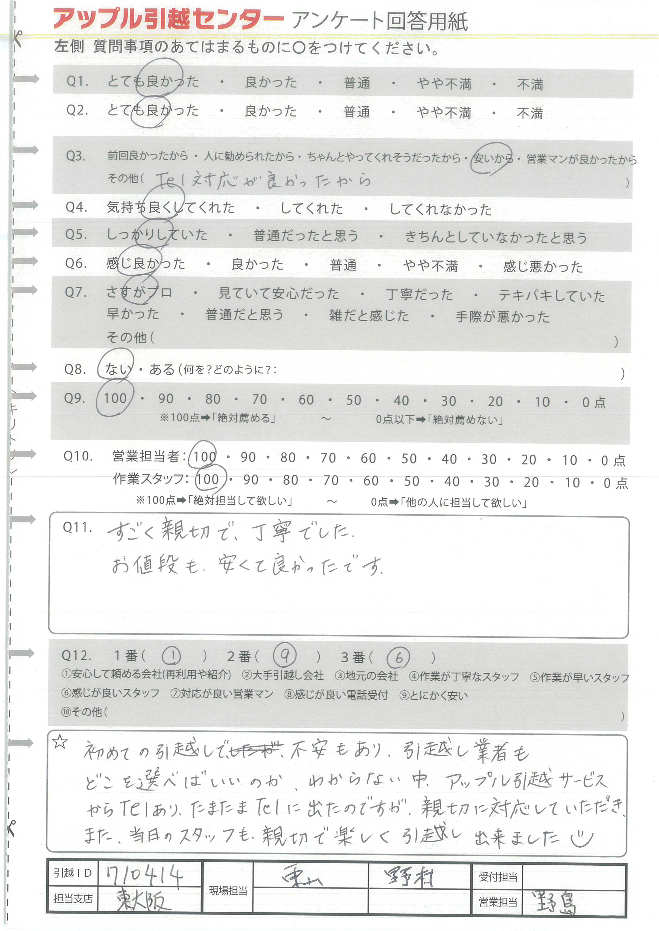 A.初めての引越しでふさんもあり、引越し業者もどこを選べばいいのか、わからない中、アップル引越サービスからTelあり、たまたまTelに出たのですが、親切に対応していただき、また、当日のスタッフも親切で楽しく引越し出来ました。