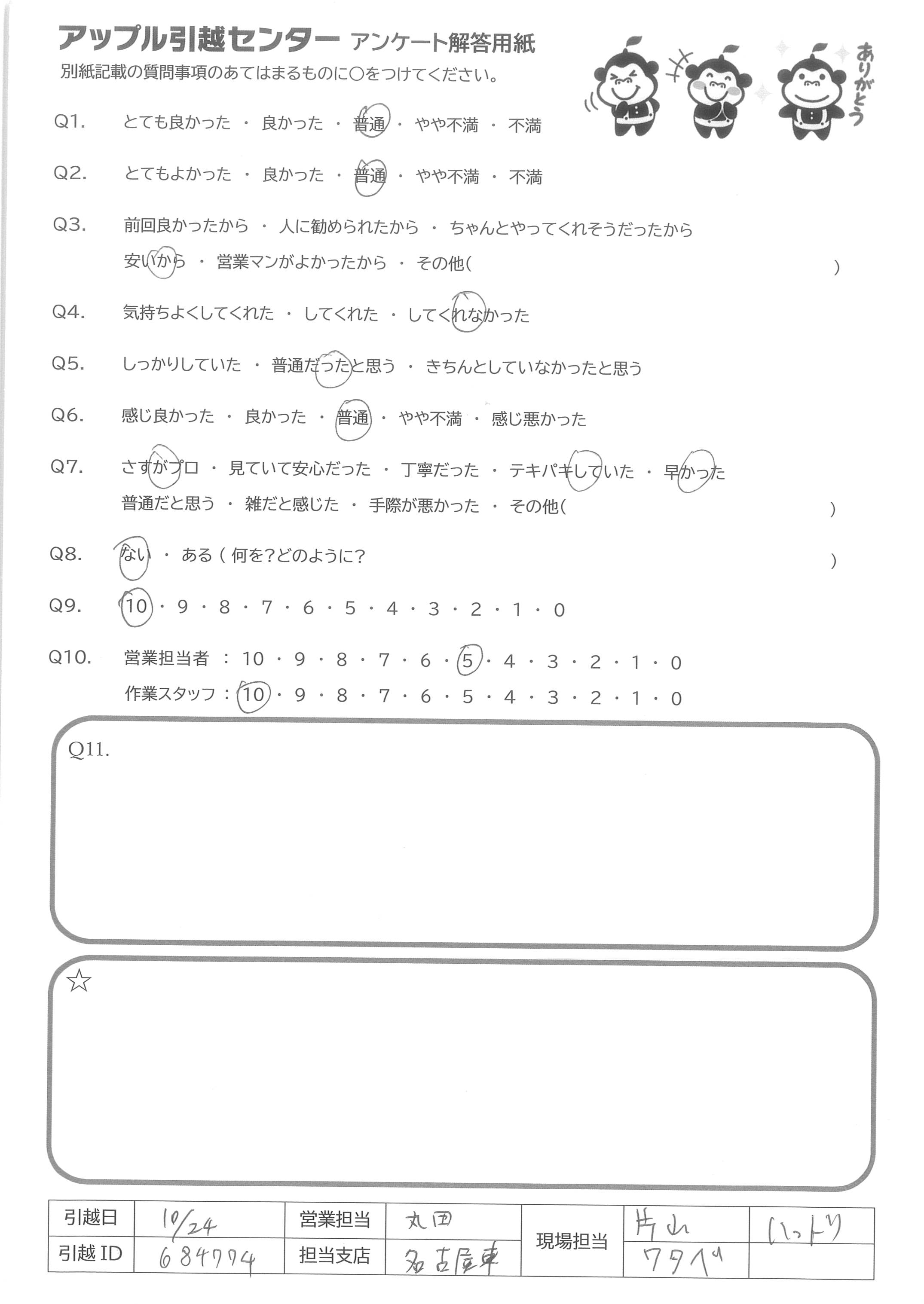 A.現場担当のトサヤさん、ホソカワさんの対応がとても気持ちよく、作業も親切丁寧に行っていただきました。そのため、次回も引越しの際は御社を利用させていただきたいと強くおもいました。 改めて、お二方にお礼申し上げます。