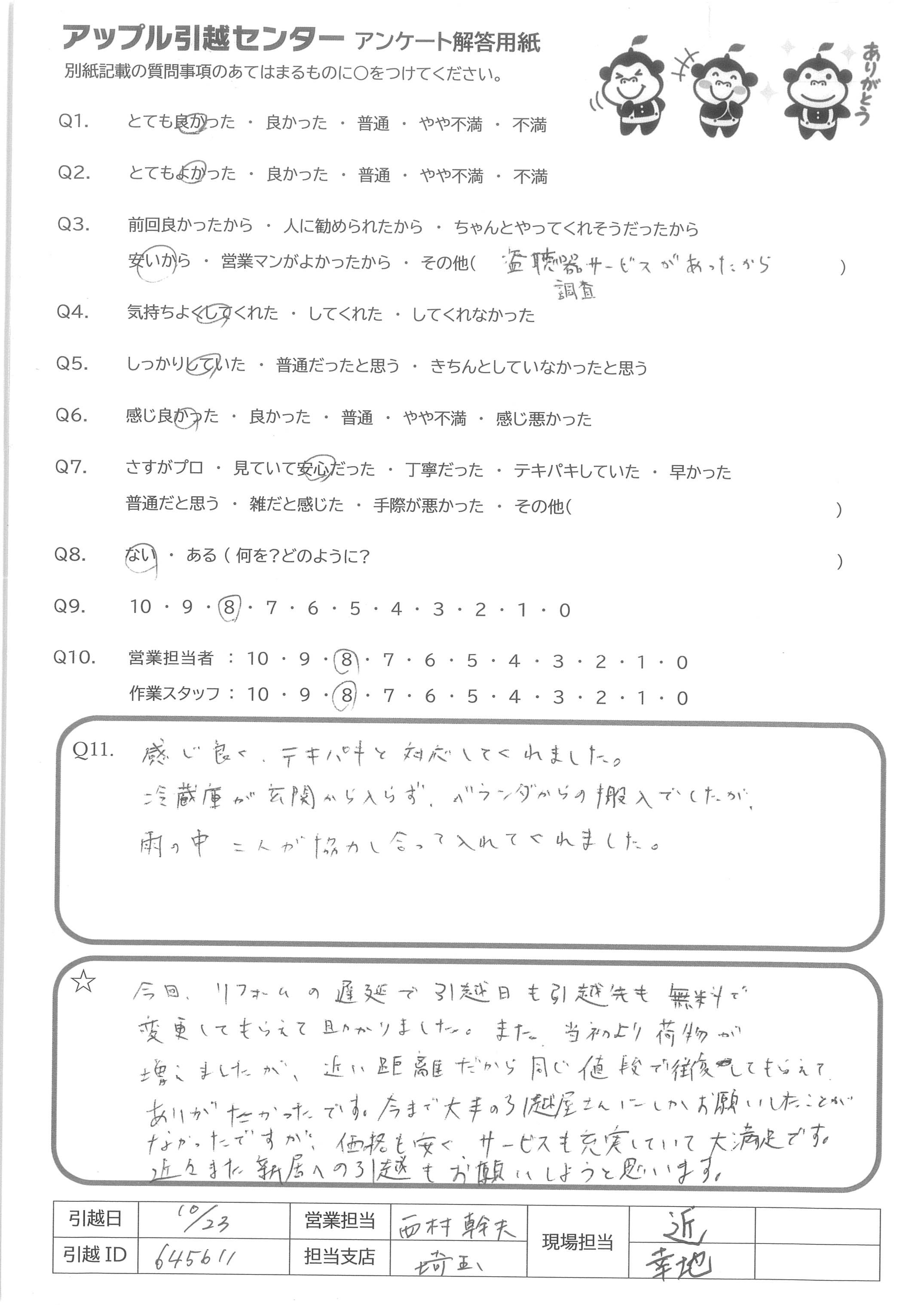 A.今回、営業の方とはそれほで話す機会がありませんでした。作業スタッフの方たちは皆良い方たちで、とても印象が良かったです。今度引っ越しするときも同じ作業スタッフの方に頼みたいと思いました。遠くまで、遅くまでお疲れさまでした。本当にありがとうございました。