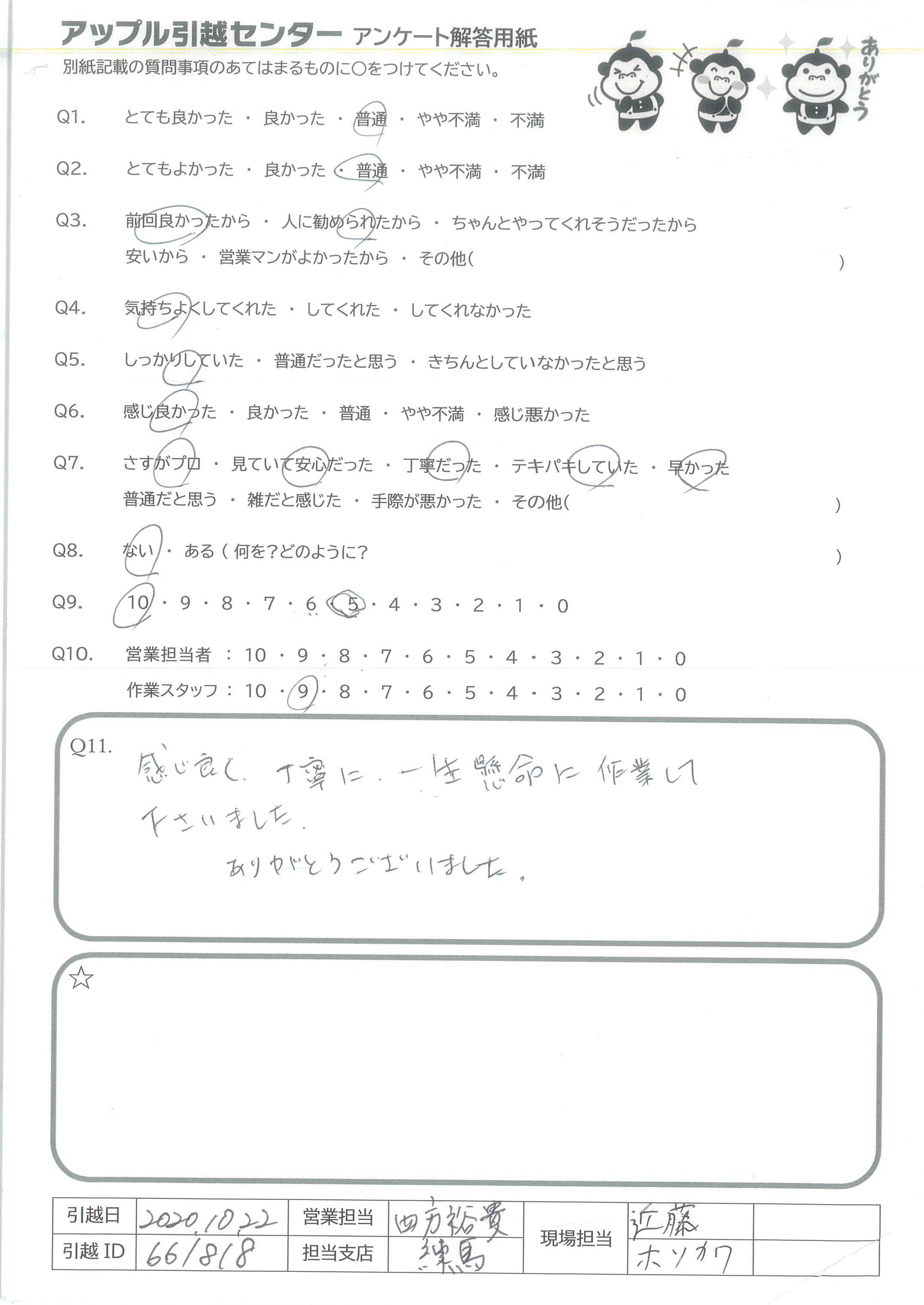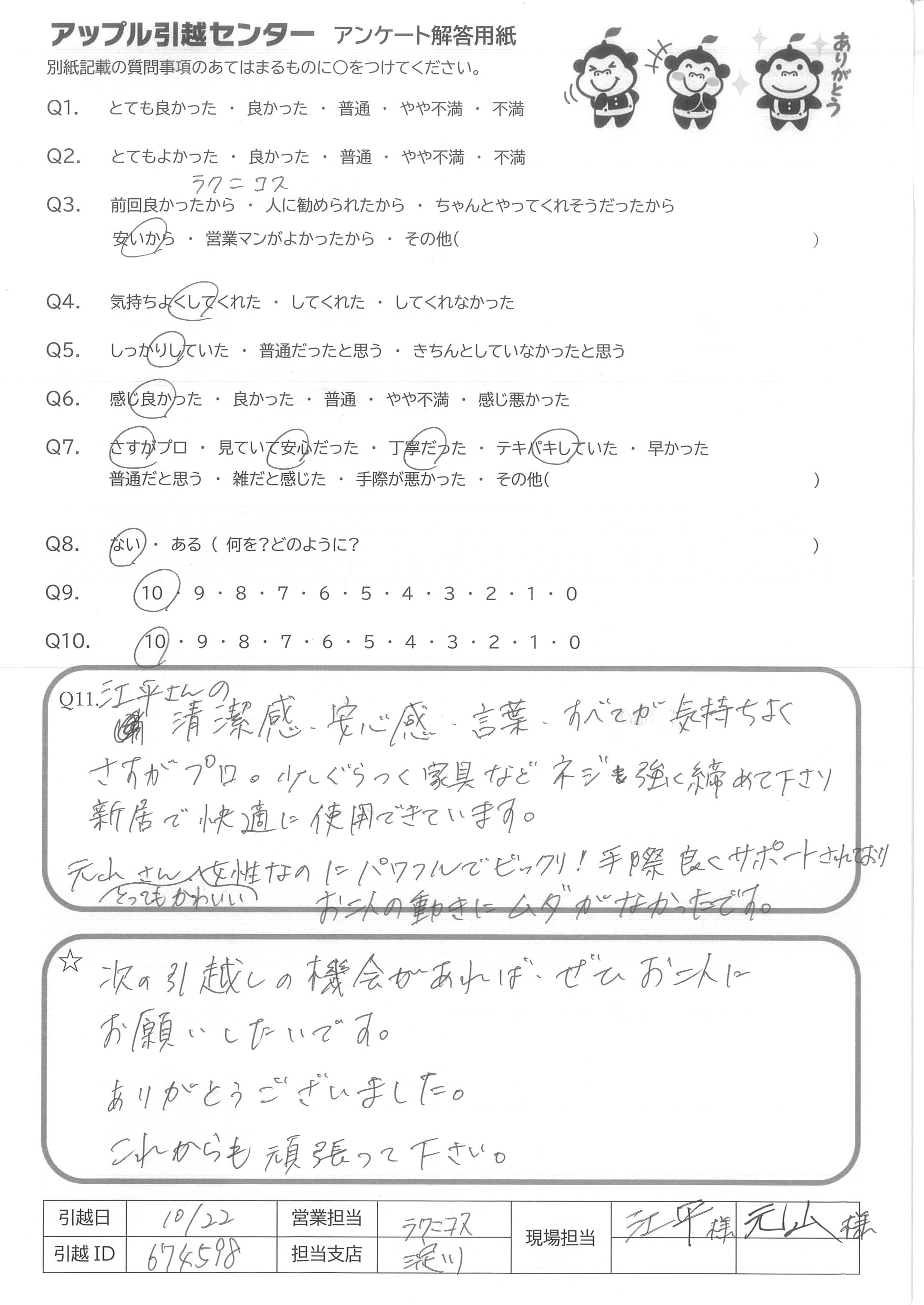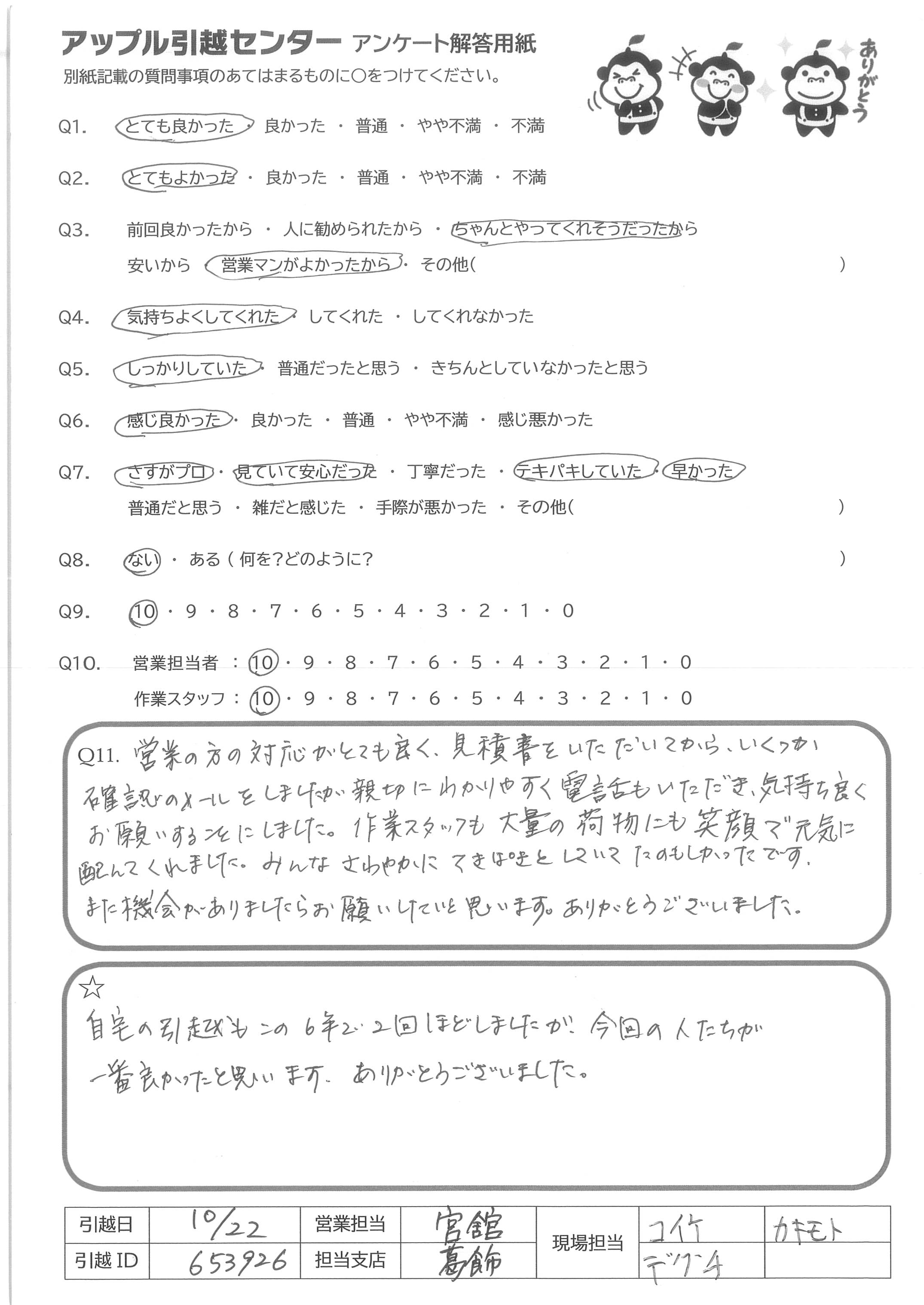 A.自宅の引越もこの6年で2回ほどしましたが、今回の人たちが一番良かったと思います。ありがとうございました。