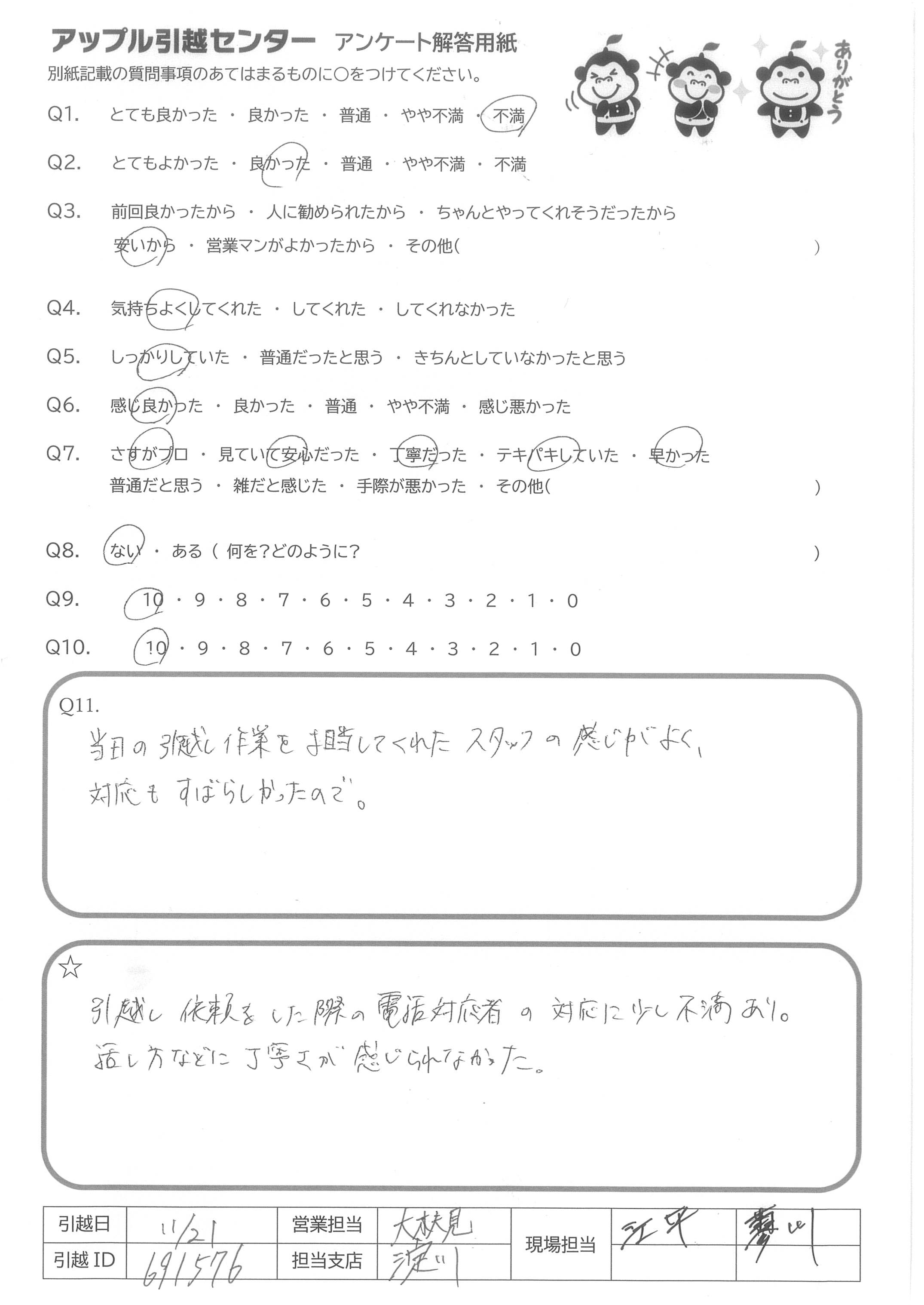 A.引越し依頼をした際の電話対応者の対応に少し不満あり。 話し方などに丁寧さが感じられなかった。