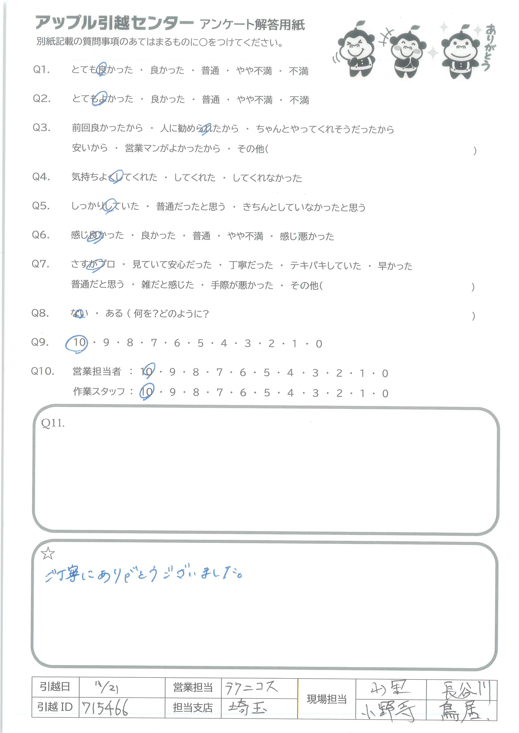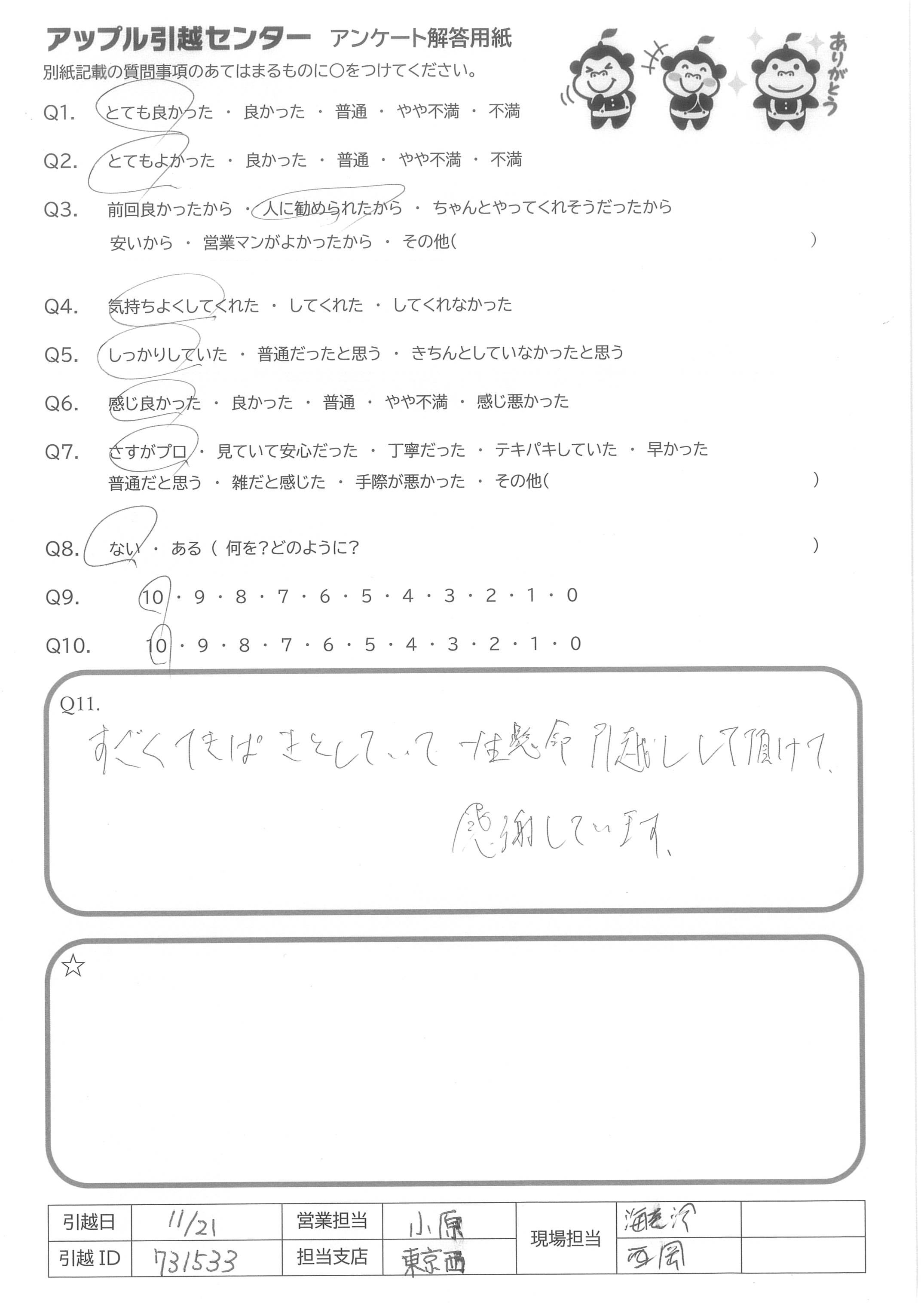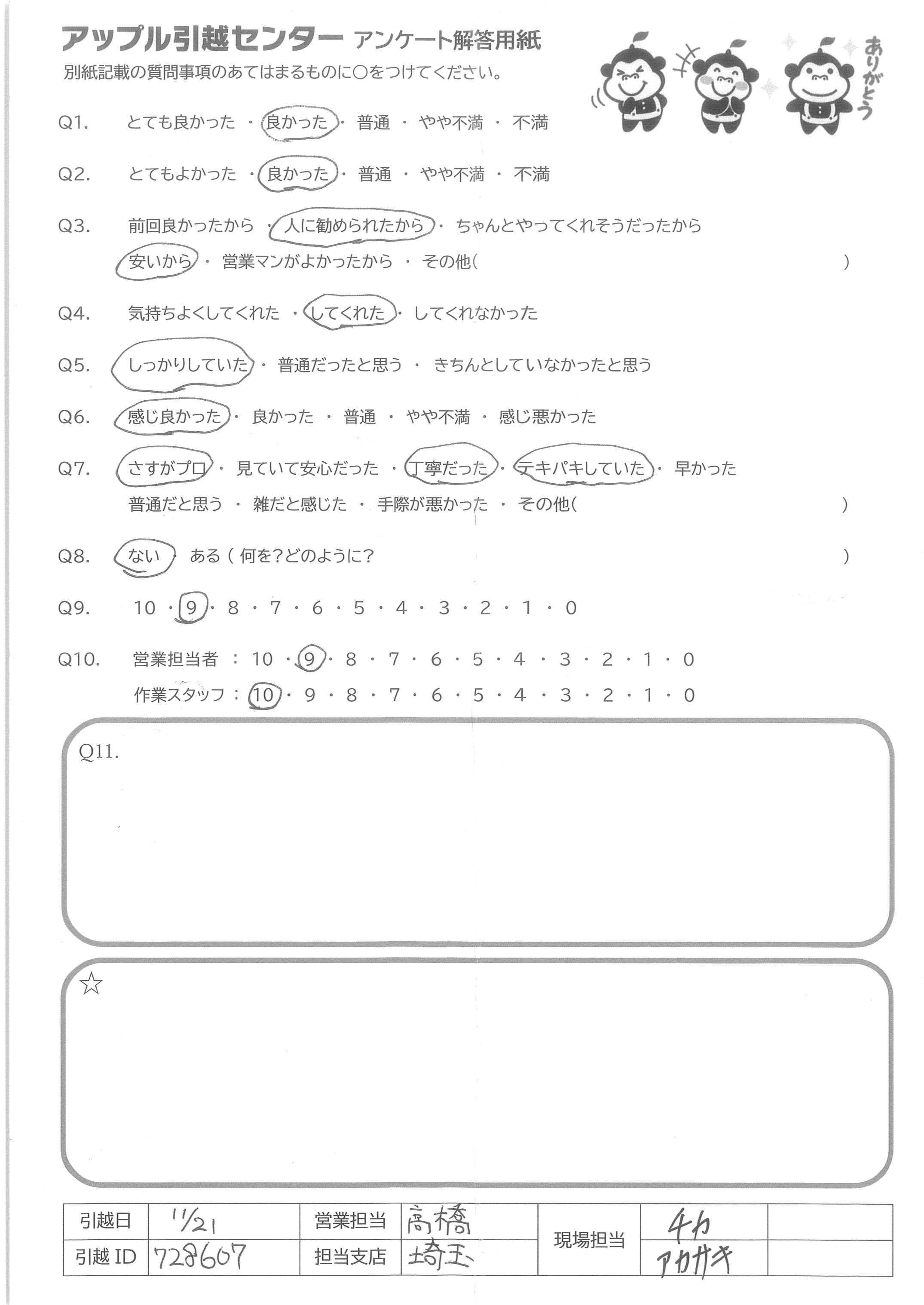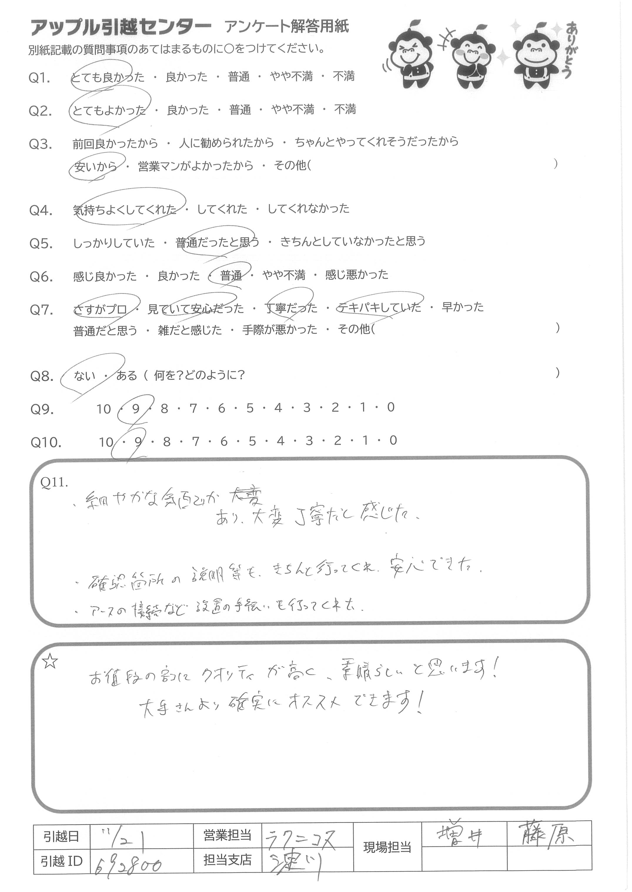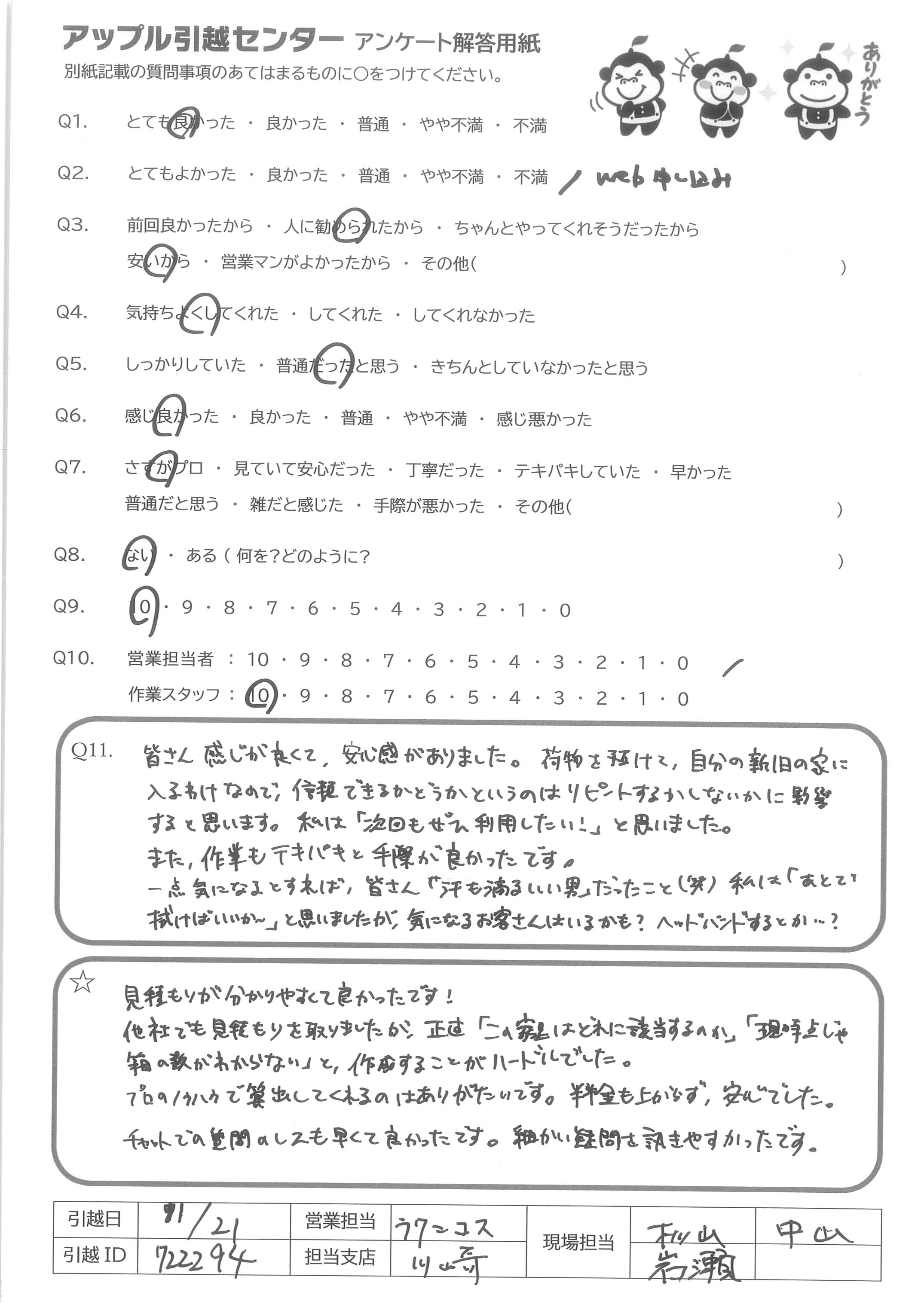 A.久しぶりの引越しで荷物も少なくなかったが、丁寧に対応いただきありがとうございました。