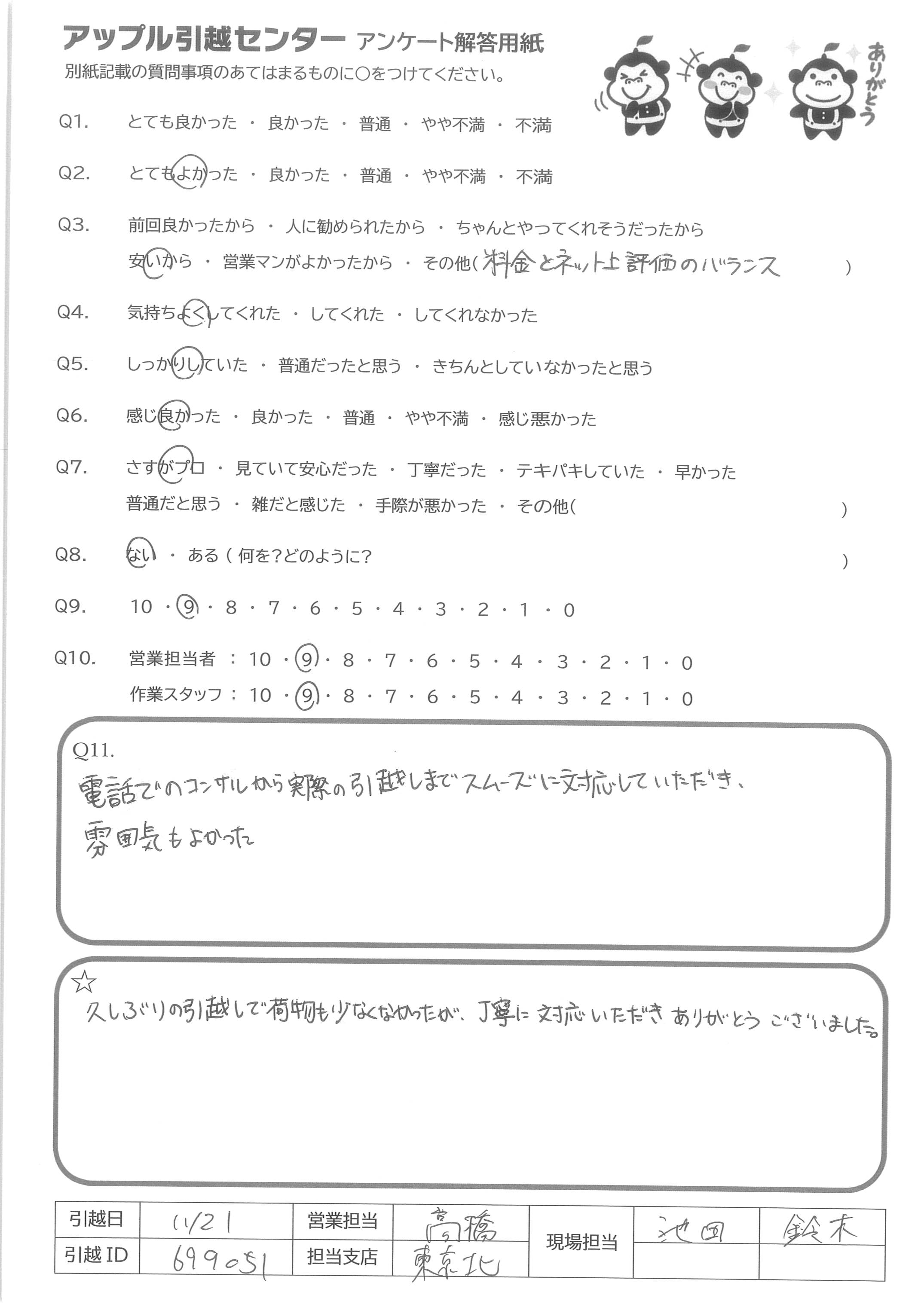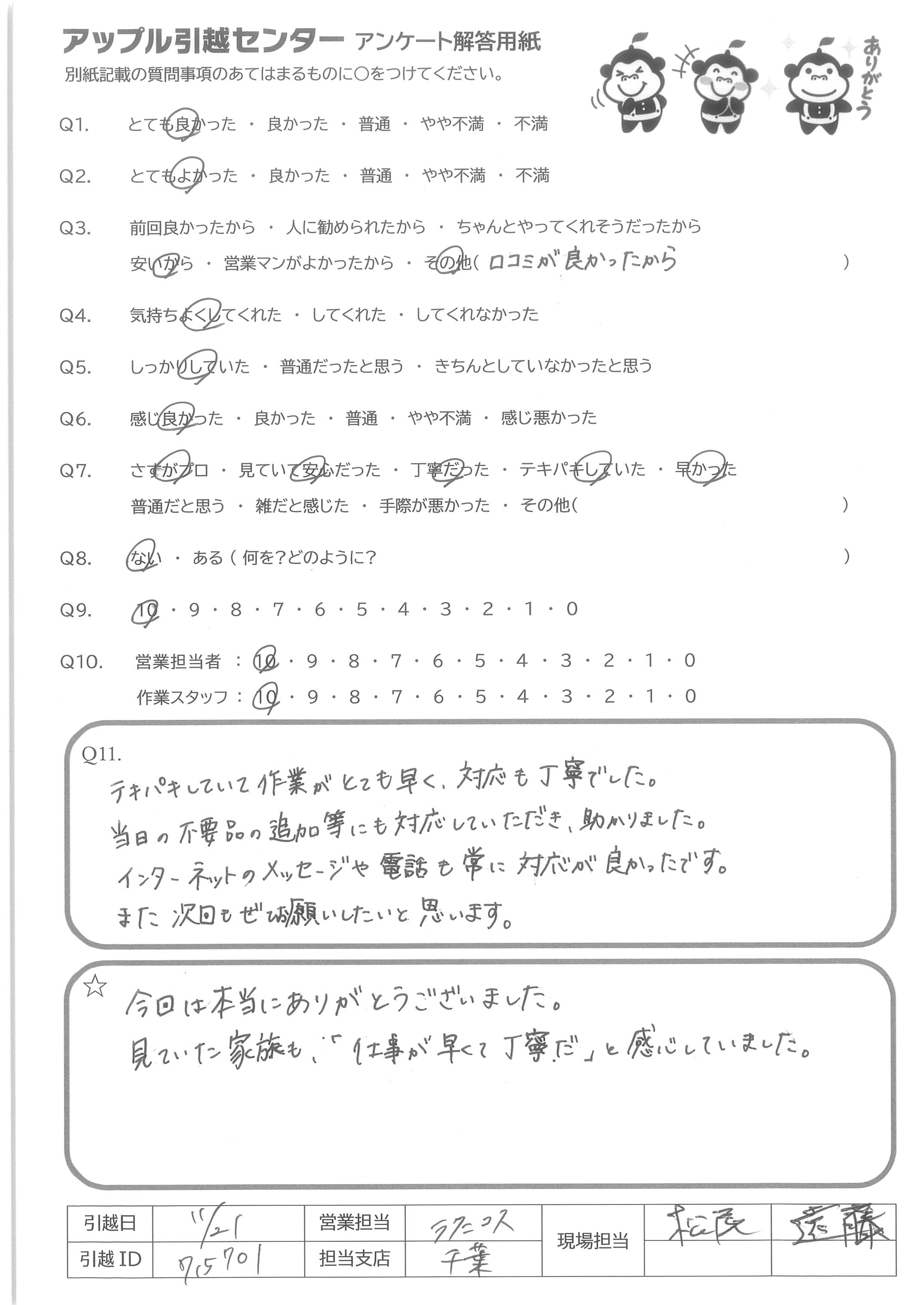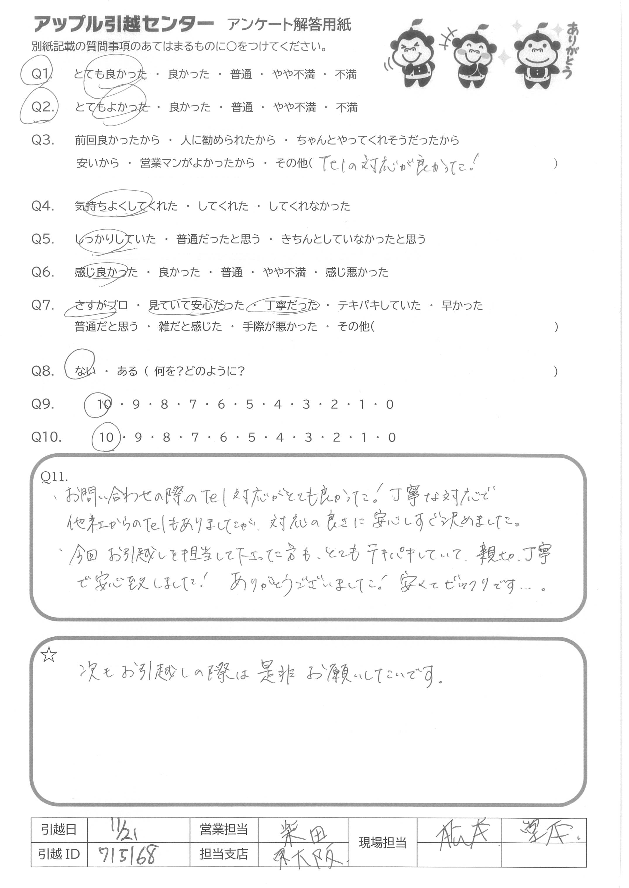 A.・お問い合わせの際のTel対応がとても良かった!丁寧な対応で他社からのTelもありましたが、対応の良さに安心しすぐ決めました。 ・今回お引越しを担当して下さった方も、とてもテキパキしていて、親切、丁寧で安心致しました!ありがとうございました!安くてビックリです・・・。