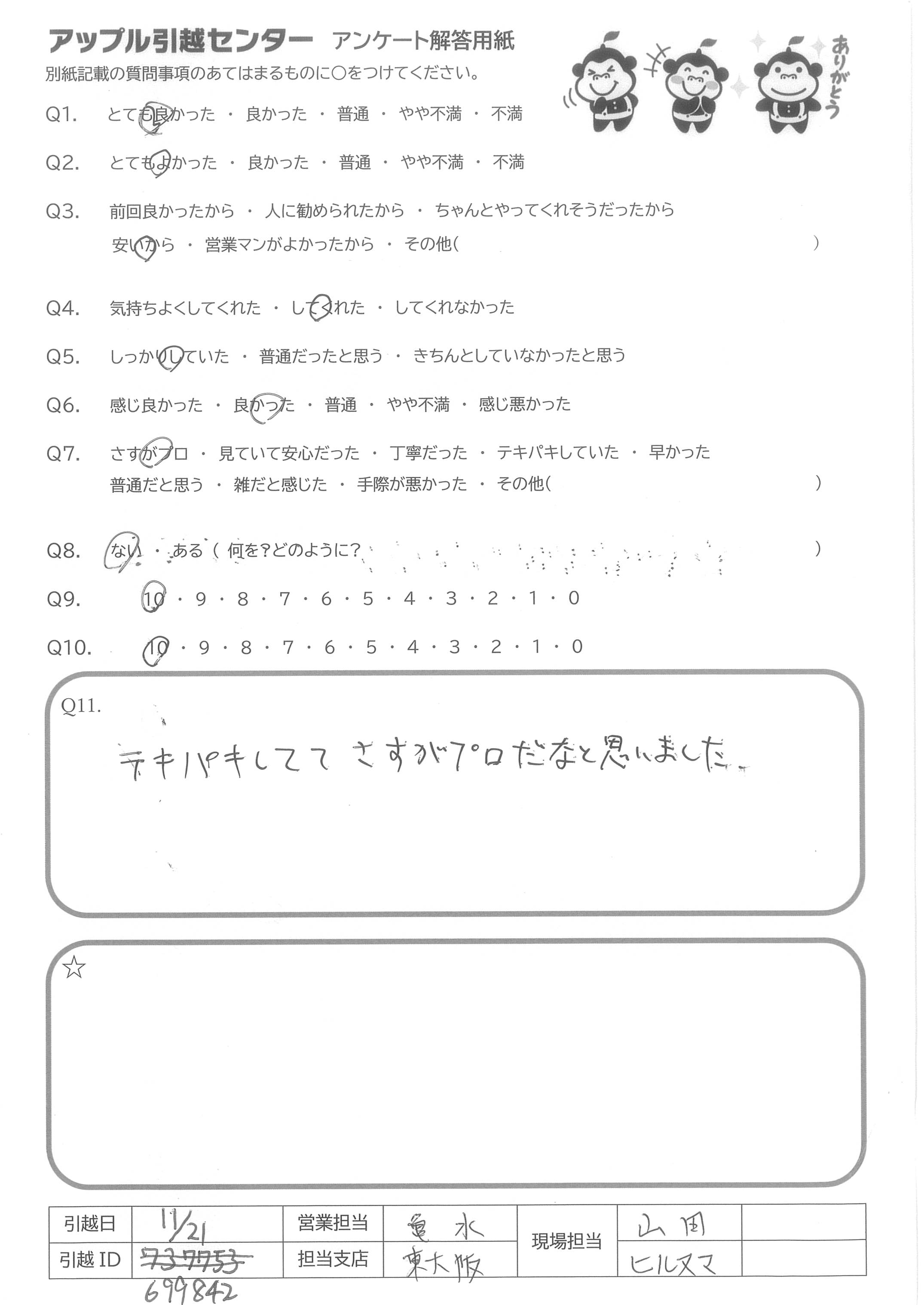 引越し日:2020年11月21日 エリア:大阪府大阪市西淀川区