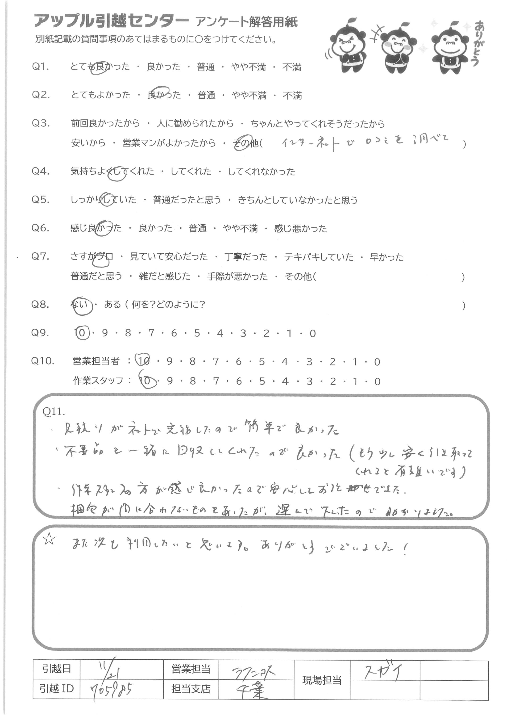 引越し日:2020年11月21日 エリア:千葉県習志野市