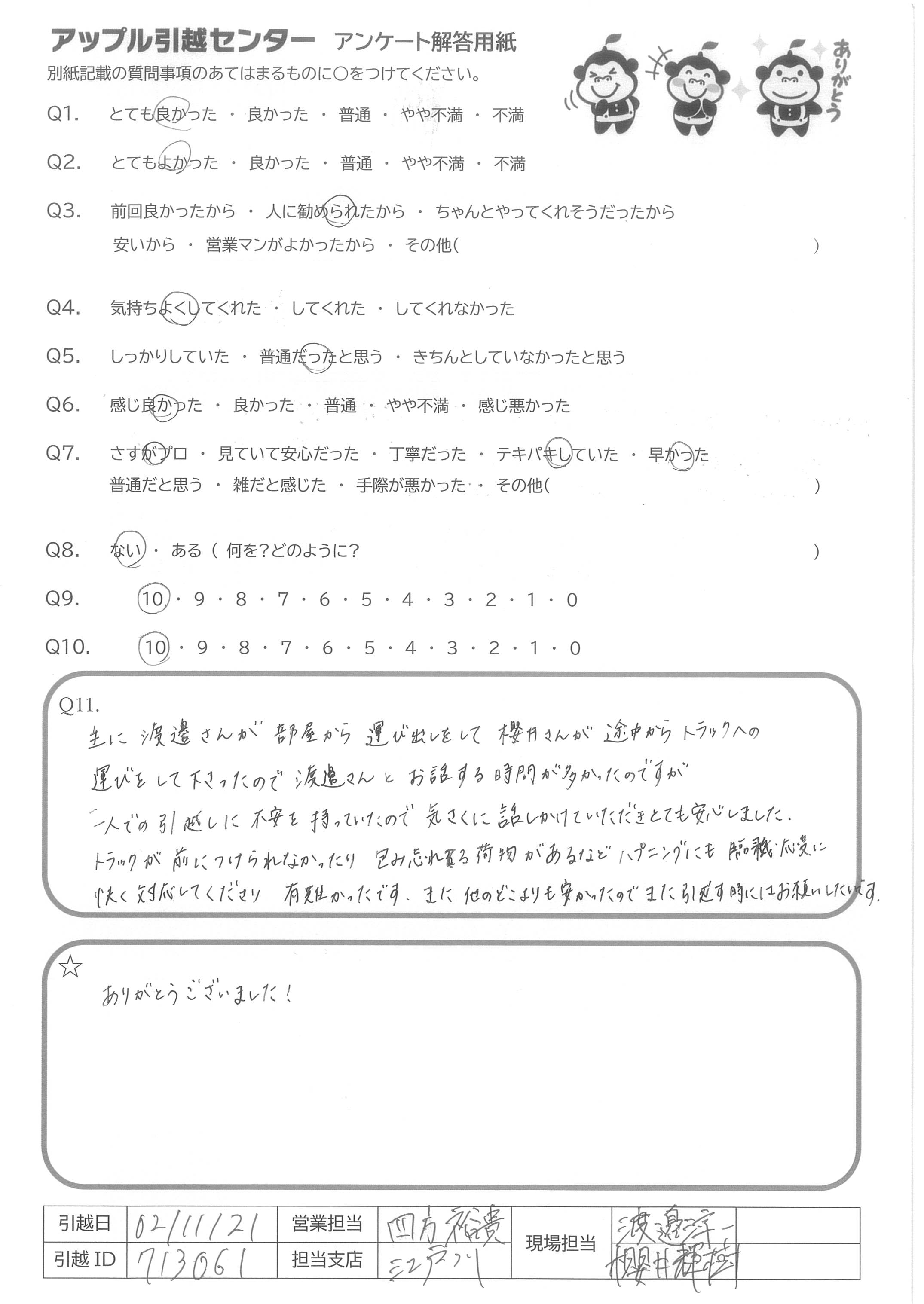 A.主に渡邉さんが部屋から運び出しをして櫻井さんが途中からトラックへの運びをして下さったので渡邉さんとお話する時間が多かったのですが一人での引越しに不安を持っていたので気さくに話しかけていただきとても安心しました。 トラックが前につけられなかったり、包み忘れる荷物があるなどハプニングにも臨機応変に快く対応してくださり有難かったdせう。また他のどこよりも安かったのでまた引越す時にはお願いしたいです。