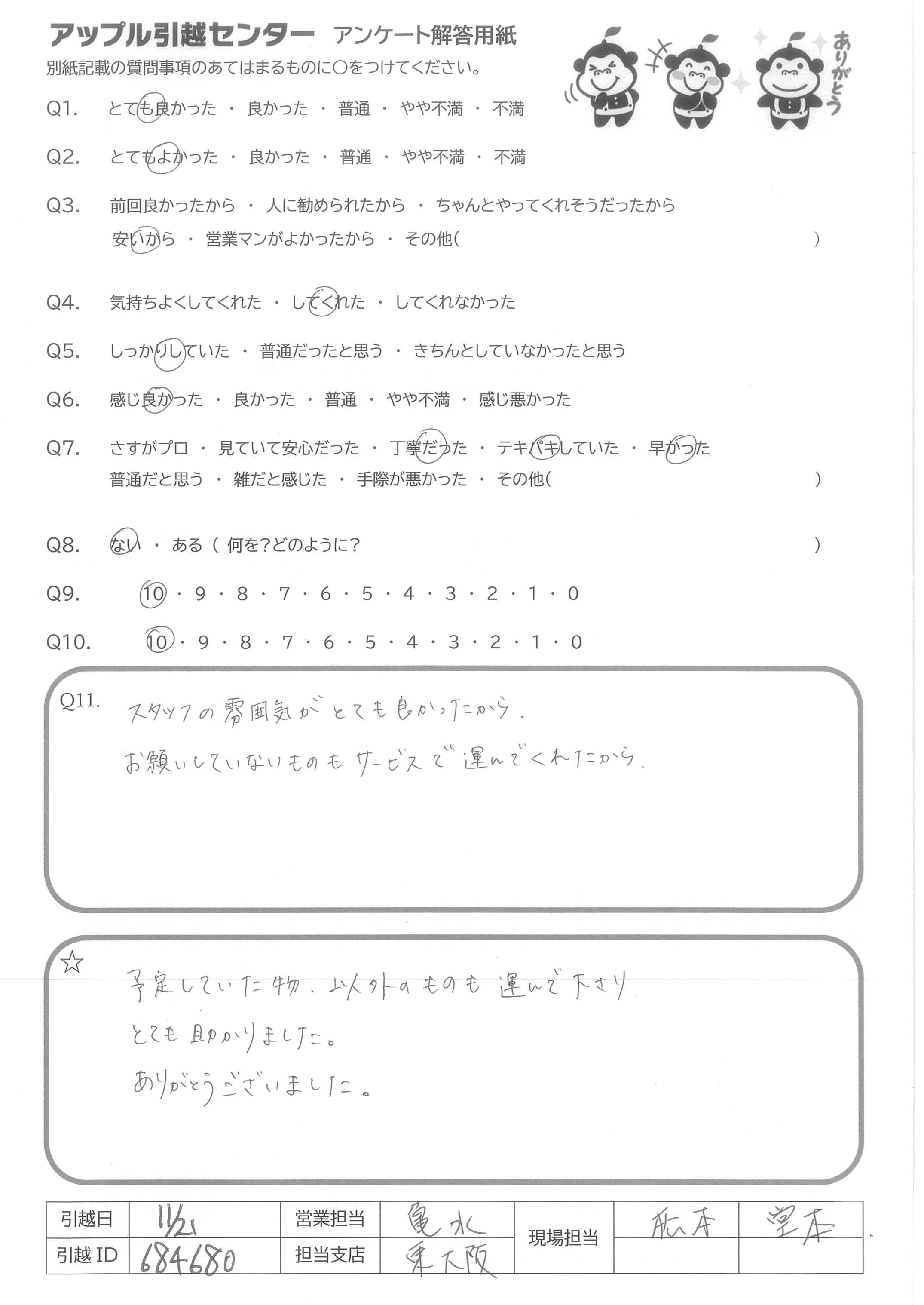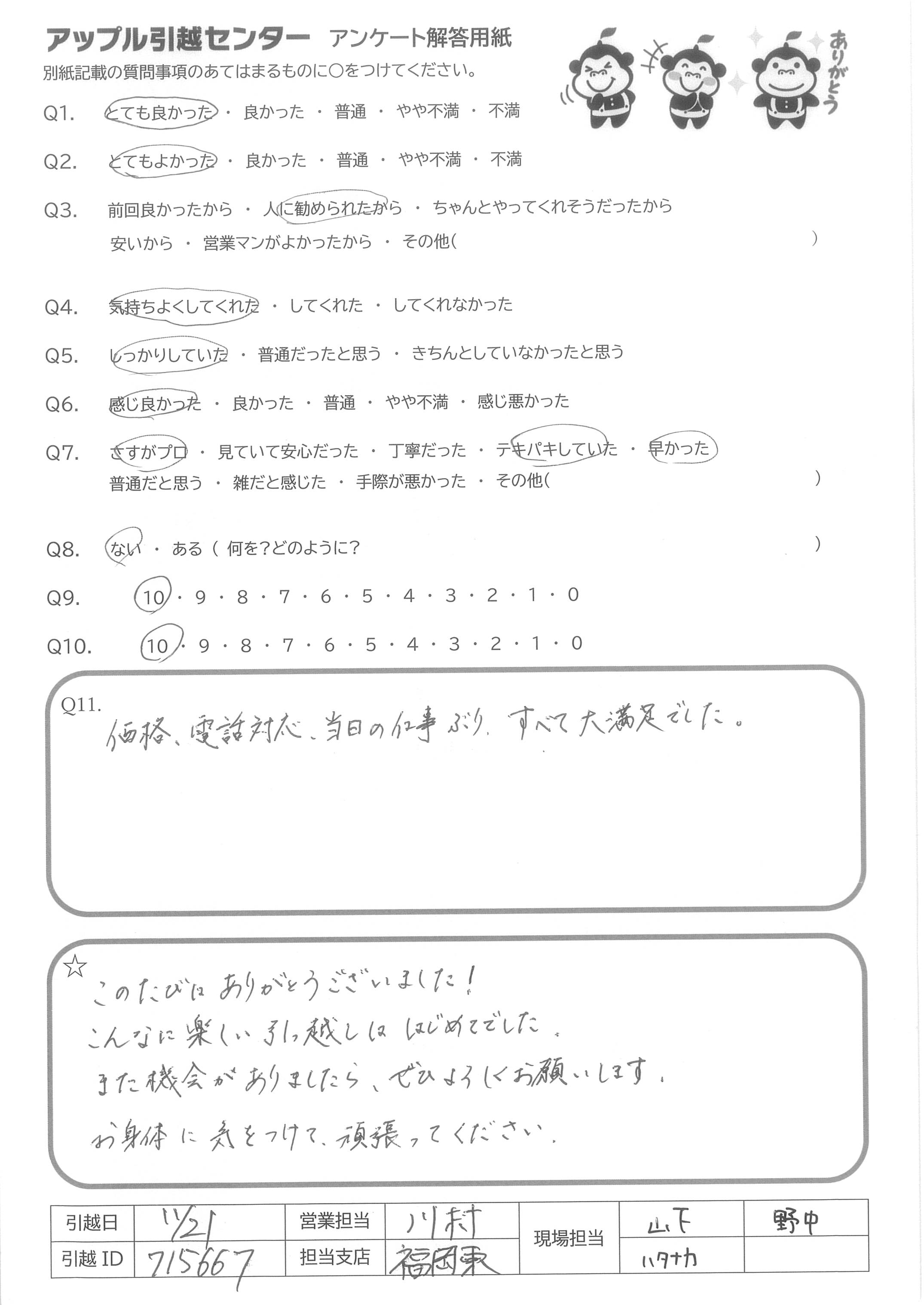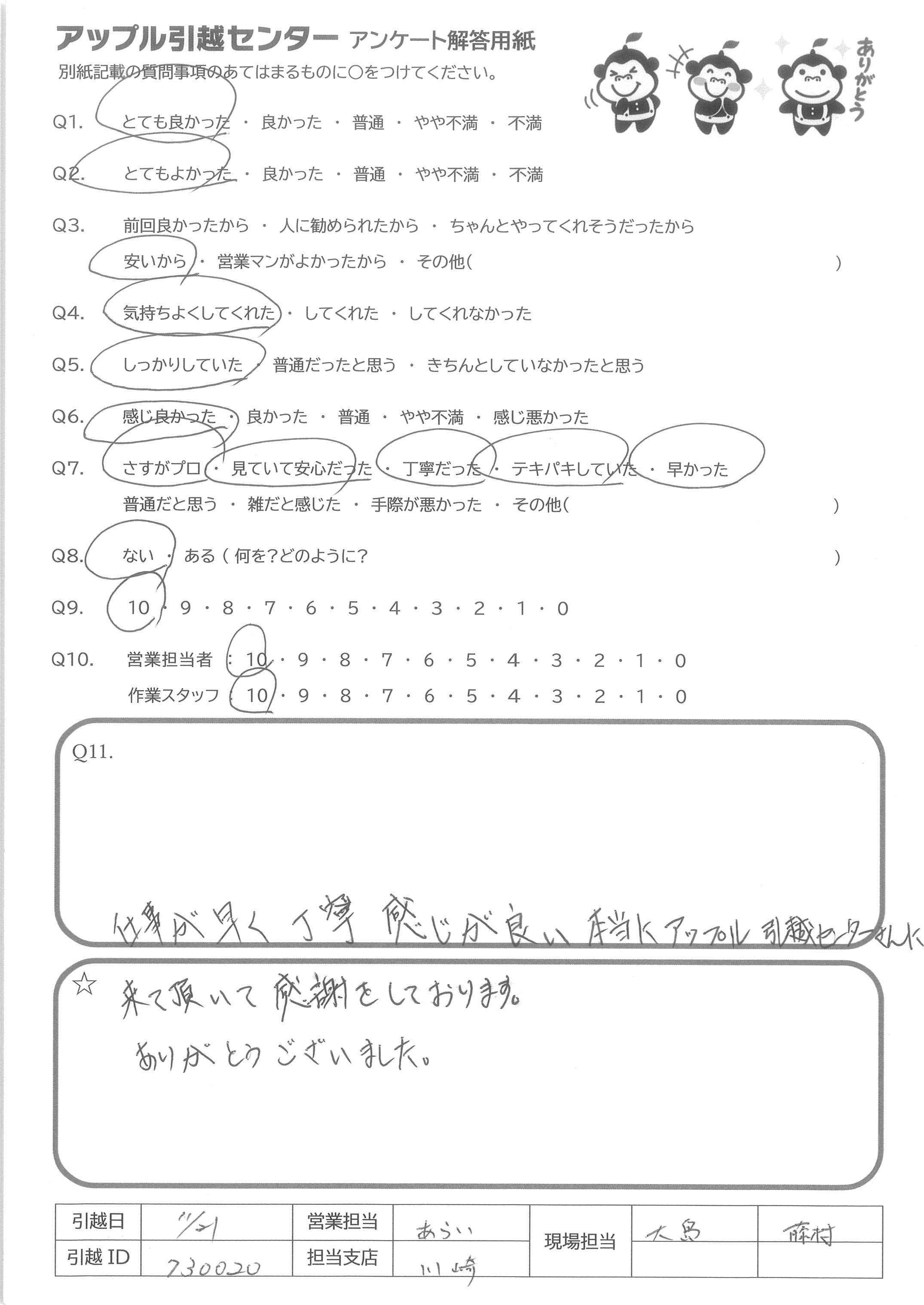 A.まず、引越しをアップルさんに依頼し、出口さんに担当頂き、本当に良かったと思っています。物損はあったものの、当日の丁寧な対応や、その後の電話対応も含めて、信頼のおけるプロの対応だなと感じました。 勿論、担当くださった社員様によって、おそらく多少の開きはあれど、御社として徹底されている企業努力と、社員様の意識の高さが見られた気がしています。 私自身、一企業に勤める身として、普段の対応のひたむきな姿勢と、有事の際の真摯さがあってこそ、ファンになってもらえるのだなと感じました。 また引っ越しの際は御社に依頼したいと思います。 御社の企業体質が継続して良い方向に向かえば、より多くの方に喜んで頂けると思います。ありがとうございました。