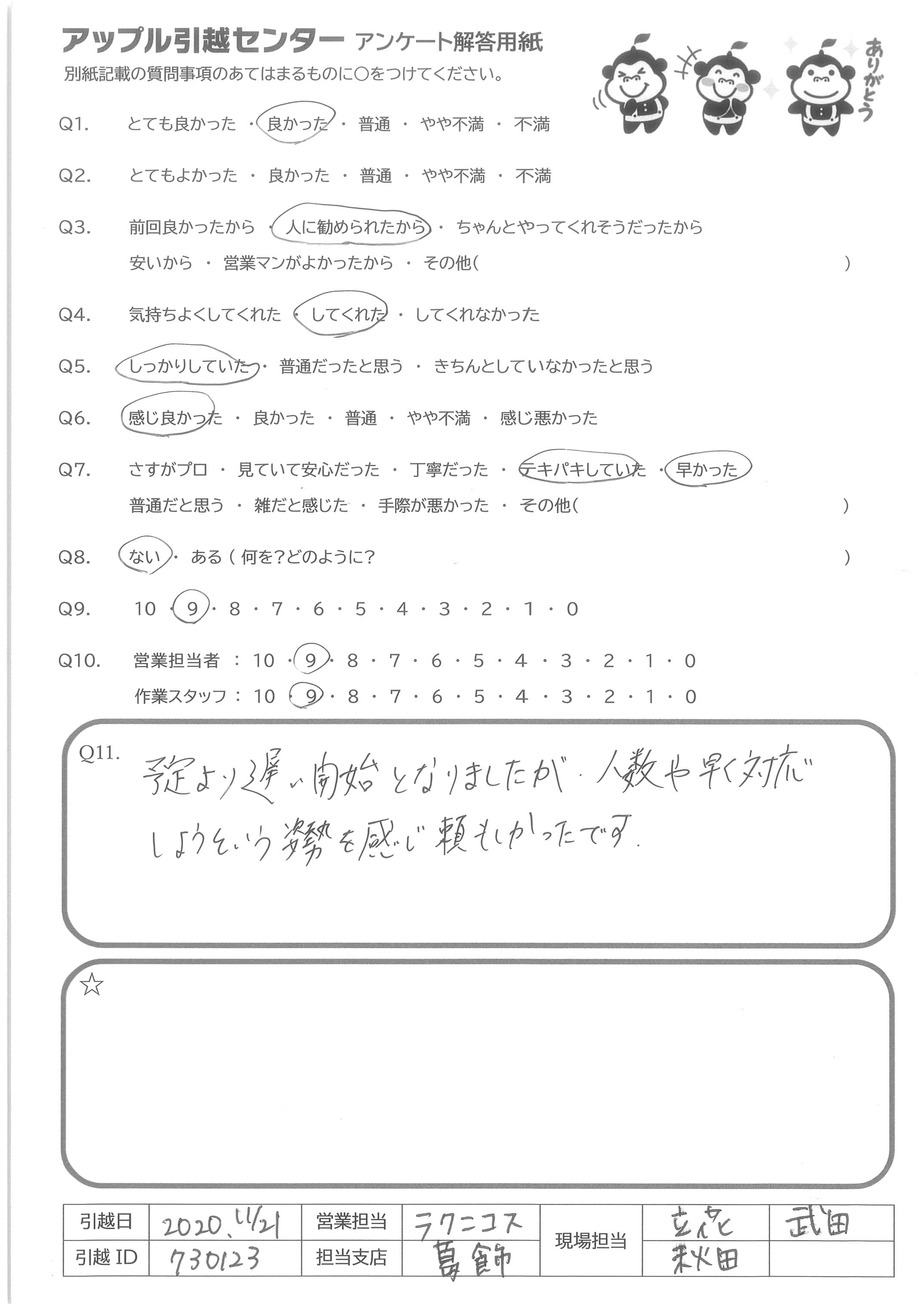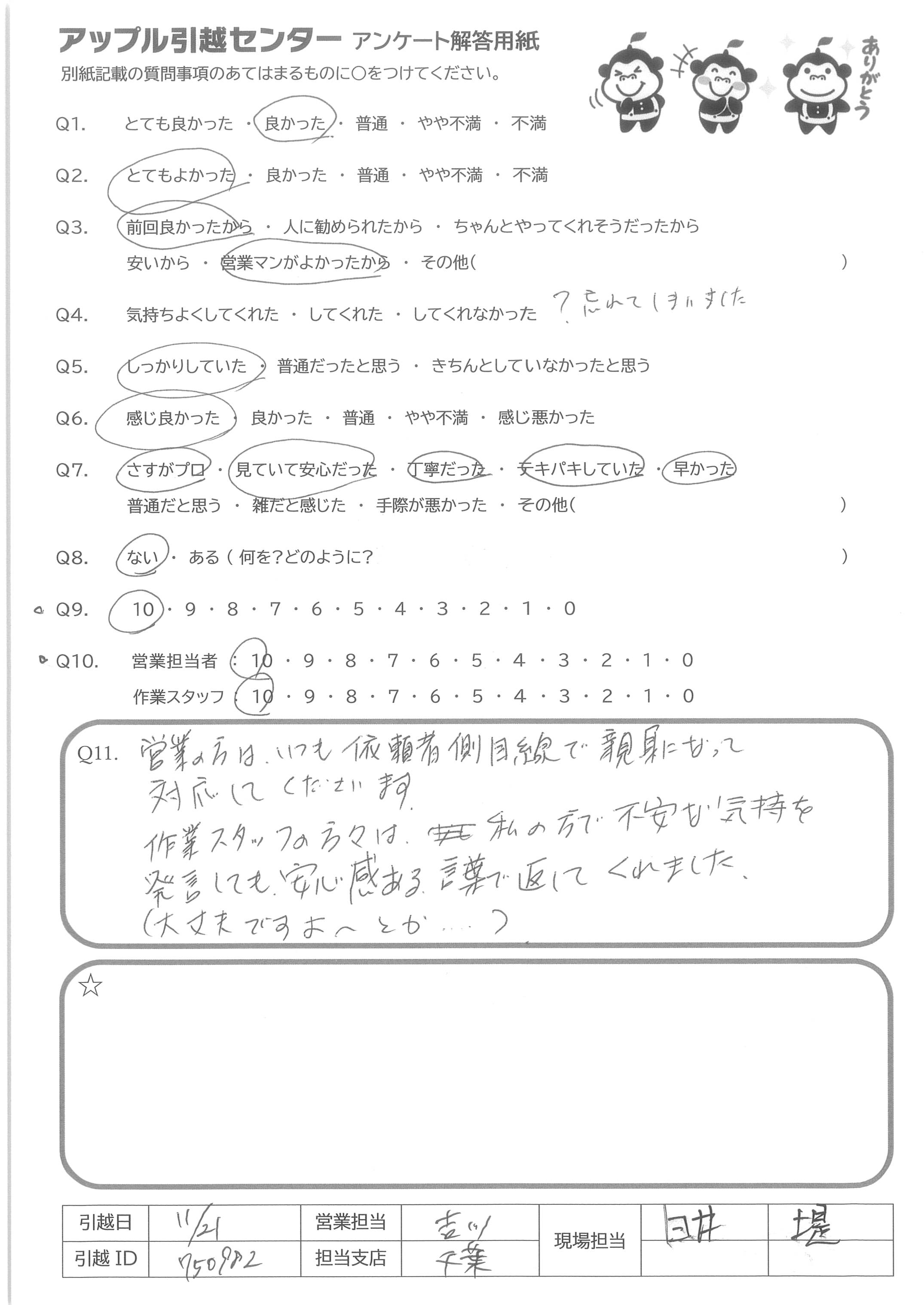 A.当日の引越し作業を担当してくれたスタッフの感じがよく、 対応もすばらしかったので。