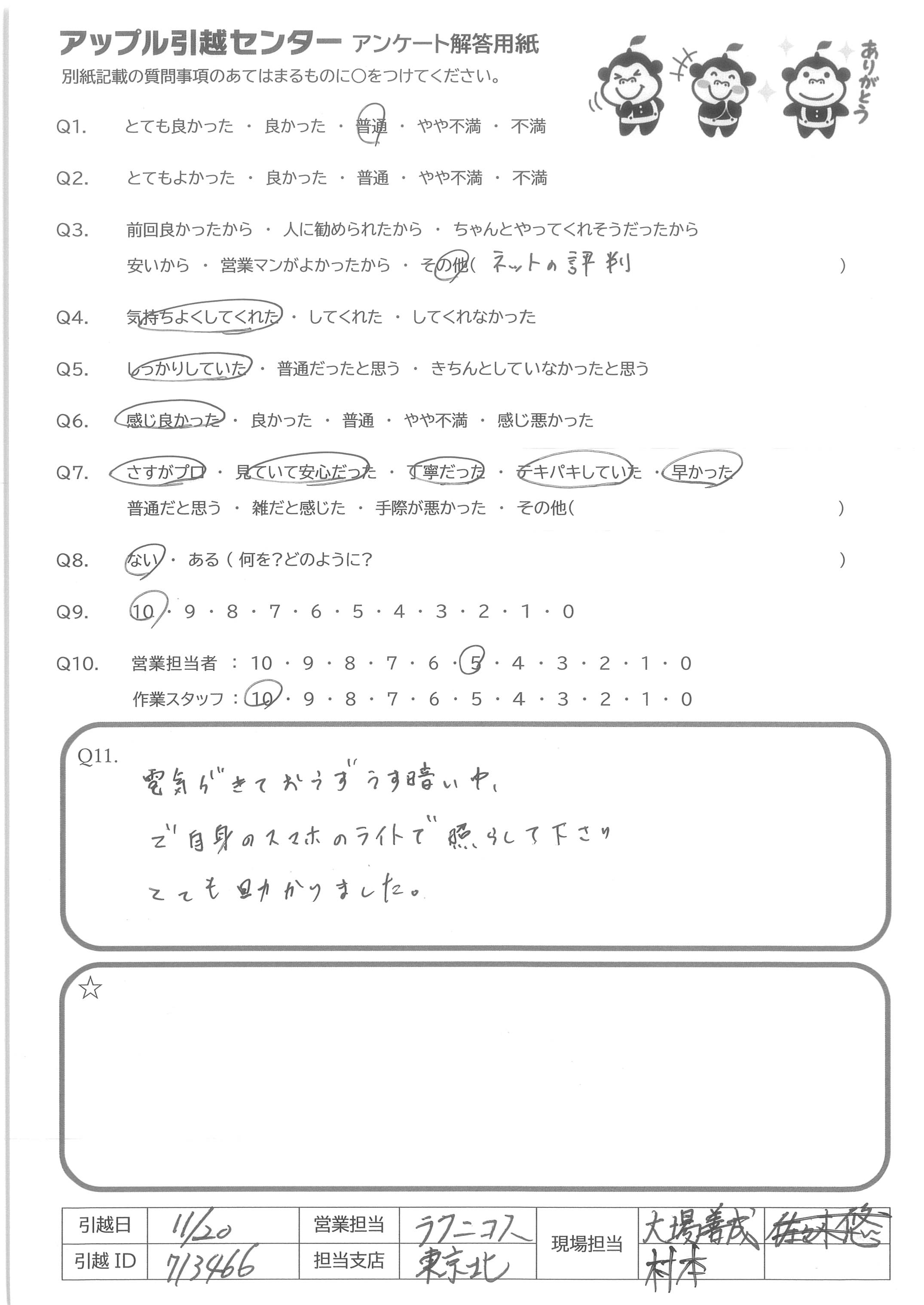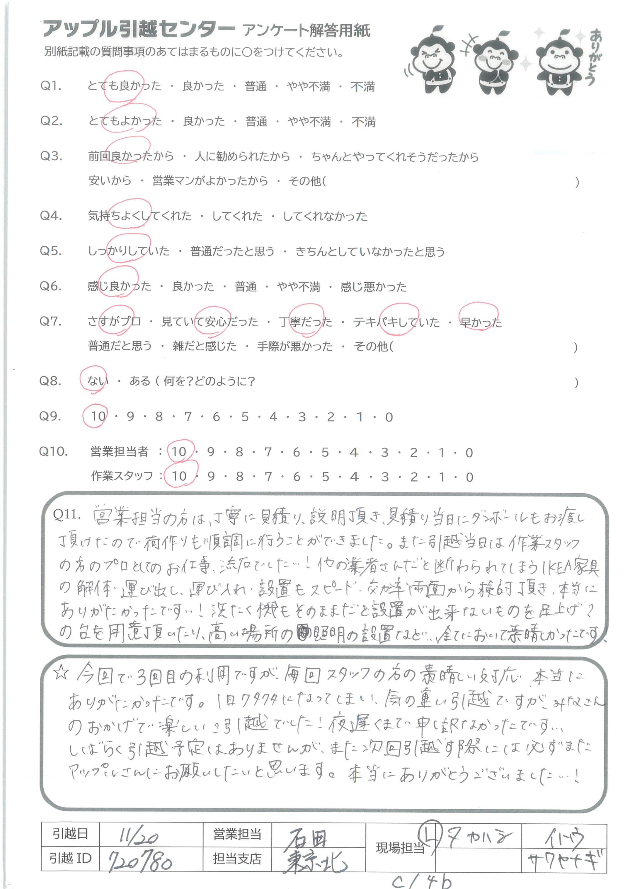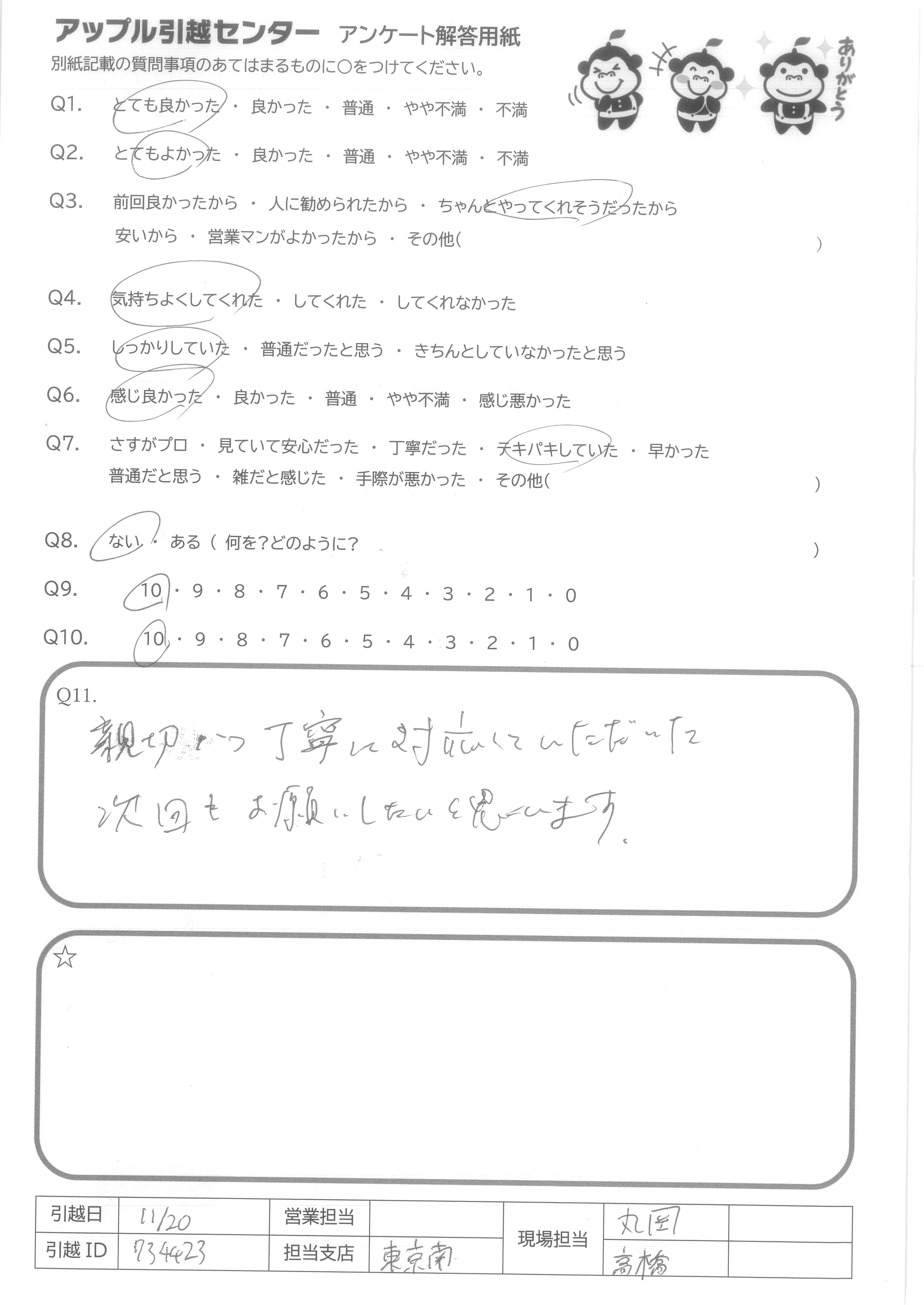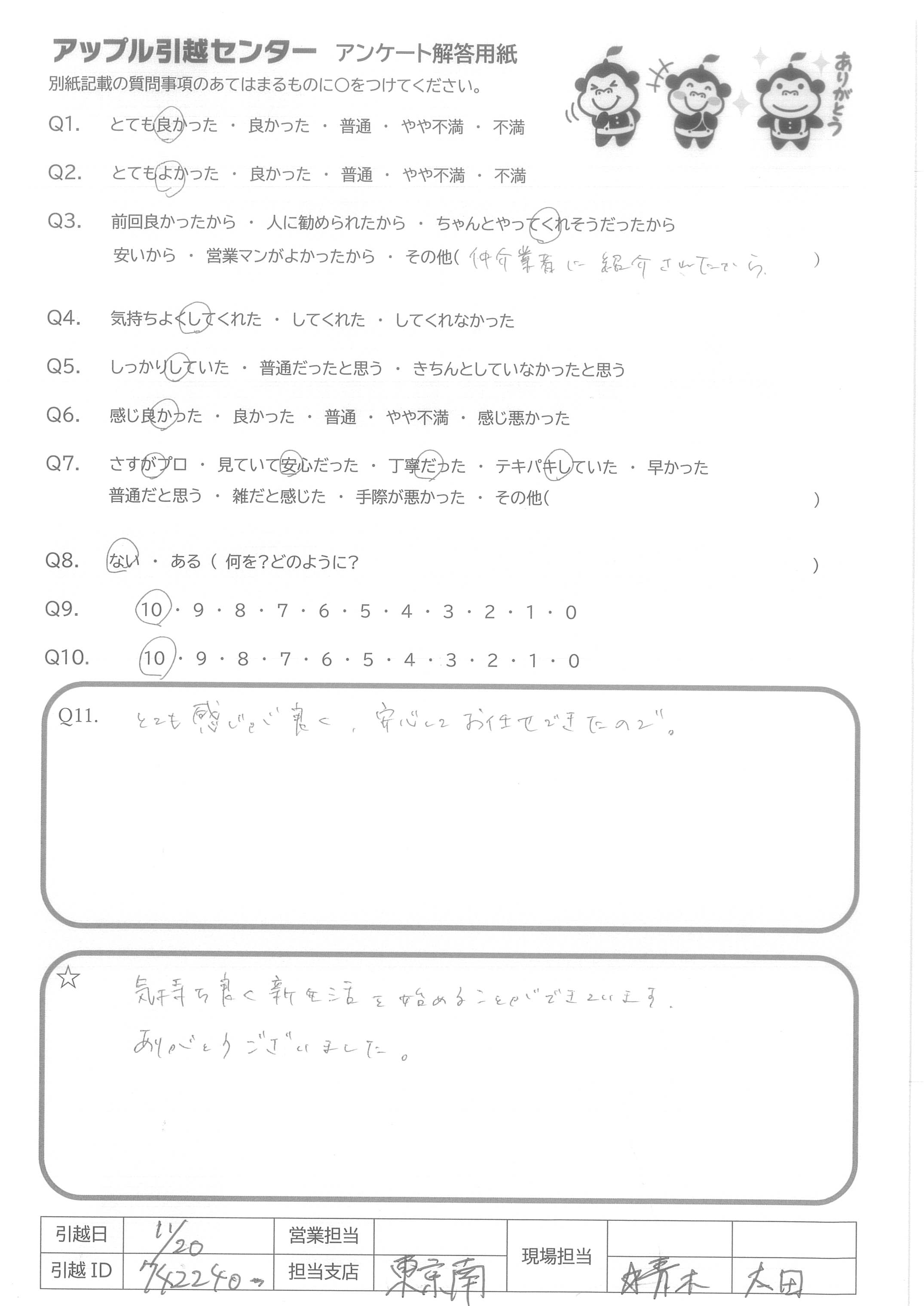A.今回で3回目の利用ですが、毎回スタッフの方の素晴らしい対応、本当に ありがたかったです。1日クタクタになってしまい、気の重い引越ですが、みなさん のおかげで楽しい引越でした!夜遅くまで申し訳なかったです… しばらく引越予定はありませんが、また次回引越す際には必ずまた アップルさんにお願いしたいと思います。本当にありがとうございました!