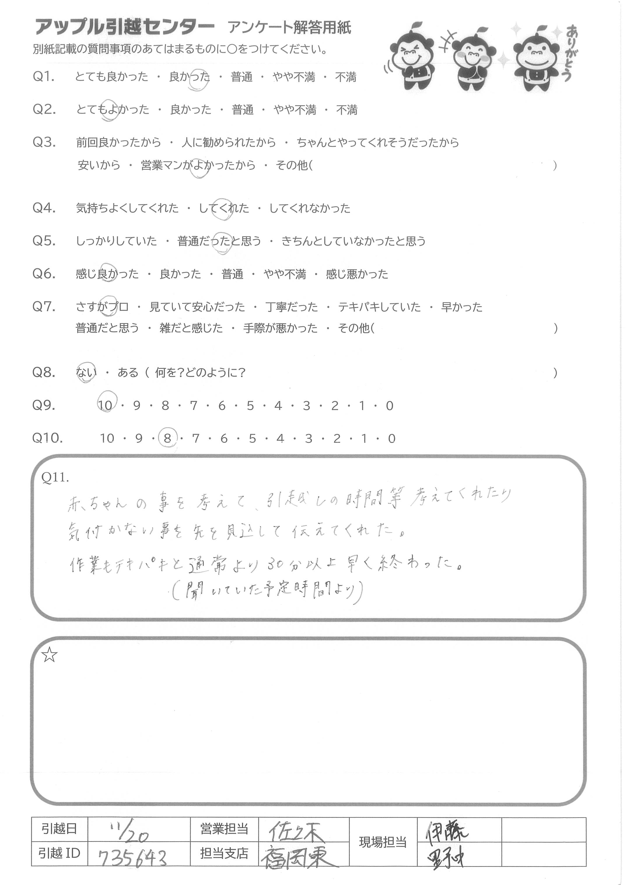 A.赤ちゃんの事を考えて引越しの時間等考えてくれたり 気付かない事を先を見込して伝えてくれた。 作業もテキパキと通常より(聞いていた予定時間より)30分以上早く終わった。
