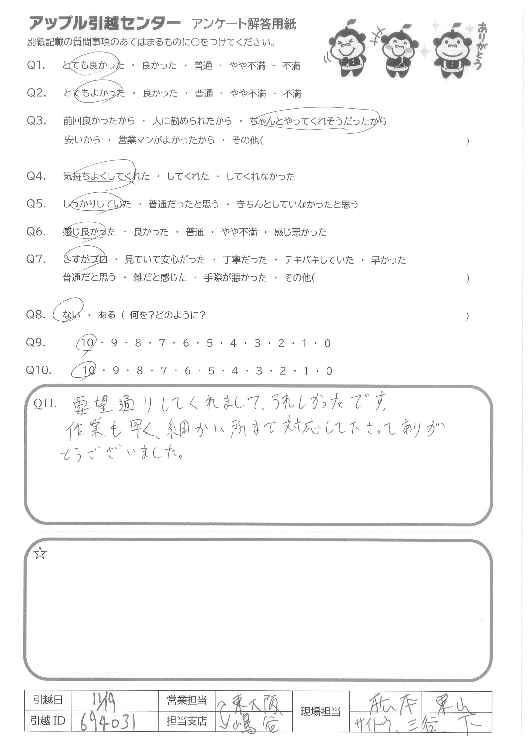 A.安心してお任せすることができました。 ぜひ引っ越しされる方に勧めたいです。 ありがとうございました。