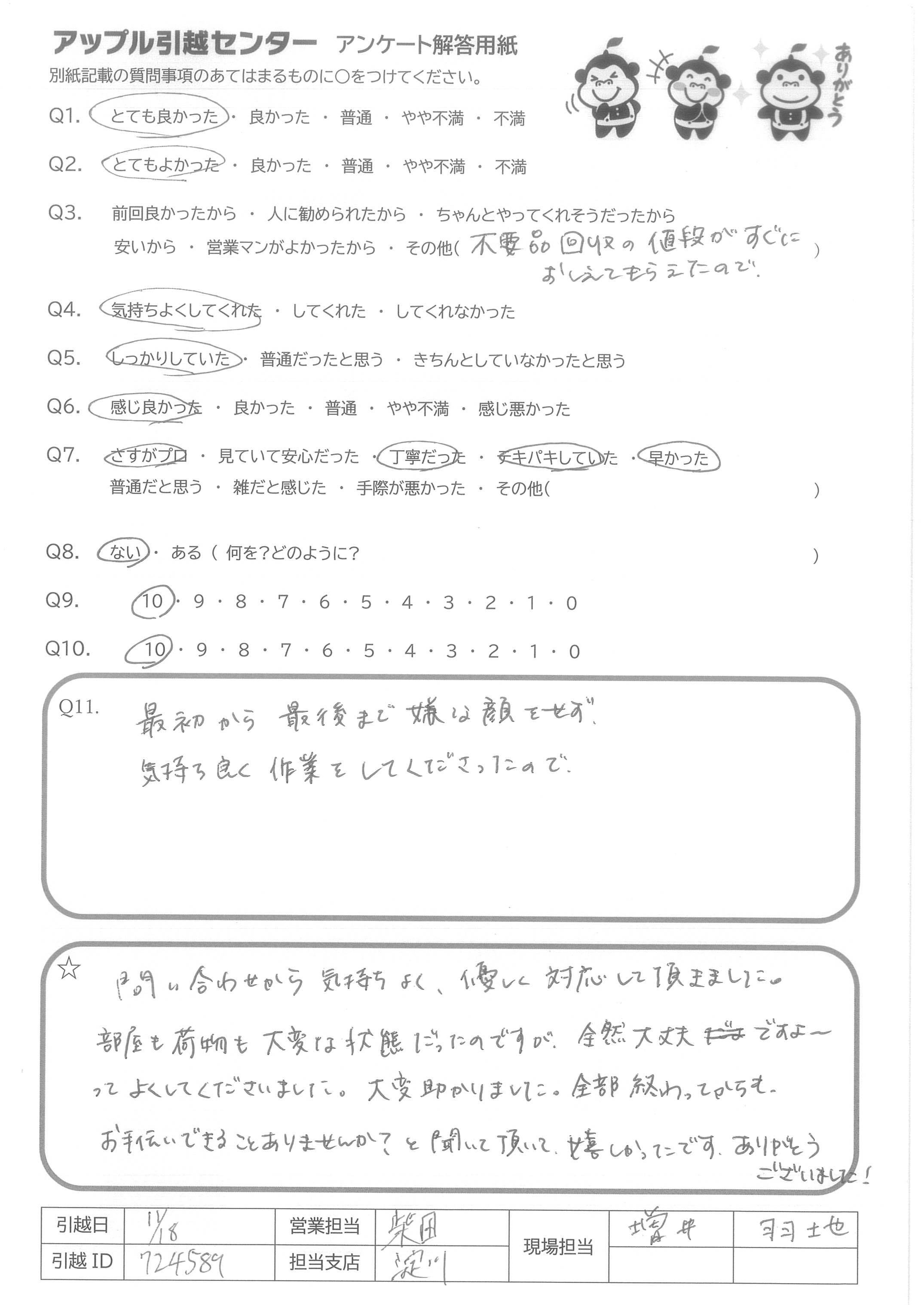 A.とても良い対応をしていただき、アップル引越しセンターに依頼してよかったです。ありがとうございました。