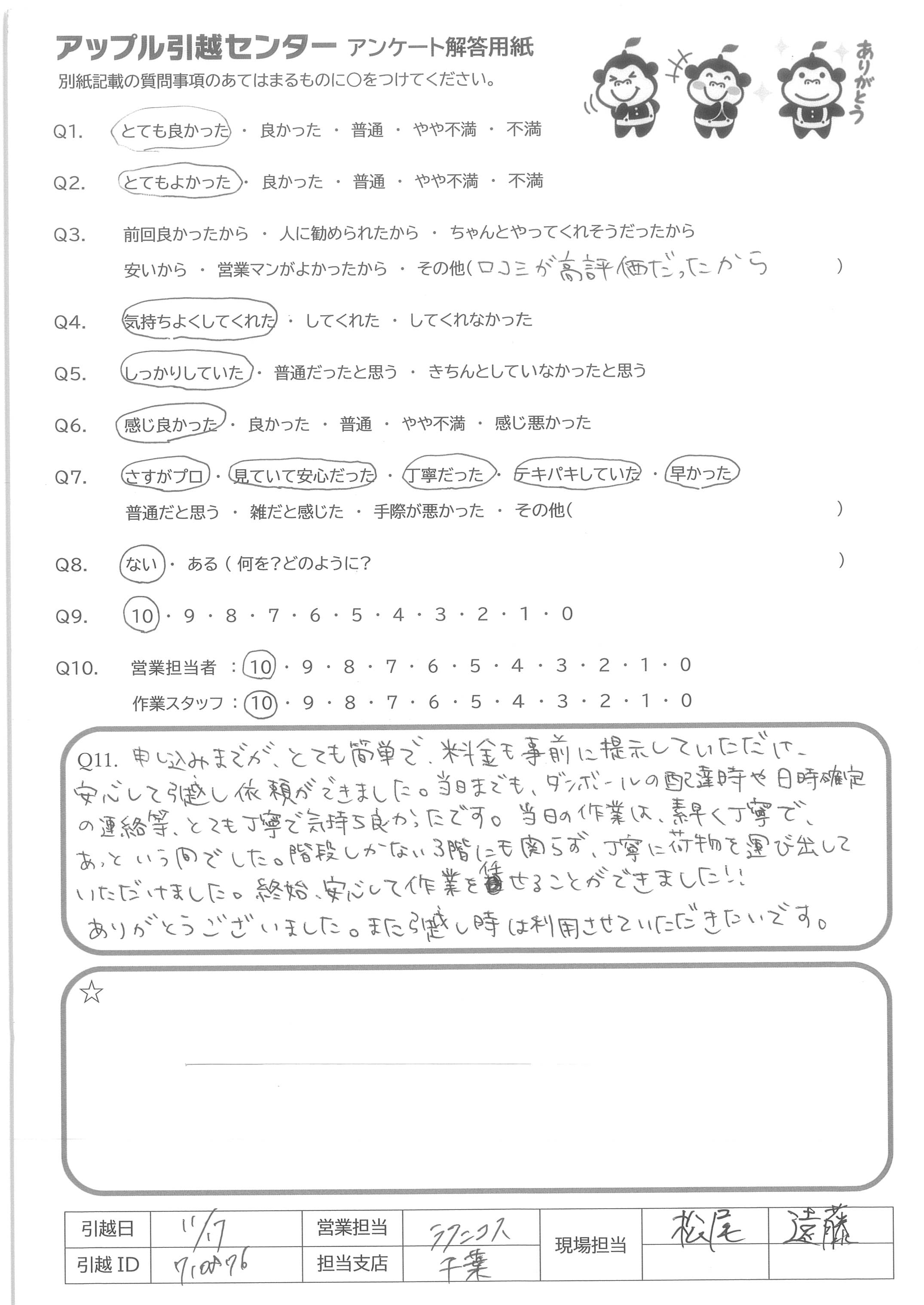 A.細やかな気配りや心配りがあり、対応もテキパキかつ丁寧で、次もアップルさんに頼みたいと思うような対応でした。ありがとうございました。