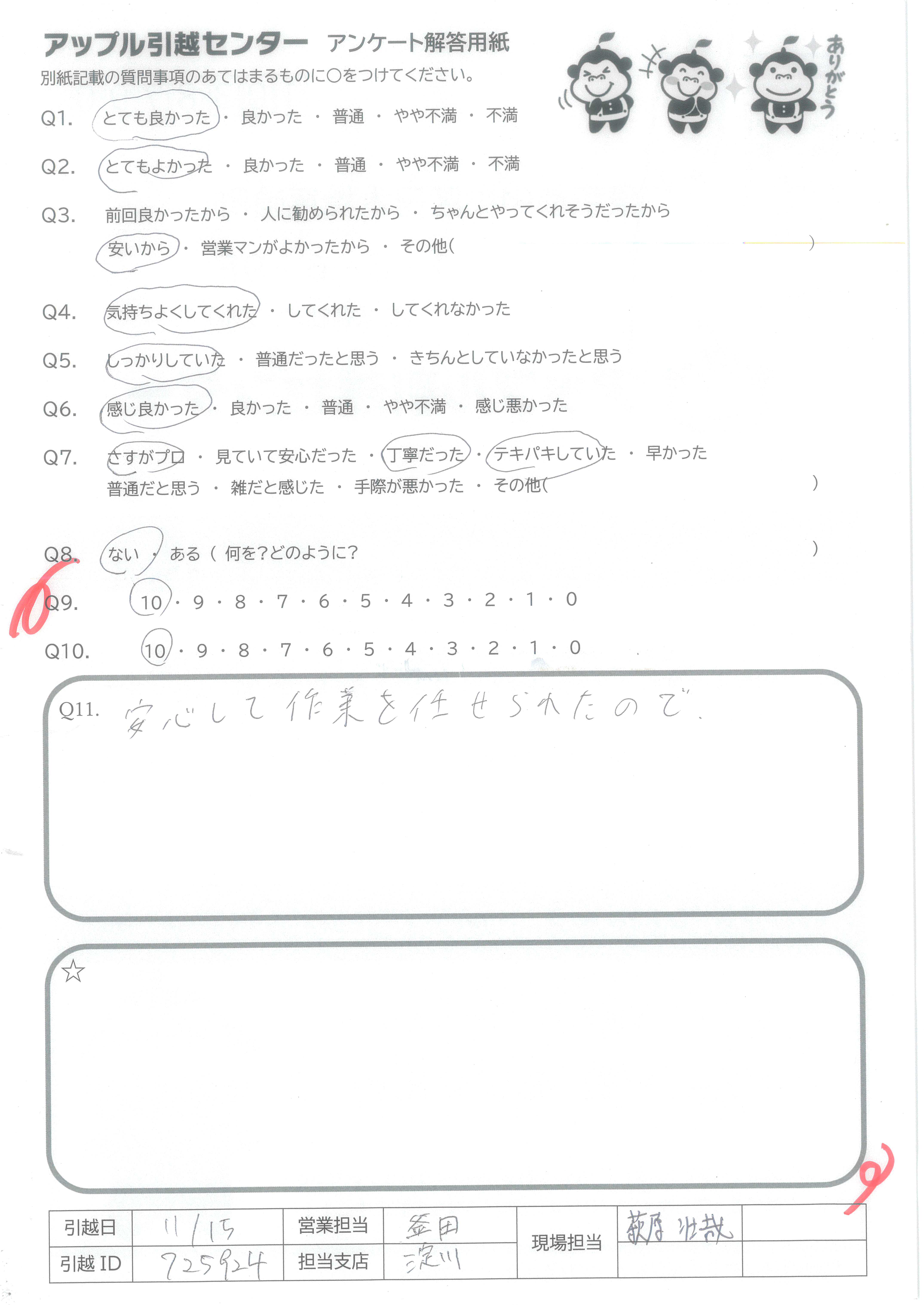 A.初めての引っ越しでしたがアップルさんに頼んでよかったです。荷物詰めも多くて嫌になってきた時もダンボールのキャラクターに励まされました、ありがとうございました お世話になりました。