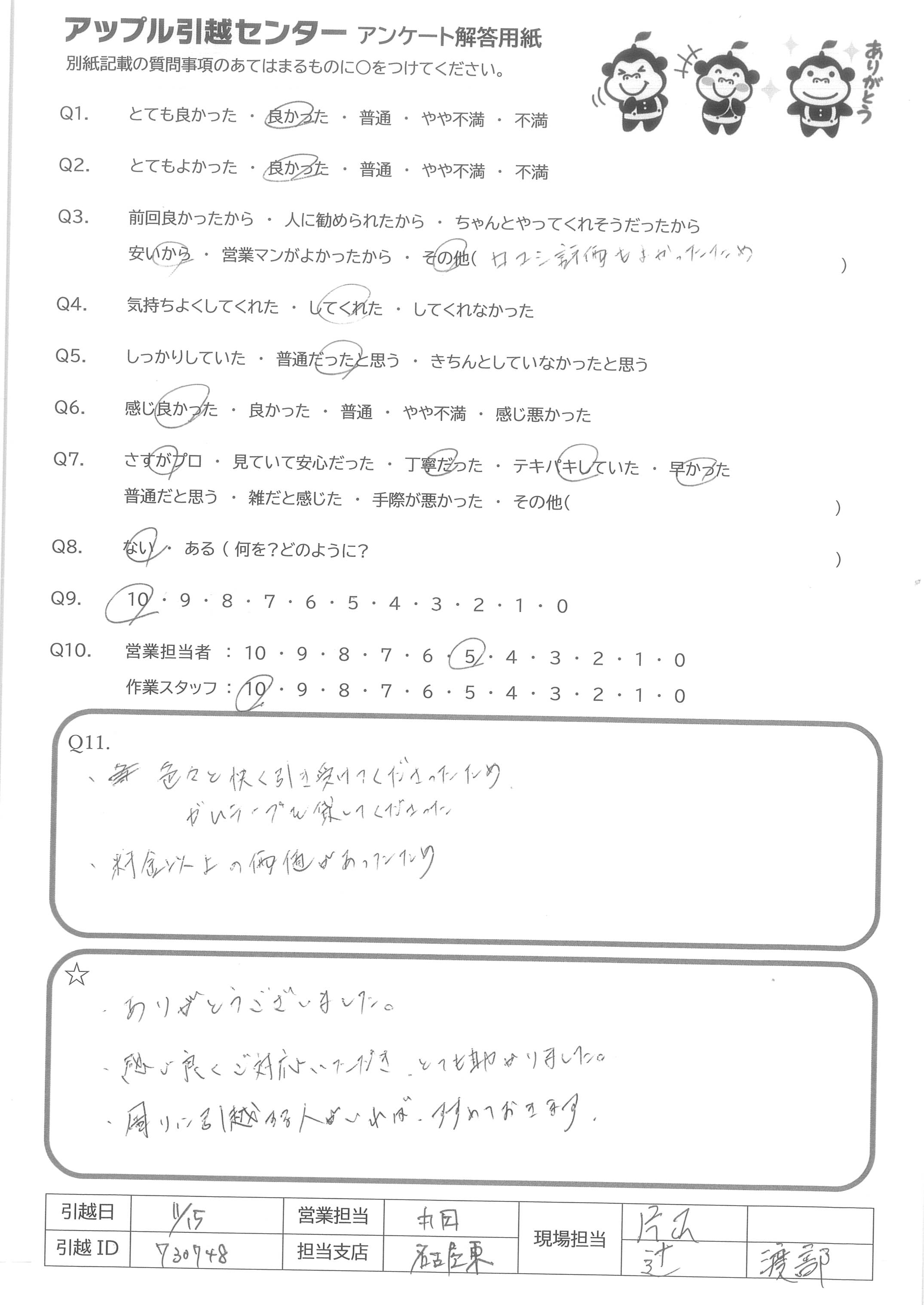 A.当日ご担当して下さった方には大変よくしていただきました。 自分用の布団に風呂敷を入れて荷物を運んで下さったのですか、風呂敷から更に御社の布団袋に入れていたが確認不足でしたが、荷物を新居に入れて片付けをしている時に風呂敷に赤い汚れが付いていたのが残念でした。 あと、オプションで盗聴器をお願いしてましたがこちらもすっかり忘れていて、(帰られた後に気づき…。)お願いして頂いたのにも関わらずこちらも残念でした。 その他は全体的にはとてもスピーディに動いて下さったので良かったです。