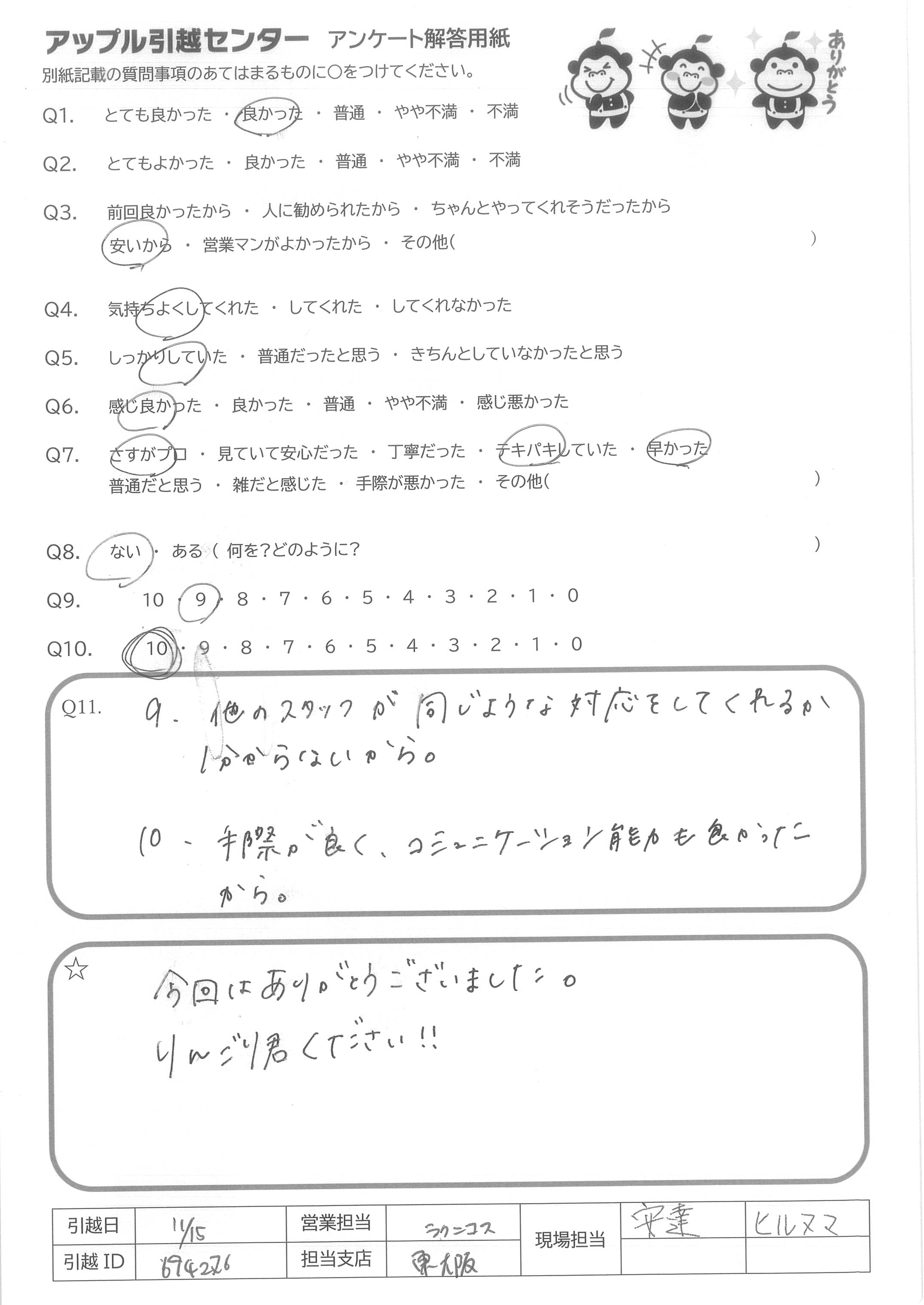 引越し日:2020年11月15日 エリア:大阪府東大阪市