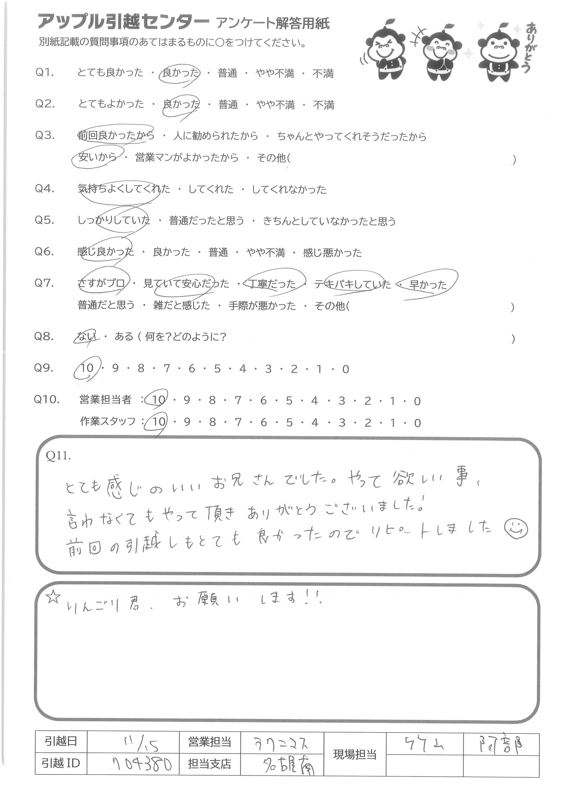 A.↓下の欄にクレームを書きましたが Q9.価格が安い、スタッフの感じが良い為 Q10.主要メンバーが遅れている為、最初に来られた「網島さん?」(※自己紹介がなかった為お名前が当っているか分かりませんが・・・)がとても感じ良く笑顔で一人でテキパキと、この方は丁寧に次から次へと荷物を運びだし、さすがプロだなと感じました。 後からヘルプで来られた「松本さん?」はいちいち発言が面白くて、たくさん笑わせて頂きました。 現場スタッフの皆さん、テキパキと仕事して頂きありがとうございました。