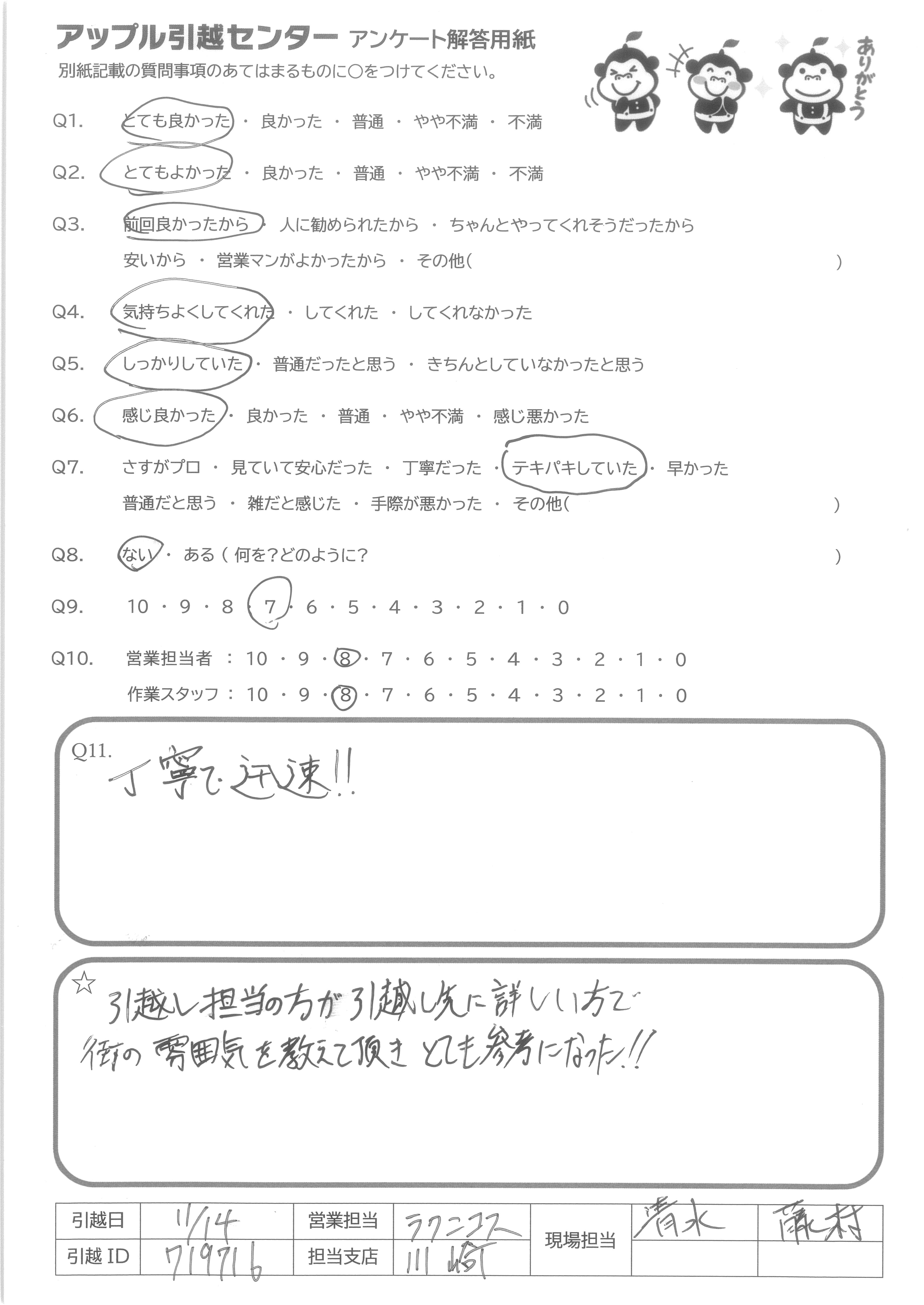 A.とても素早く感じ良く、丁寧に対応して頂き、気持ち良く引越しができました。