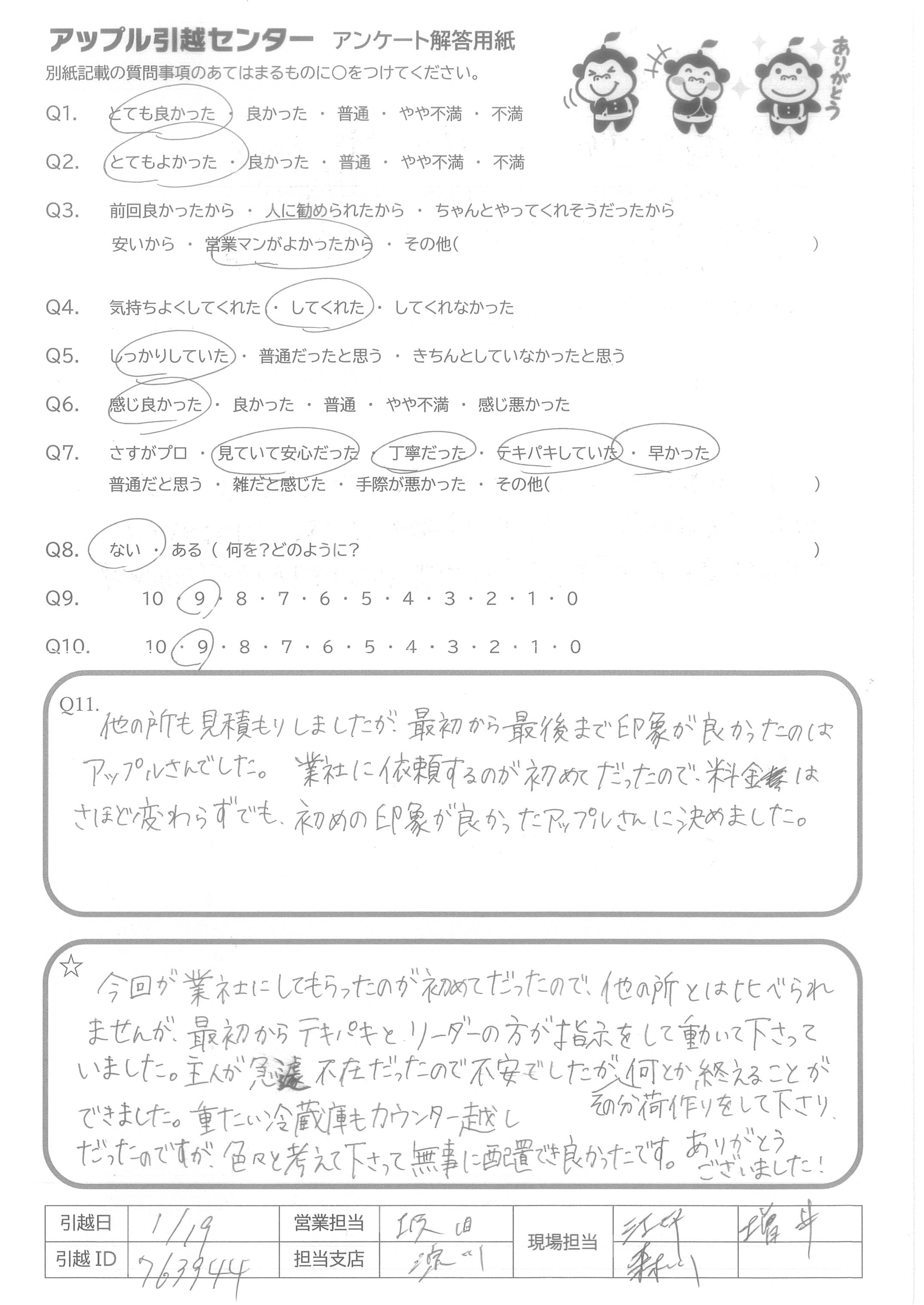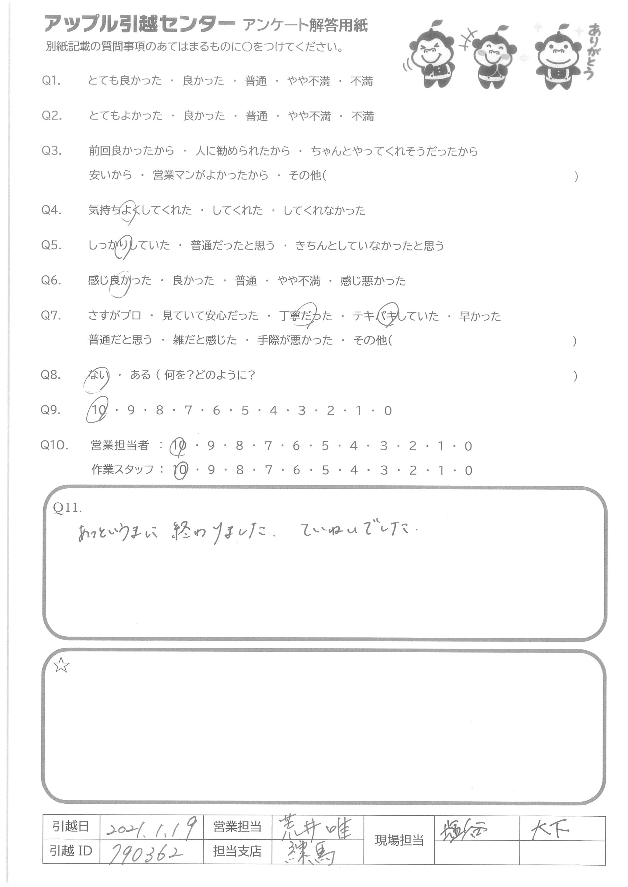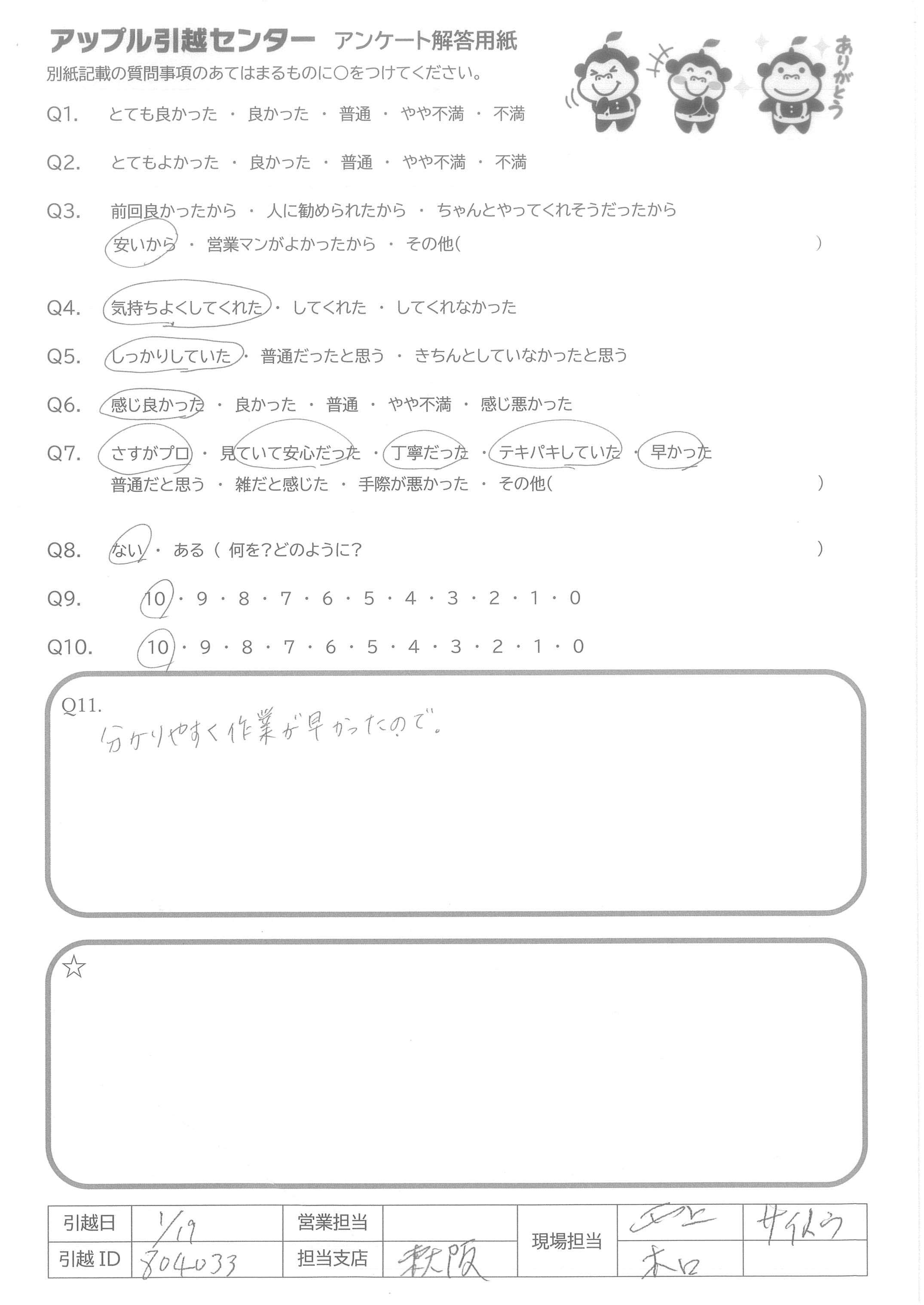 A.2年前の引越しの時、作業して頂いた方(2人)がとてもテキパキしていて作業が早かったので本当に良くて、今回の引越しもアップルさんでお願いしました。比較してしまってすみません。ありがとうございました。