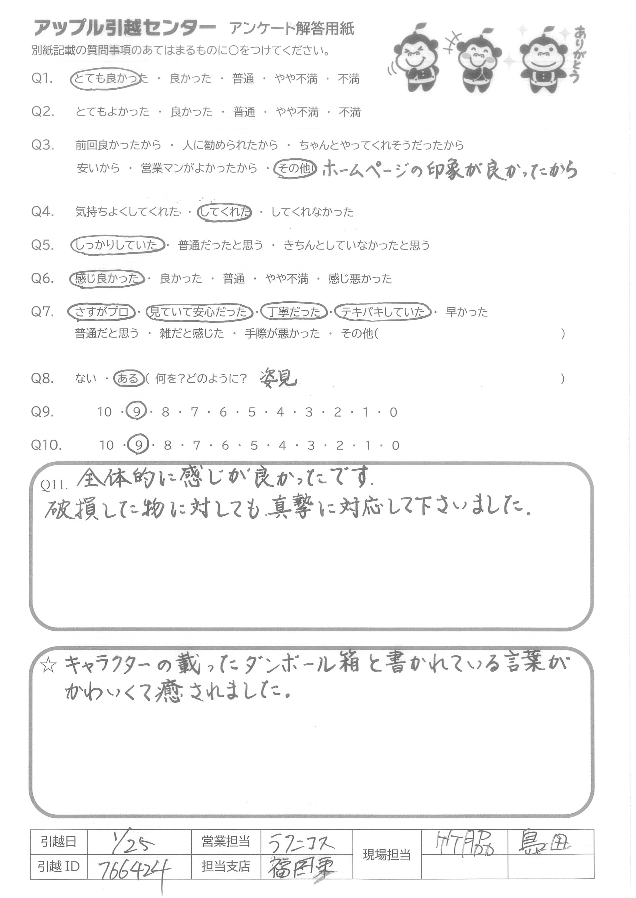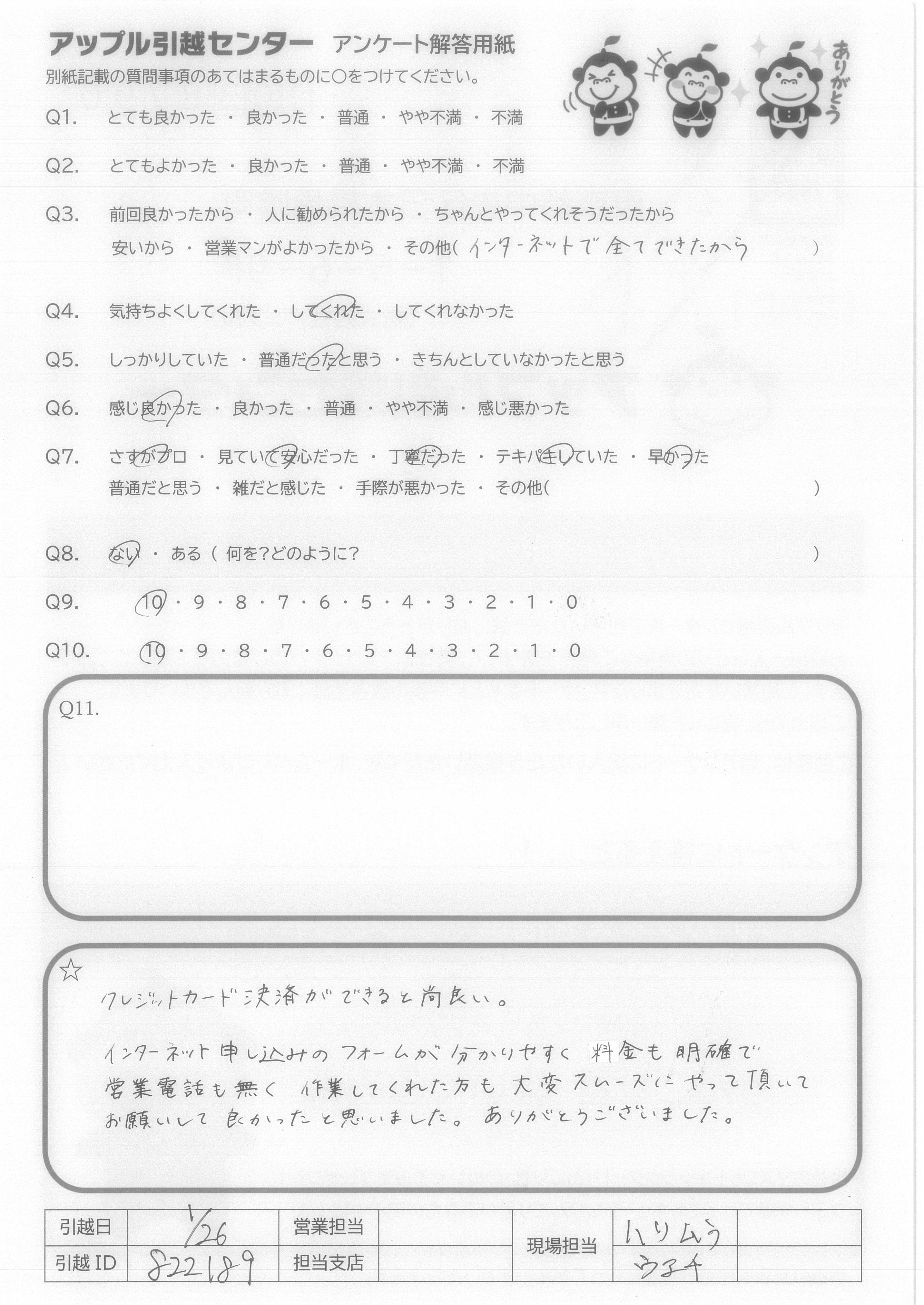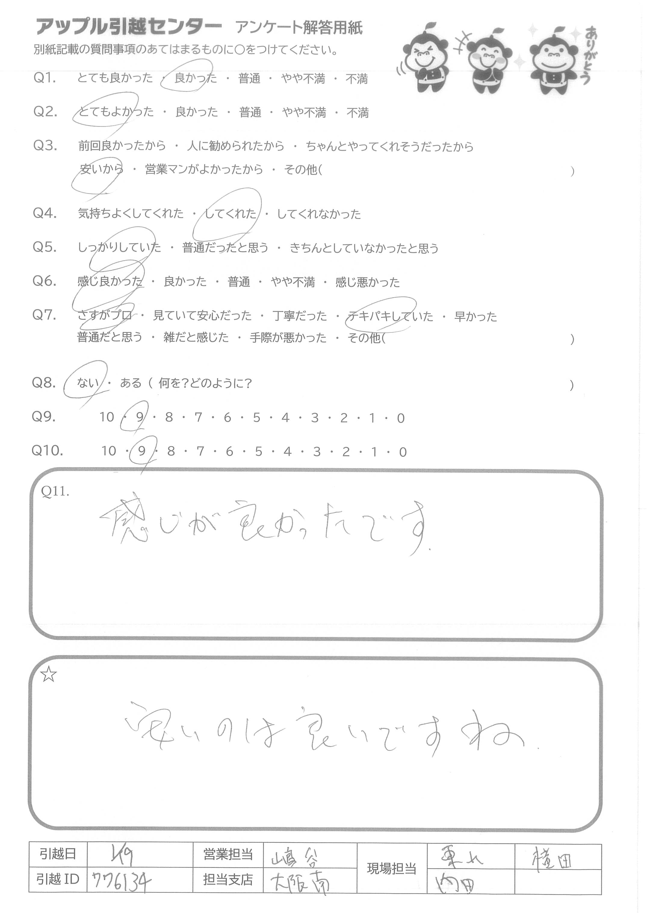 A.2年前の引越しの時、作業して頂いた方(2人)がとてもテキパキしていて作業が早かったので本当に良くて、今回の引越しもアップルさんでお願いしました。比較してしまってすみません。ありがとうございました。