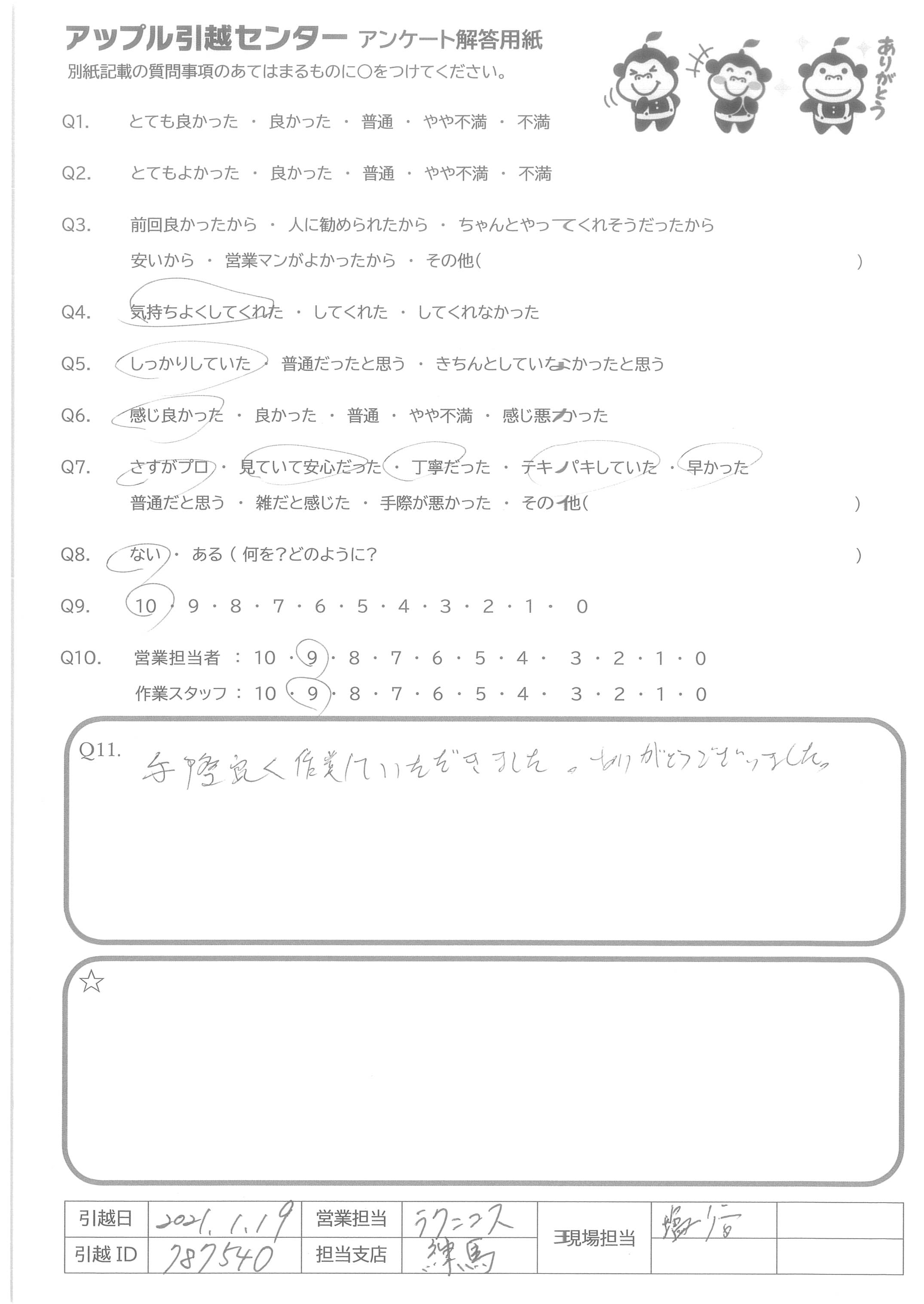 引越し日:2021年01月18日 エリア:神奈川県横浜市港北区