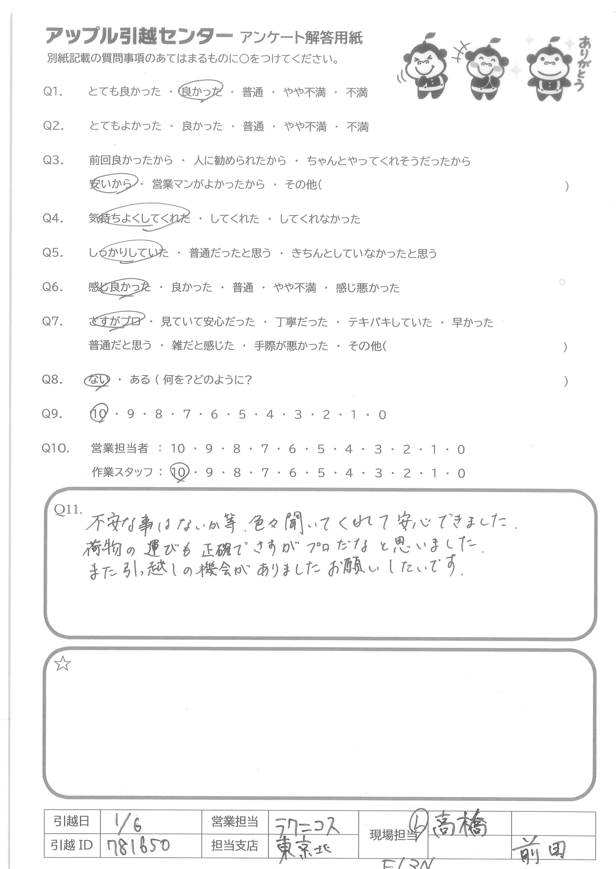 A.本当にありがとうございました。☆1点提案ですが、ドライバー・スタッフさんも「名刺」を持てばよろしいかと思いました。スタッフさんと若干話しをしましたが(手を休めずに)、いろいろ参考になることも聞けましたよ。セールスドライバー・セールススタッフとして、顧客の次回引越しや、知人への紹介などにつなぐ営業活動も担うとよろしいかと思いました。ともかくありがとうございました。