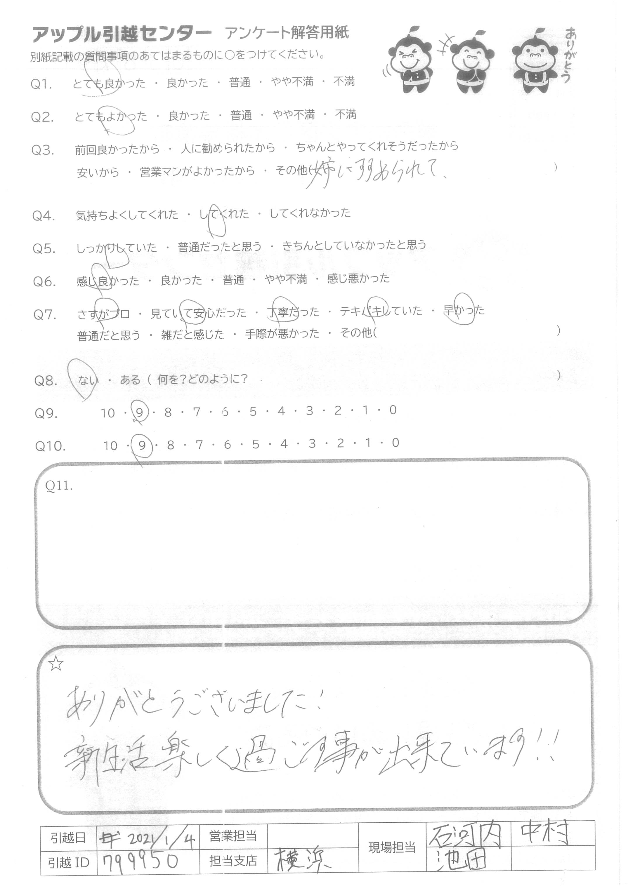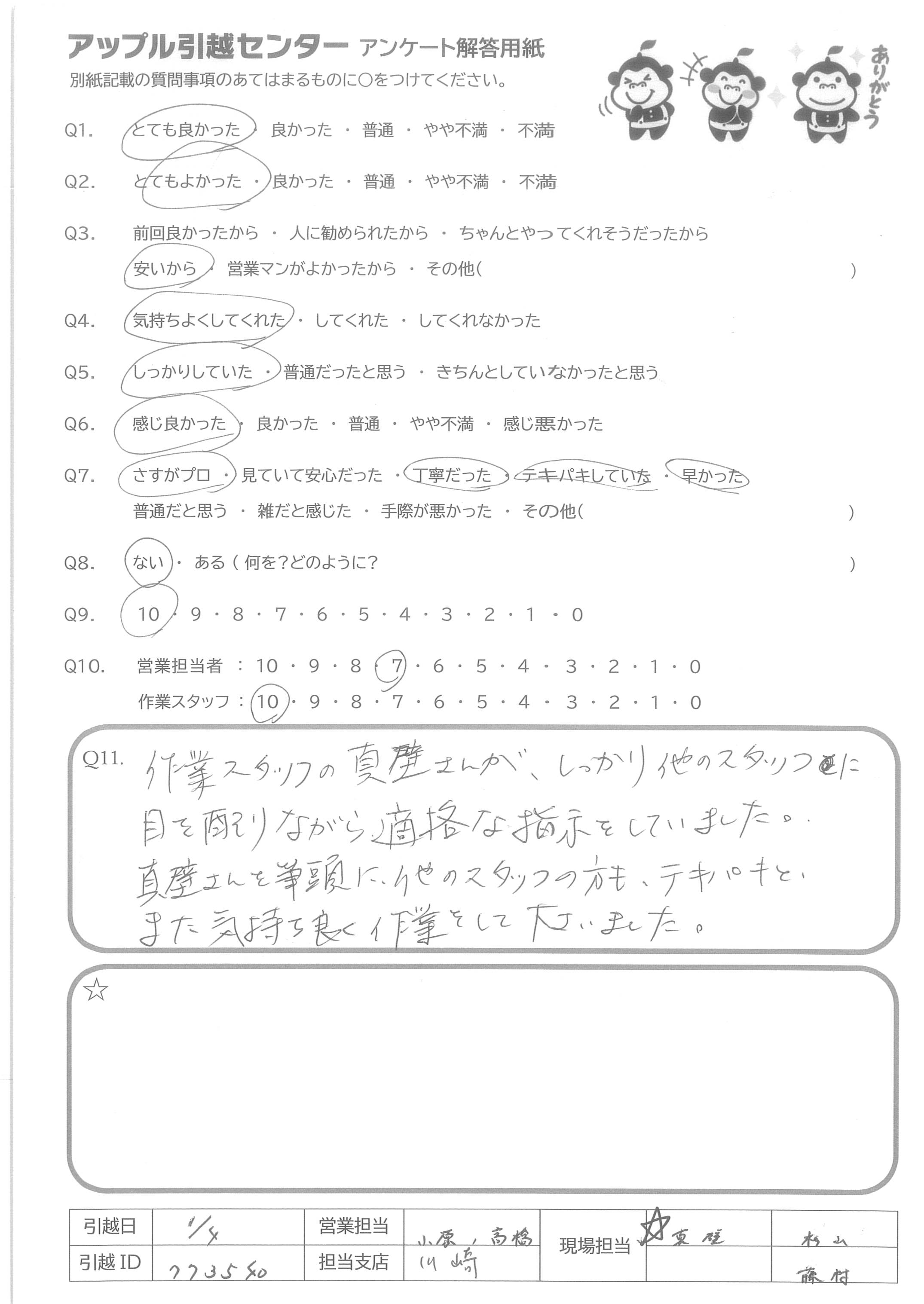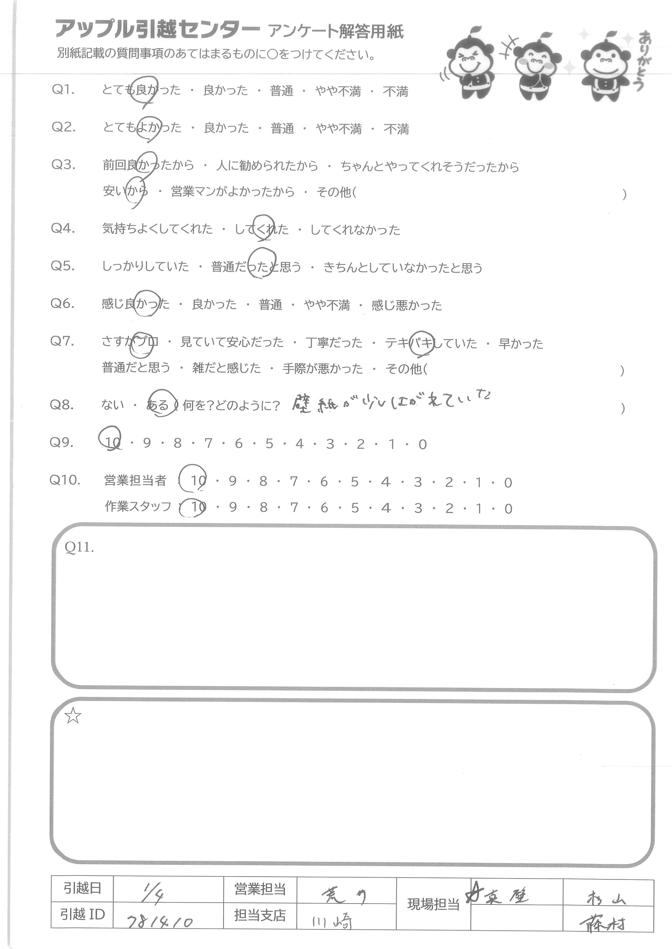 A.Q9:コストパフォーマンスが非常に良いと感じたため。 Q10営:電話対応がとても良かった。 作:搬入しづらい場所にも関わらず、嫌な顔せず作業していただけました。作業完了後の「何か手伝えることありますか?」一言にとても親切心を感じました。