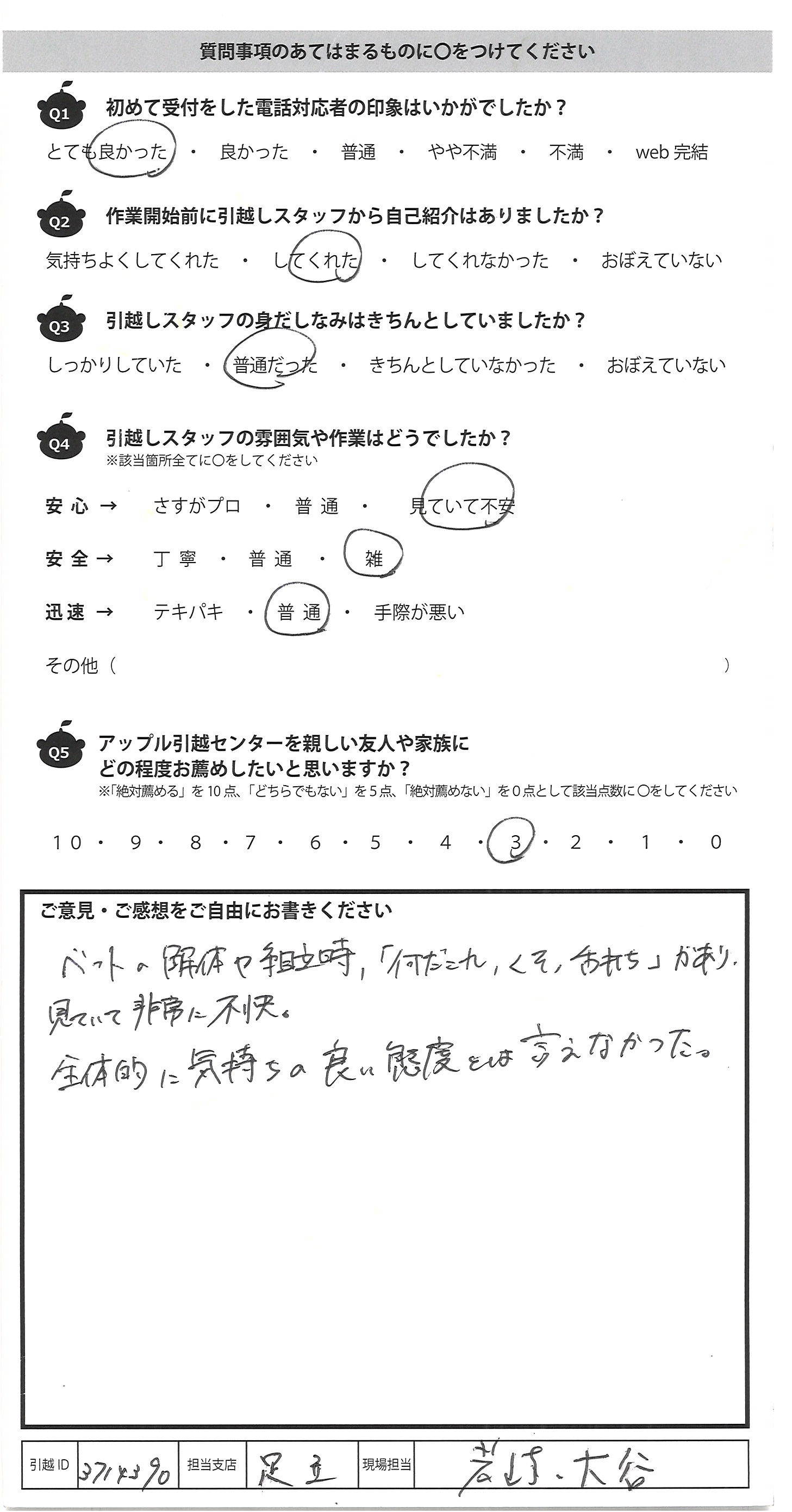 A.ベットの解体や組立時、「何だこれ、くそ、舌打ち」があり 見ていて非常に不快。 全体的にい気持ちの良い態度とは言えなかった。