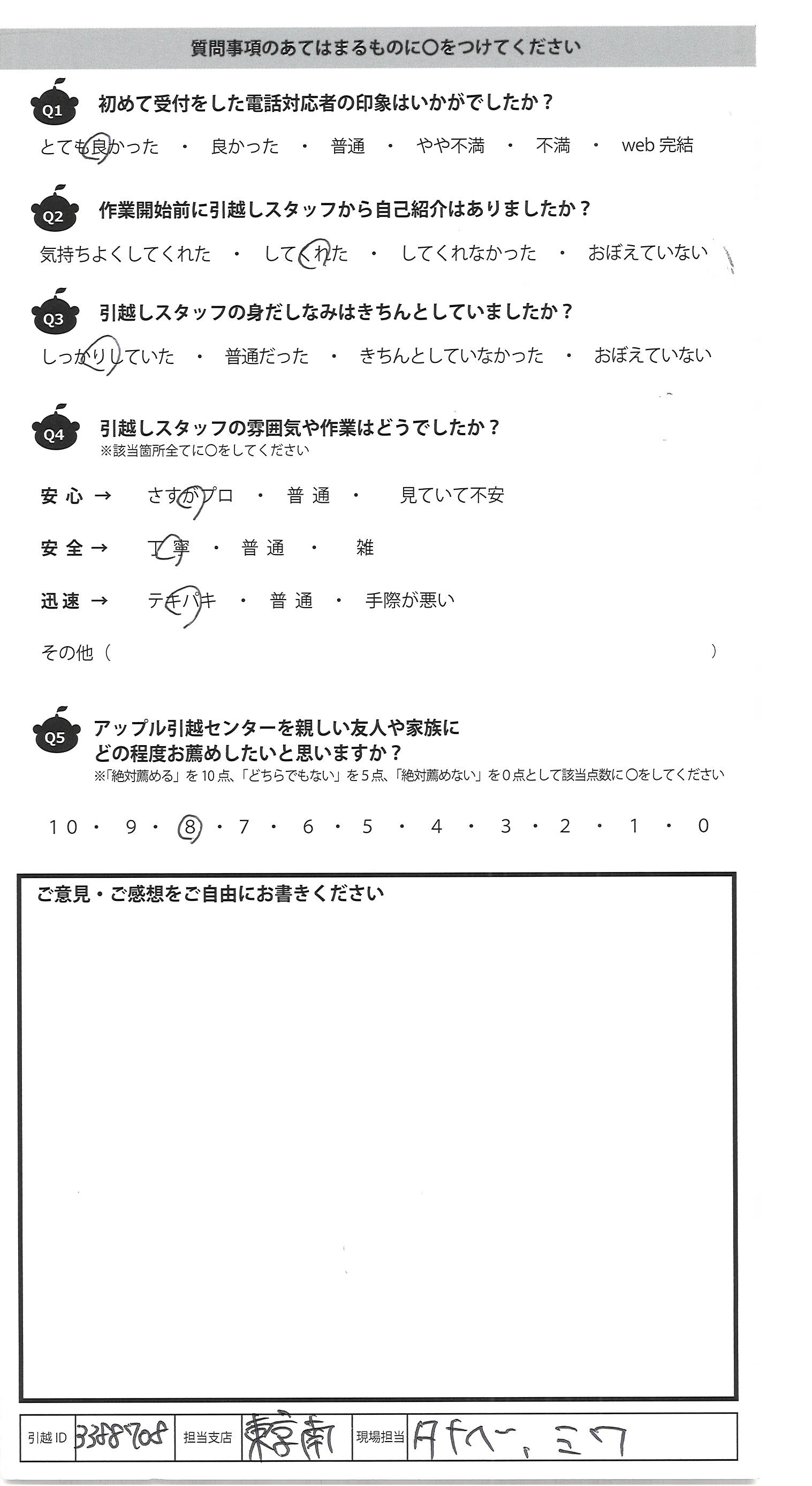 A.以前、会社の後輩の引越しを手伝った際に、アップルさんの対応が素晴らしいと感じ、 今回自分の引越しも依頼させていただきました。 私の準備が不十分でご迷惑お掛けした際にも、嫌な顔1つせず対応してくださり 新居でも家具の配置も教えて下さったり、ホスピタリティが素晴らしすぎました! 雨の中の作業本当にありがとうございました! また依頼させていただきます!