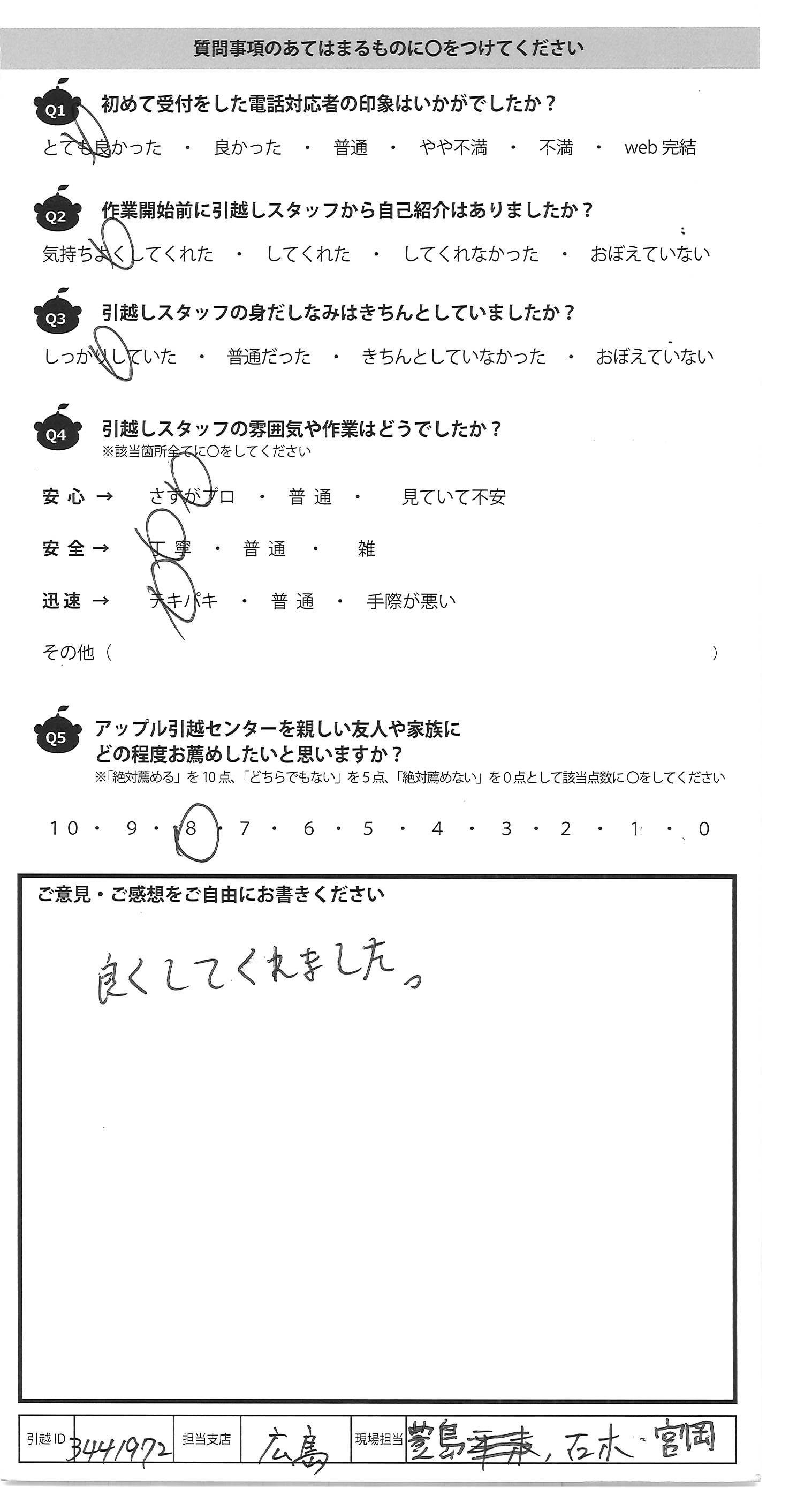 A.対応ありがとうございました! 柿本さんは、運搬するだけではなく、 家具、家電などに対し知識が豊富で、 色々助かりました! 今後も、機会があったら またアップルを利用したいです!