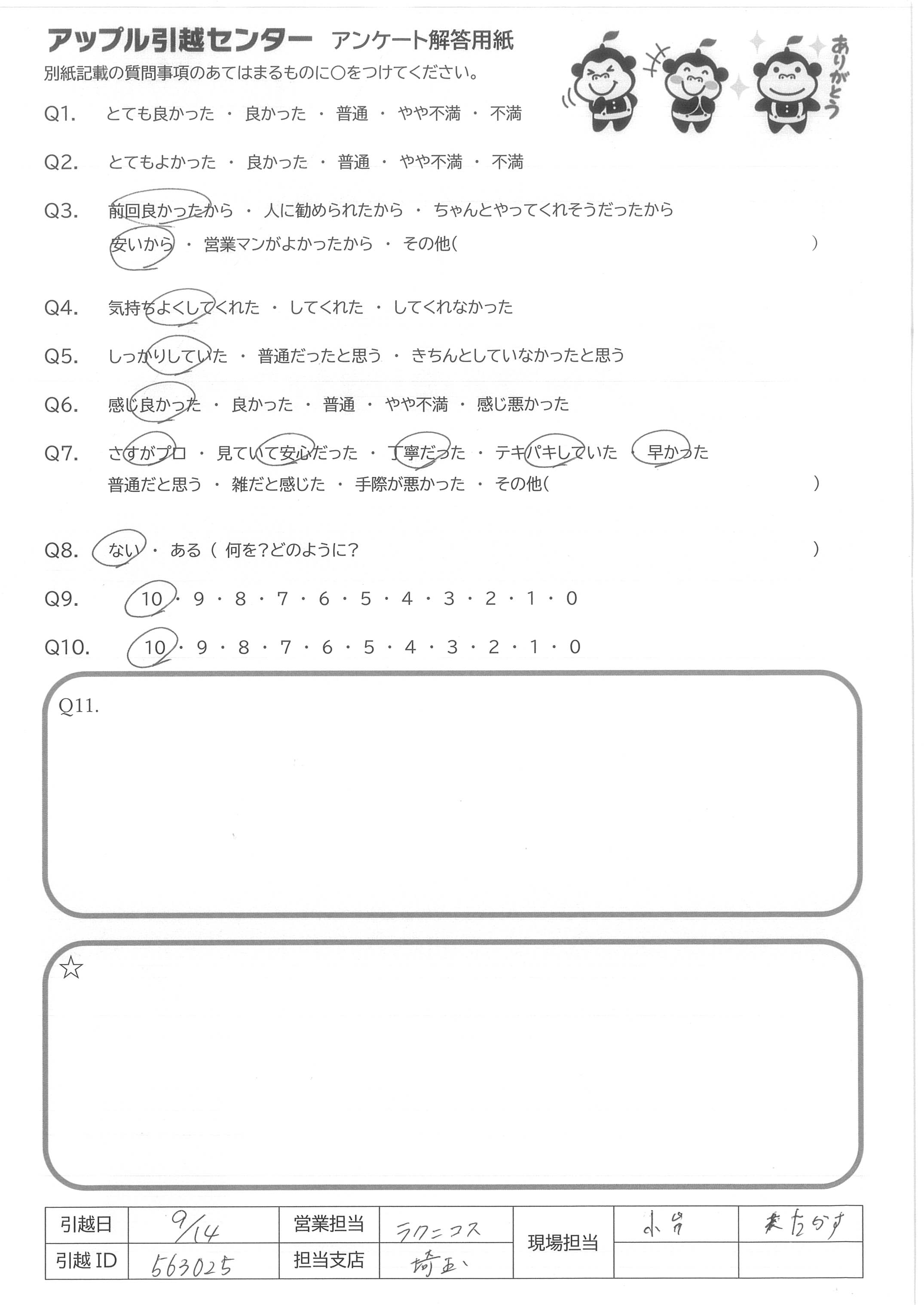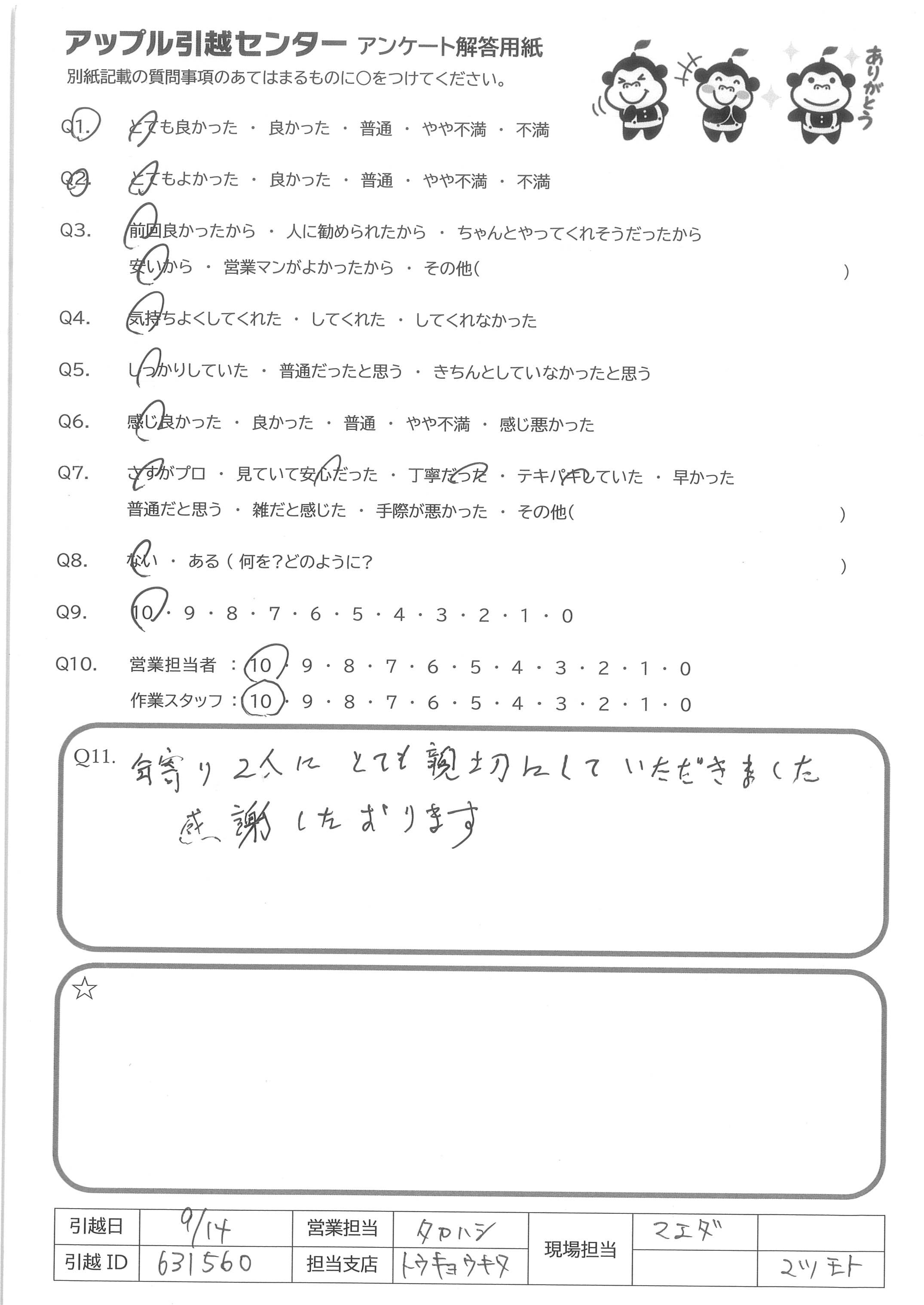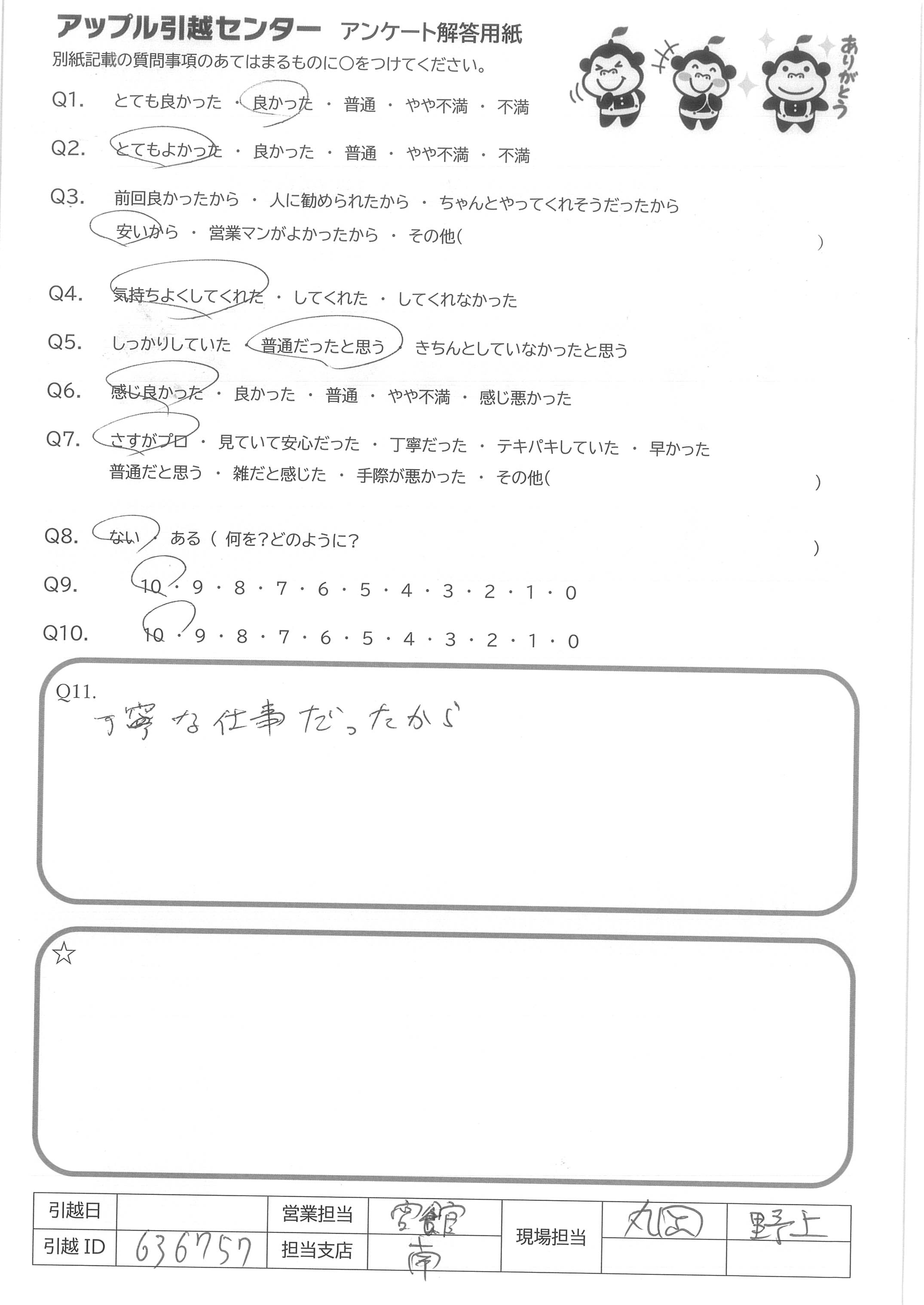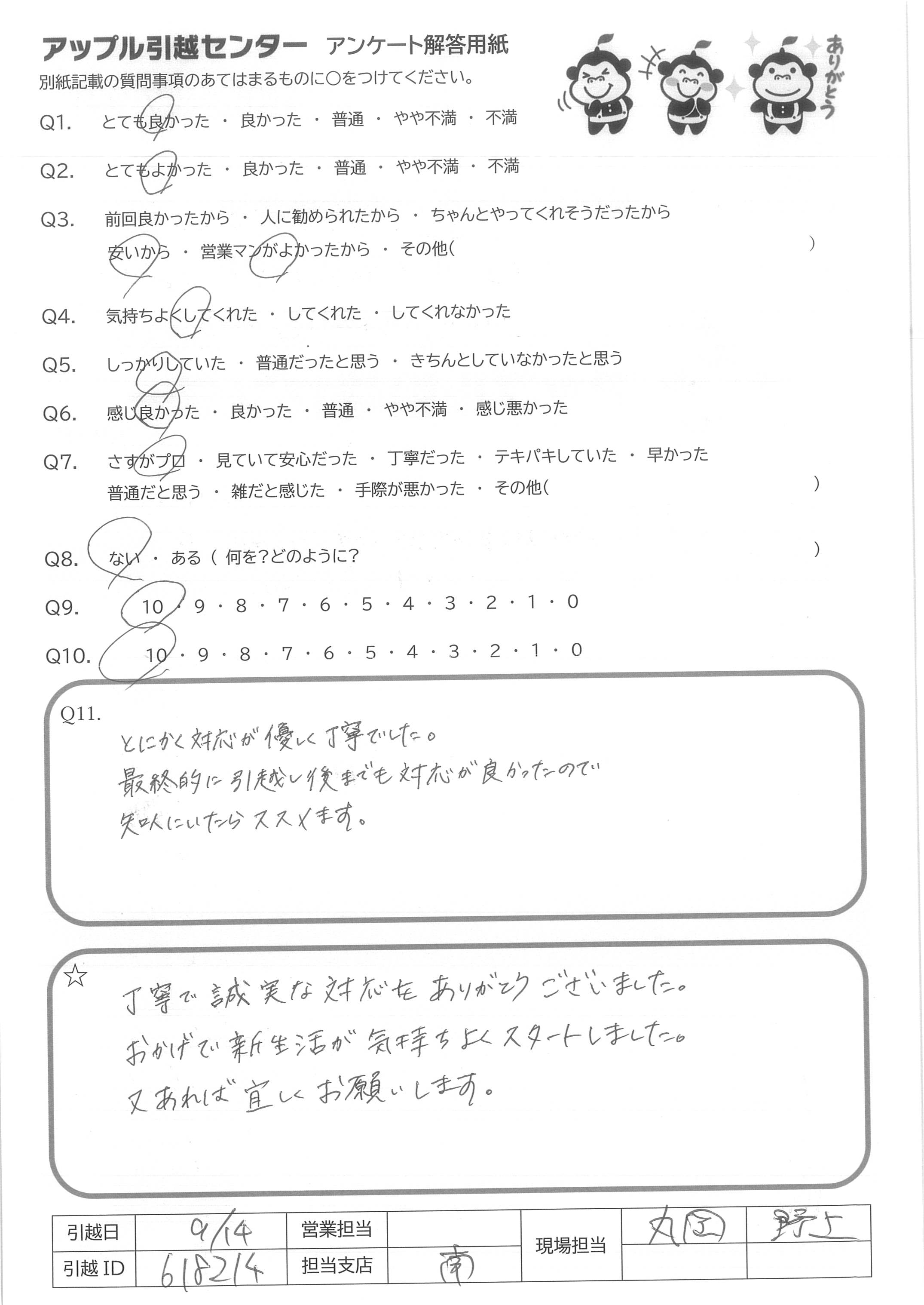 A.担当していただいたお二人含め(高瀬さん、もう一人お名前忘れてしまいすみません!)、営業の飯田さんのおかげで、気持ちよく引越しできました!本当にありがとうございます?