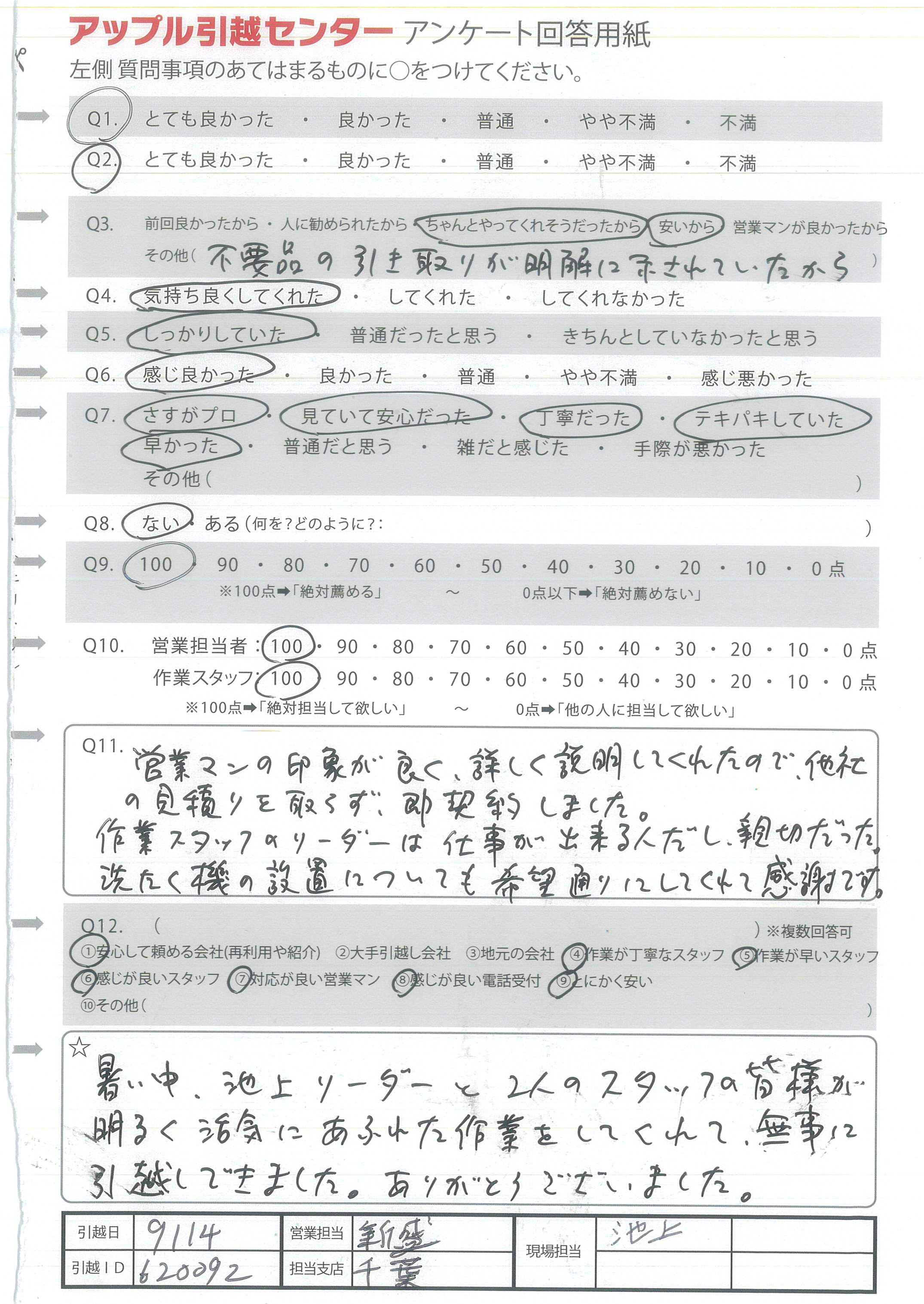 A.暑い中、池上リーダーと2人のスタッフの皆様が明るく活気にあふれた作業をしてくれて無事に引越しできました。ありがとうございました。