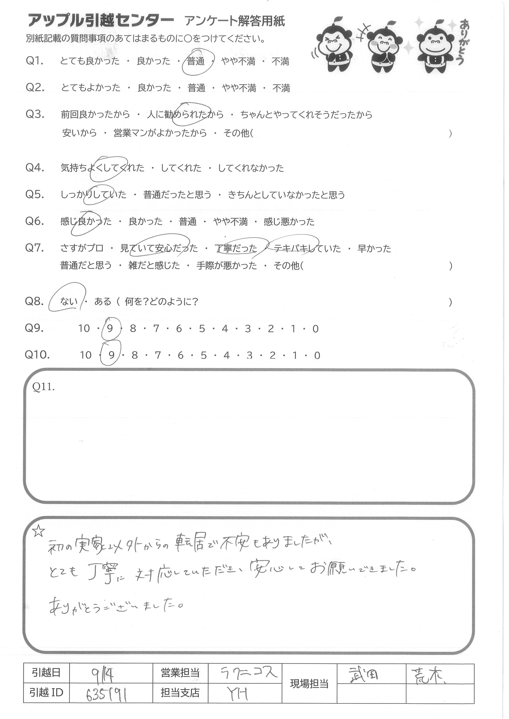 A.初の実家以外からの転居で不安もありましたが、とても丁寧に対応していただき、安心してお願いできました。ありがとうございました。